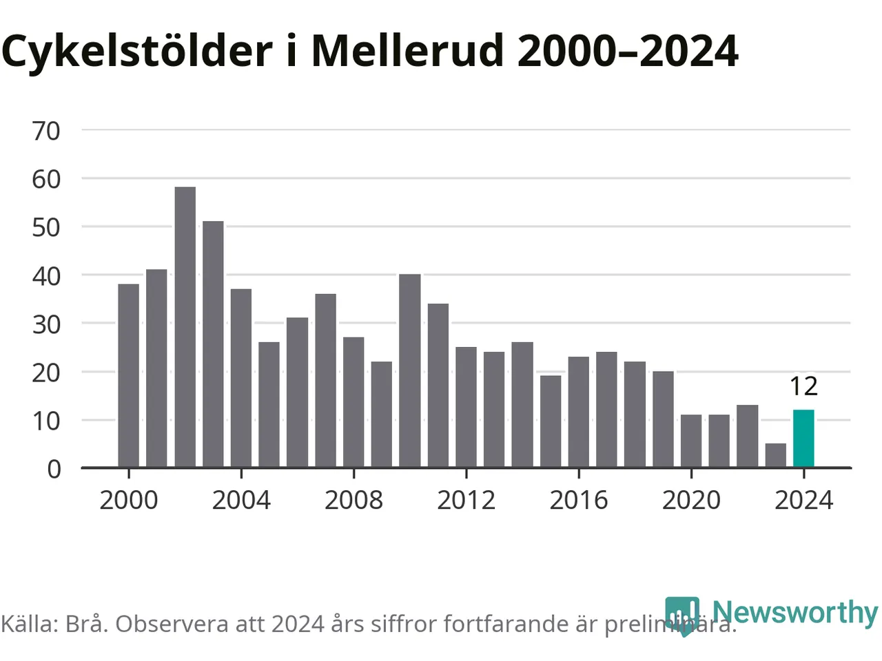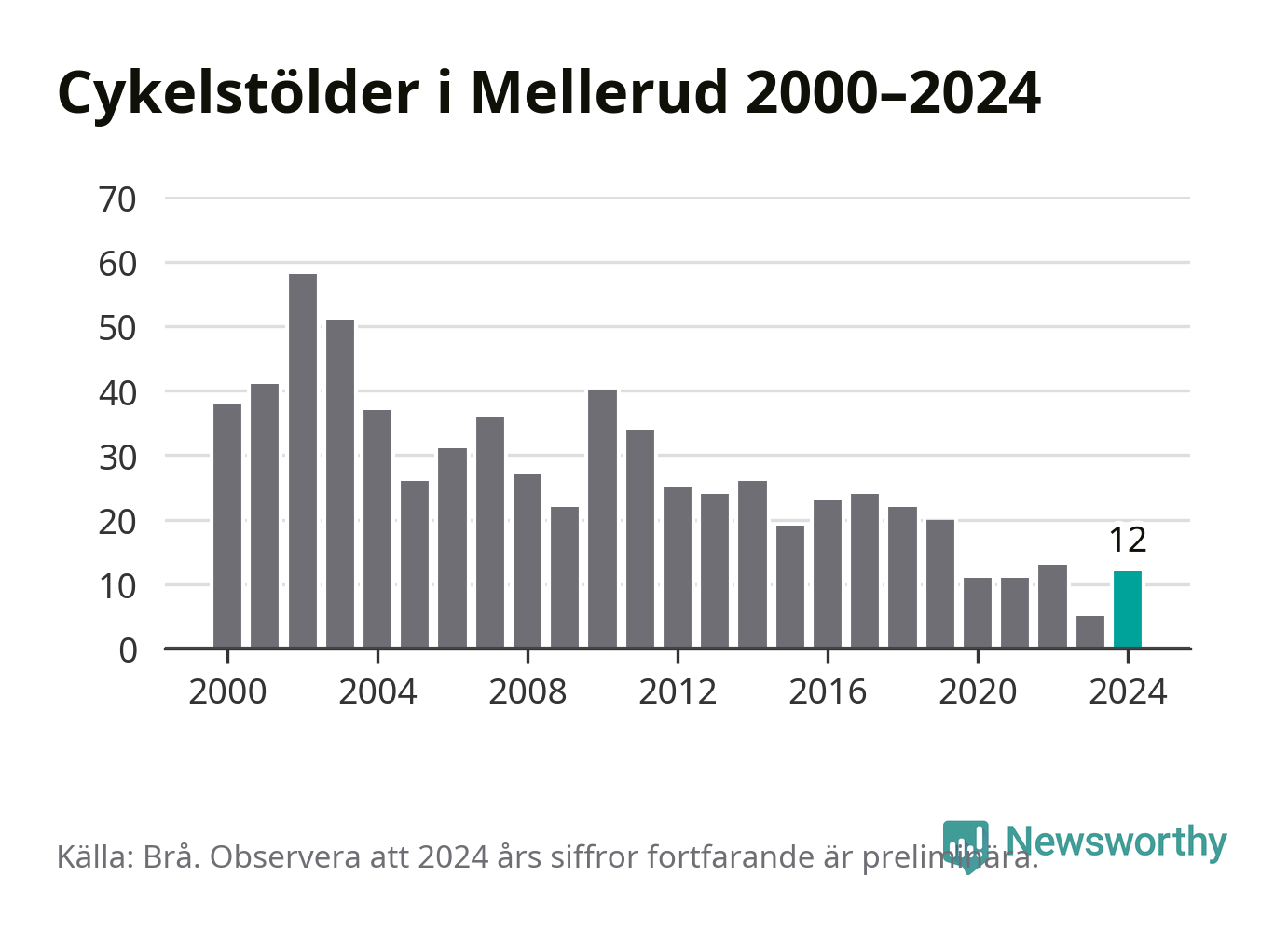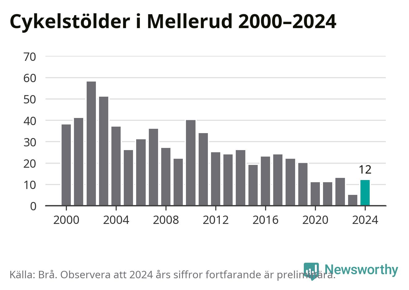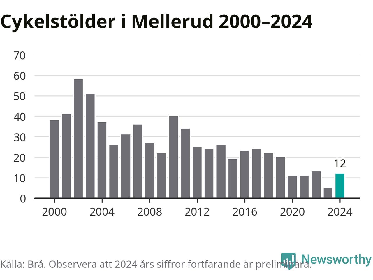I Melleruds kommun var antalet cykelstölder relativt få i en historisk kontext år 2024, även om det fortfarande är preliminära siffror. Under de senaste 25 åren har det som mest anmälts 58 cykelstölder på ett år (2002), som minst 5 stycken (2023).