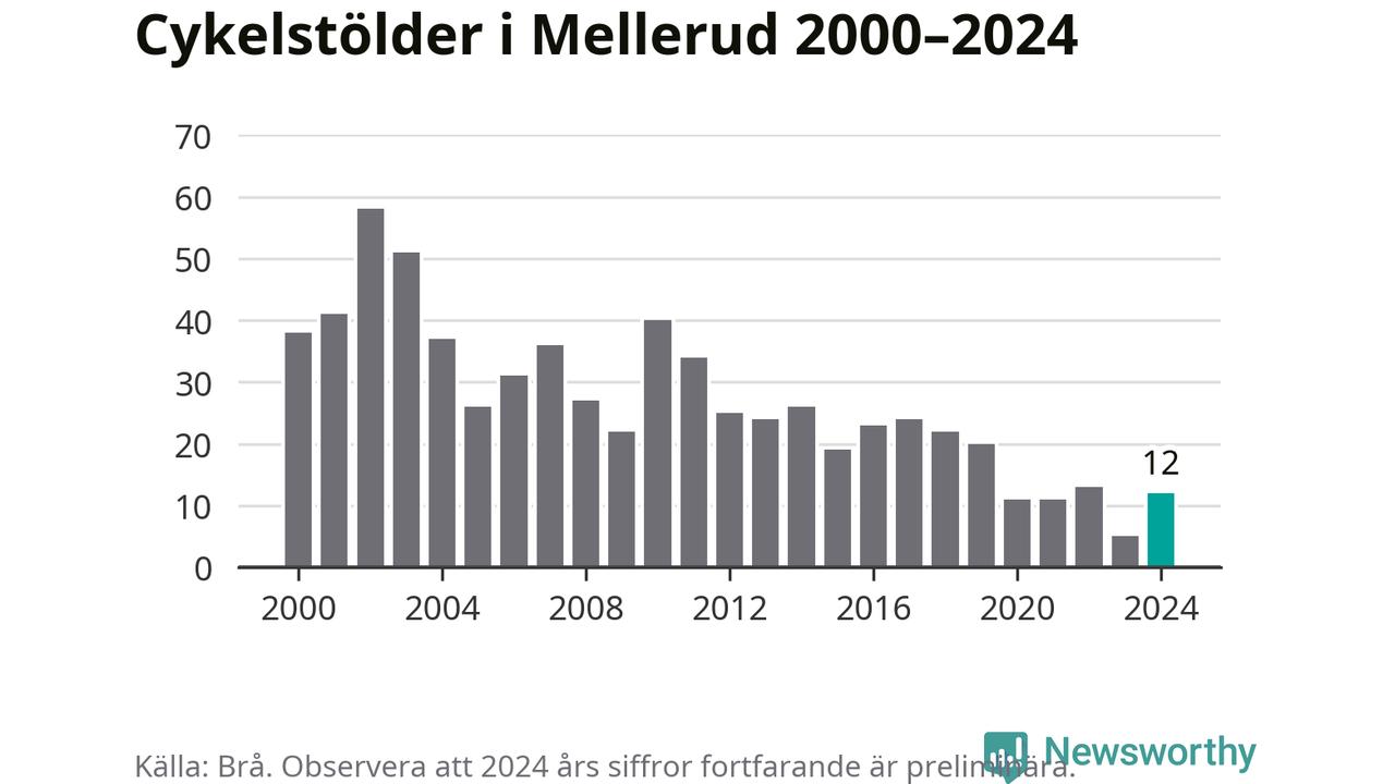 Mellerud är inte särskilt drabbat. 2024 gjordes tolv anmälningar om cykelstölder i kommunen, enligt siffror från Brottsförebyggande rådet, vilket motsvarar 1,3 anmälningar per 1 000 invånare. Det kan jämföras med 7,4 cyklar per 1 000 invånare i Lidköping, som hade flest cykelstölder per invånare i Västra Götaland.