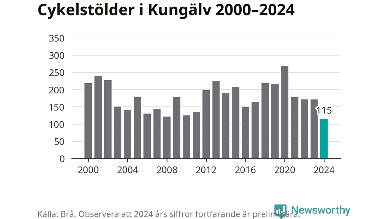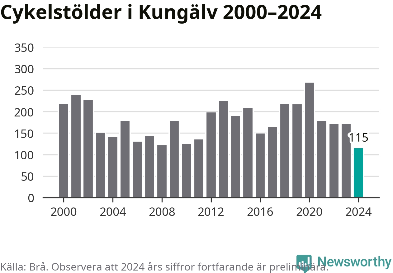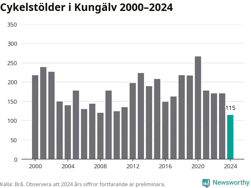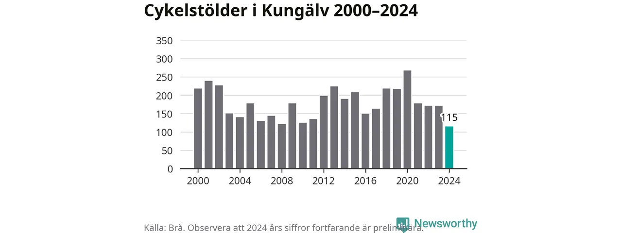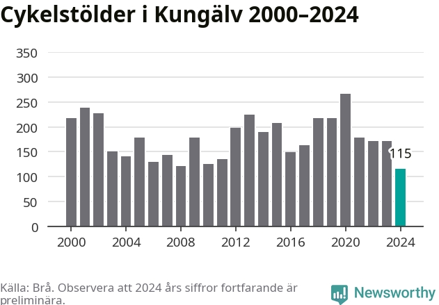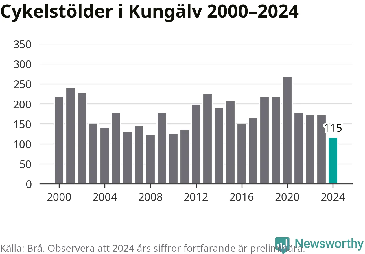 I Kungälvs kommun noterades det lägsta antalet cykelstölder under hela 2000-talet år 2024, även om det fortfarande är preliminära siffror. Under de senaste 25 åren har det som mest anmälts 267 cykelstölder på ett år (2020).