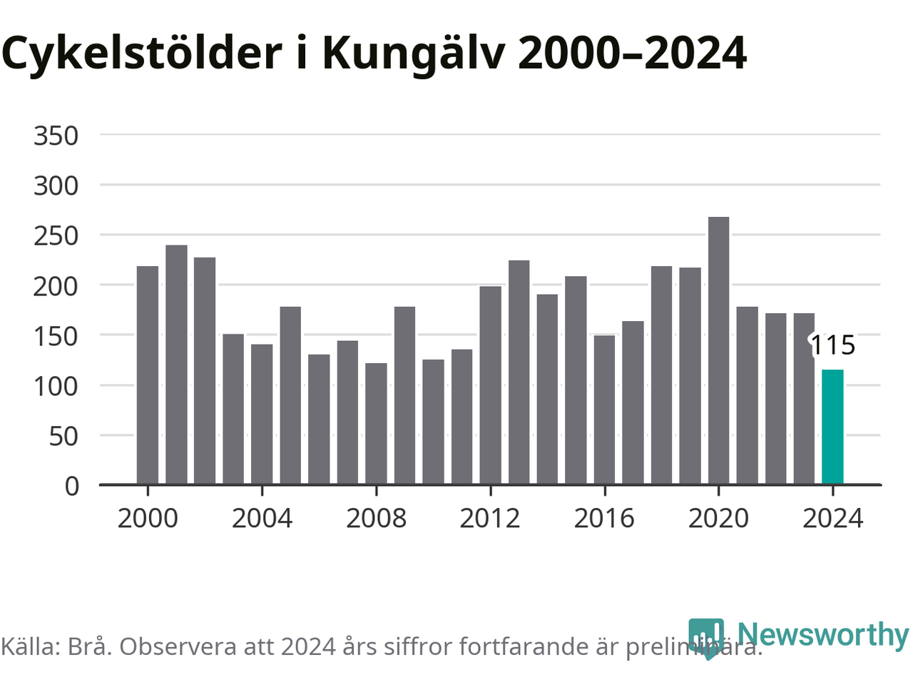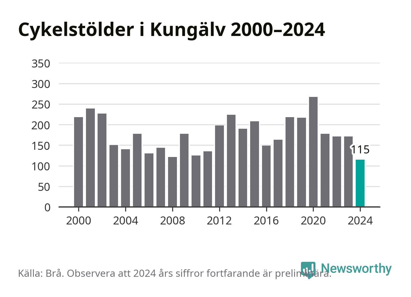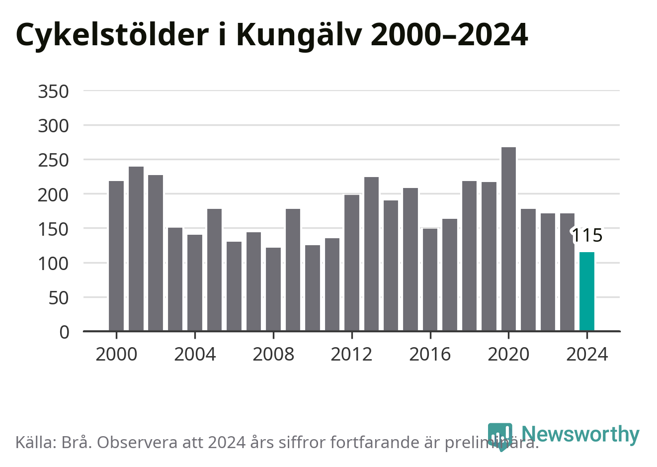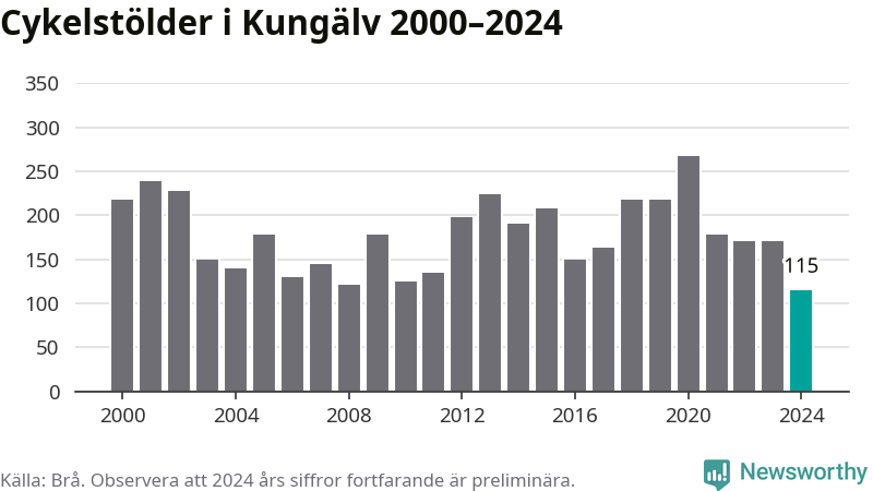 I Kungälvs kommun noterades det lägsta antalet cykelstölder under hela 2000-talet år 2024, även om det fortfarande är preliminära siffror. Under de senaste 25 åren har det som mest anmälts 267 cykelstölder på ett år (2020).