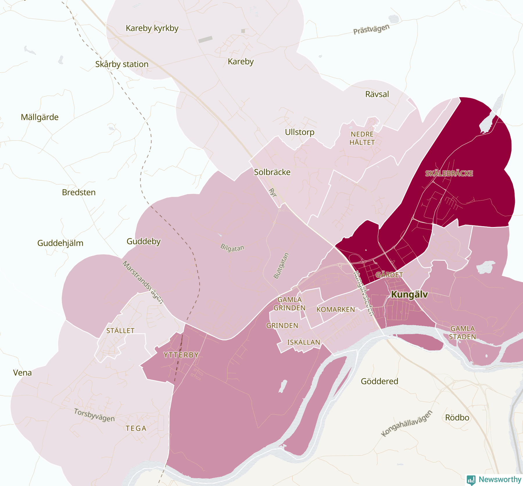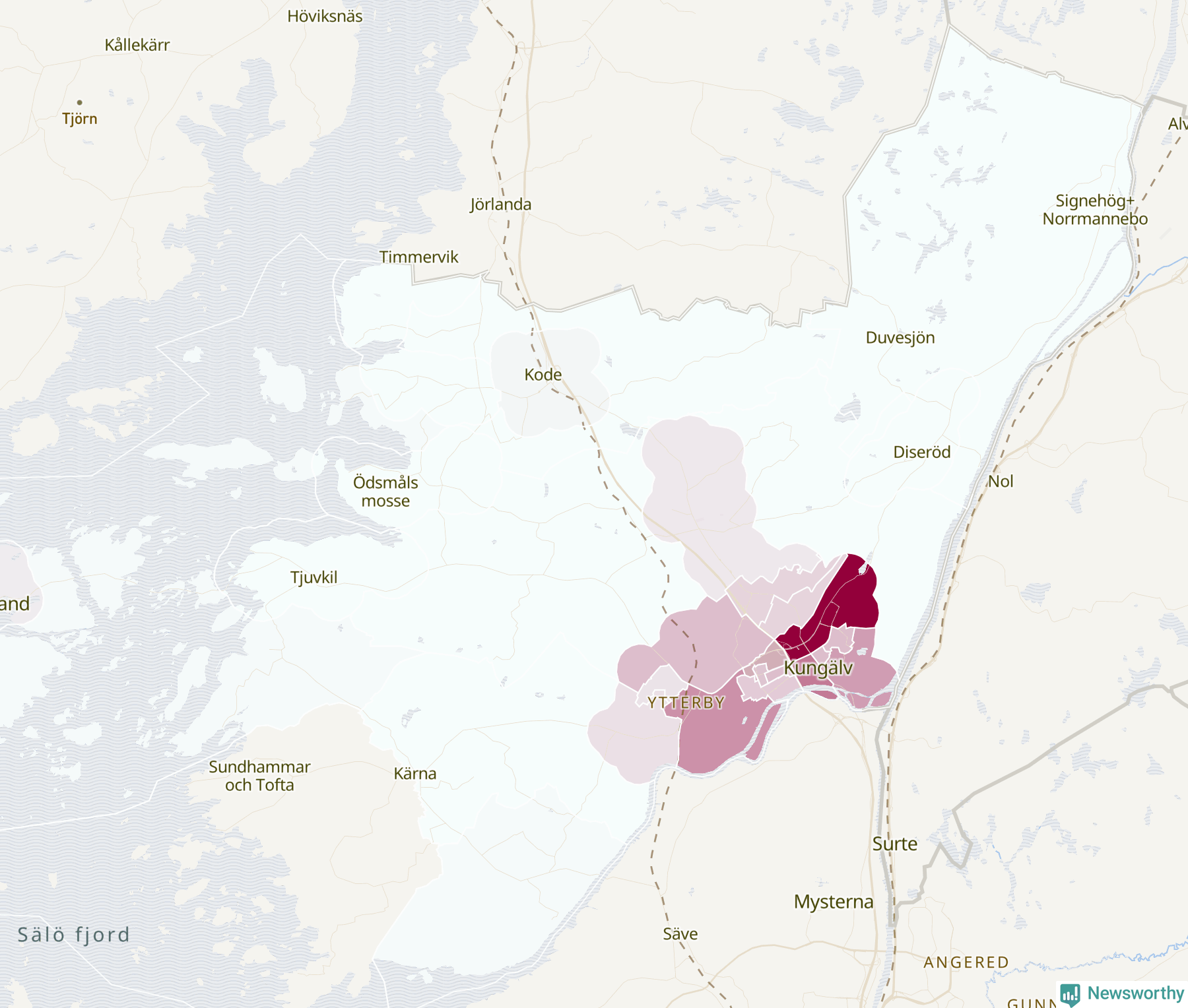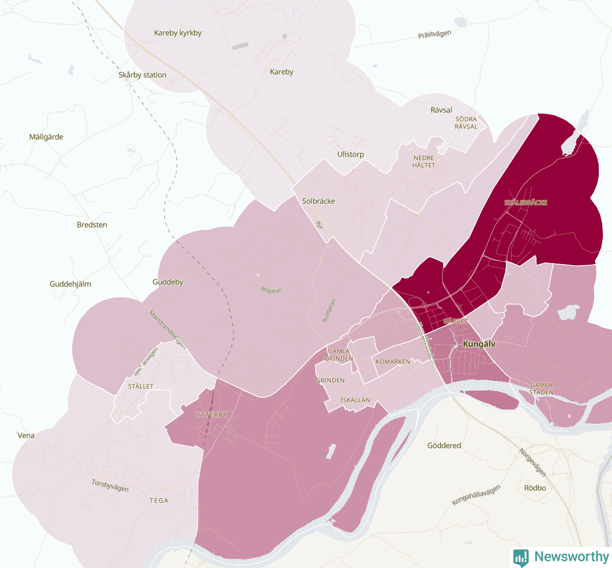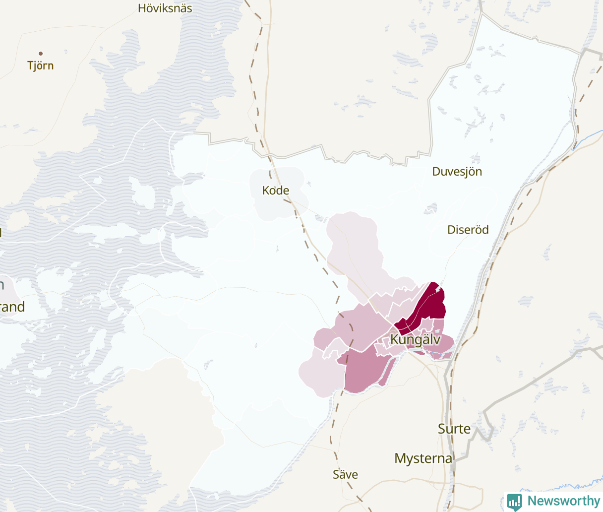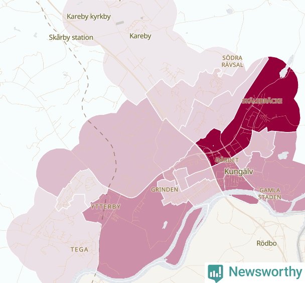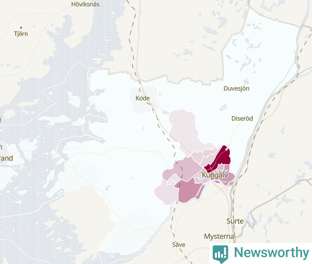 Men alla delar av Kungälv är inte lika hårt drabbade. Det visar data för de senaste fem åren, som Newsworthy begärt ut från polisen. De anmälda stölderna har kopplats till SCB:s 30 statistiska områden i kommunen. I ett område finns inga cykelstölder registrerade, men i de övriga rör det sig om mellan en handfull och drygt 100 anmälda stölder per område.