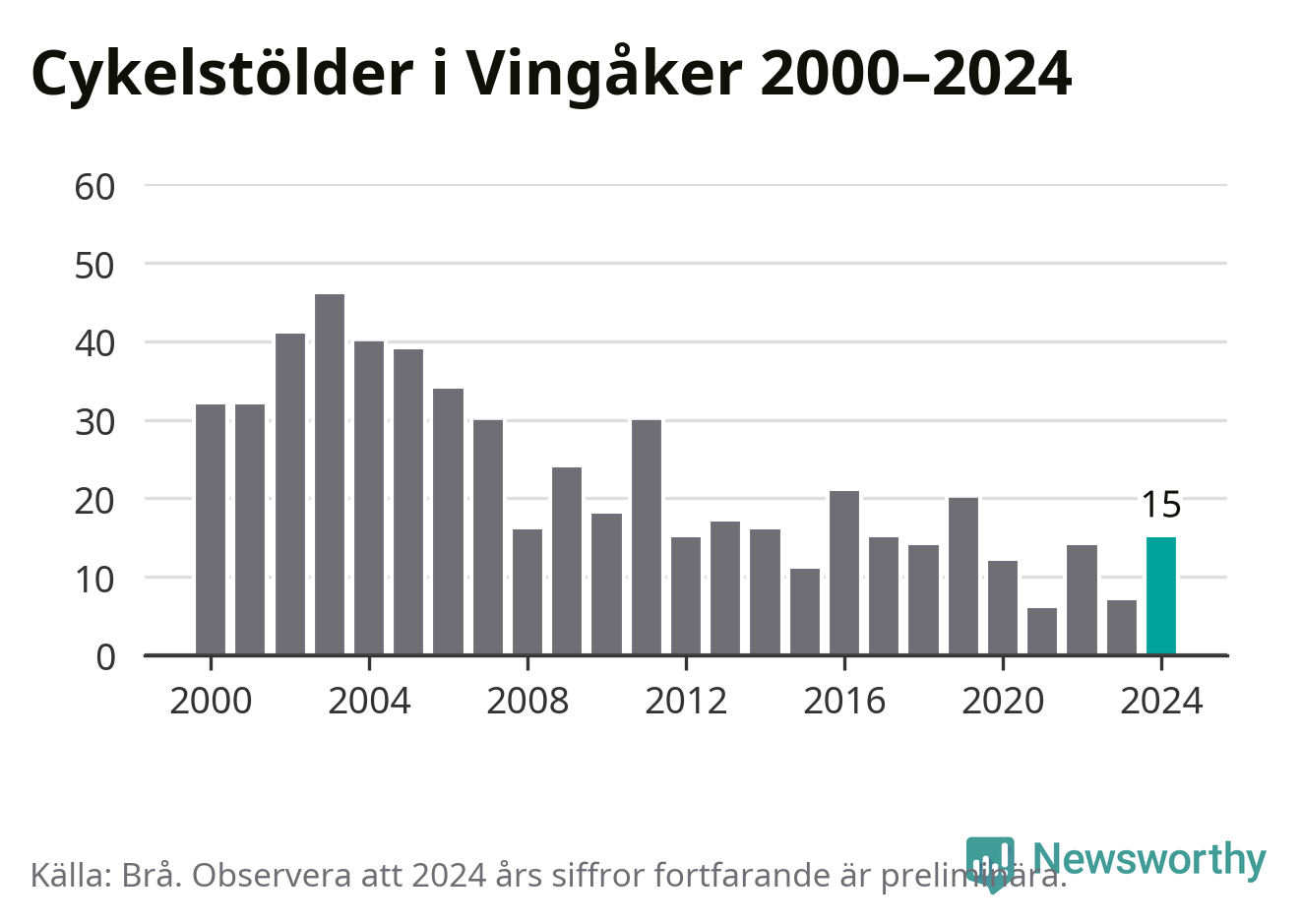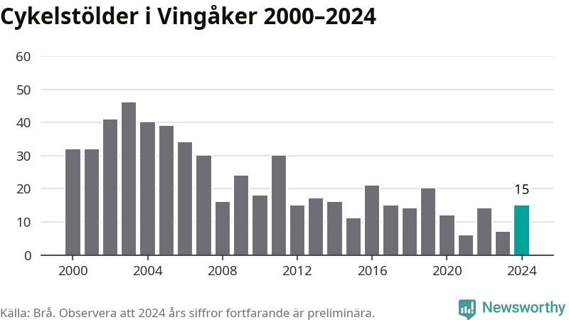 I Vingåkers kommun sticker antalet cykelstölder 2024 inte ut i en historisk kontext. Under de senaste 25 åren har det som mest anmälts 46 cykelstölder på ett år (2003), som minst 6 stycken (2021).