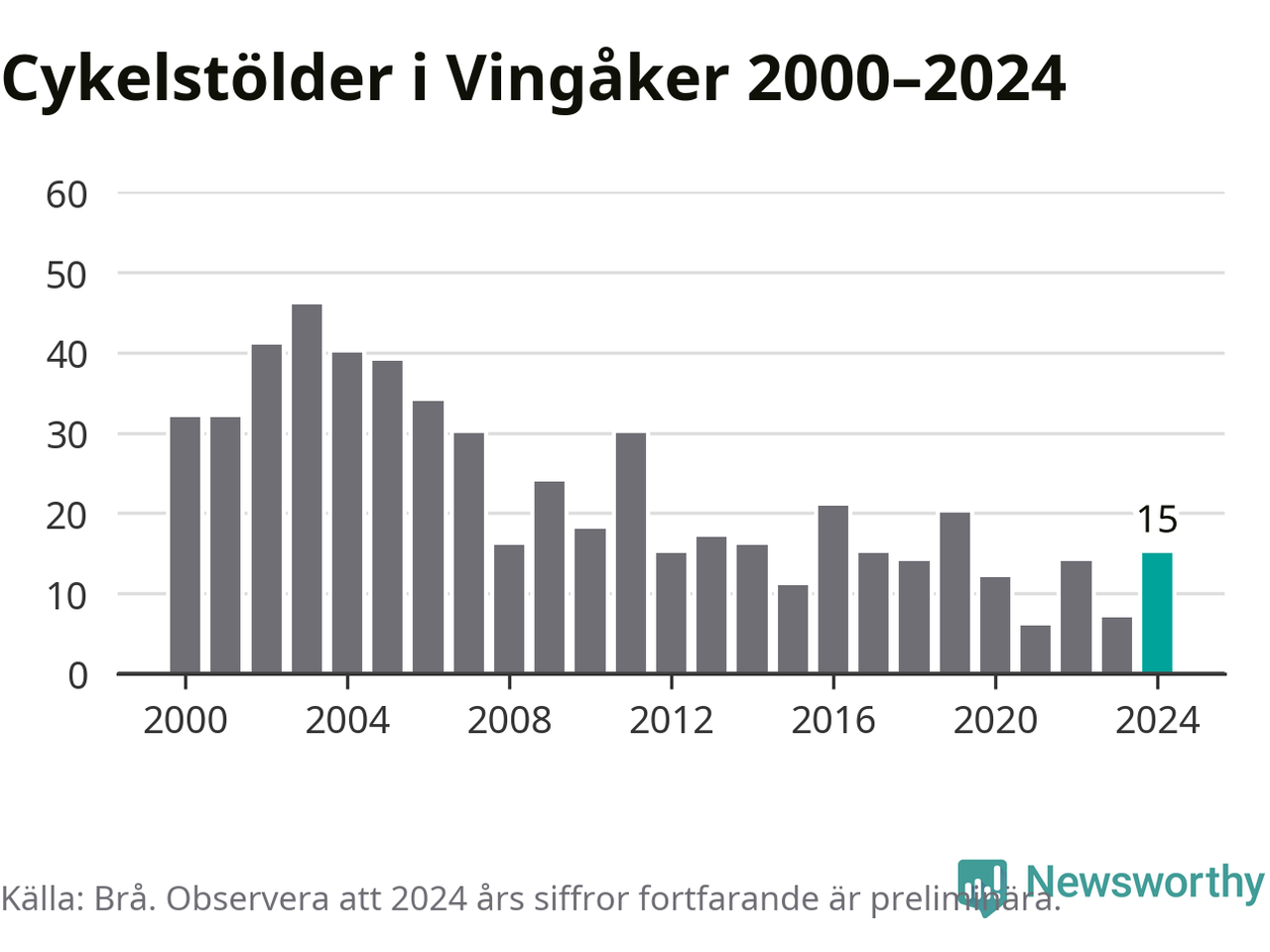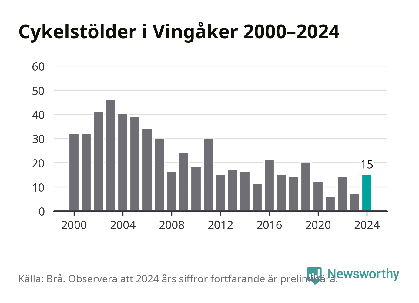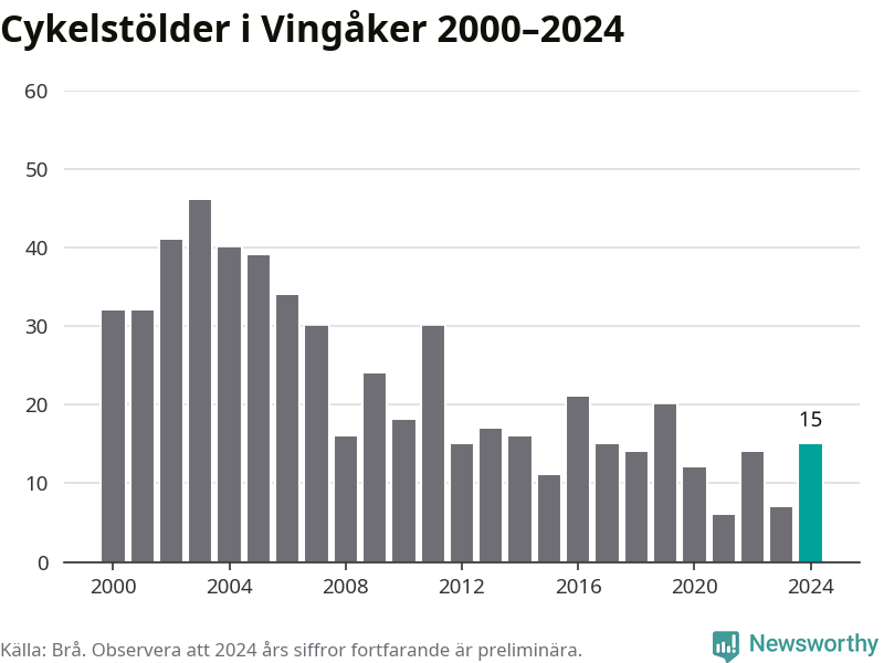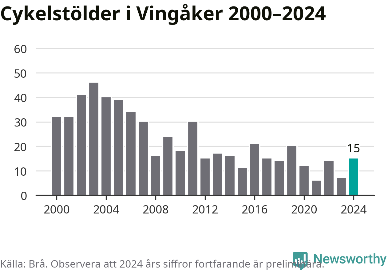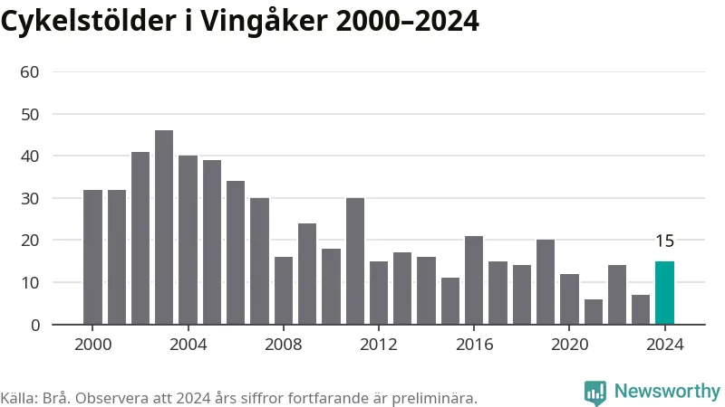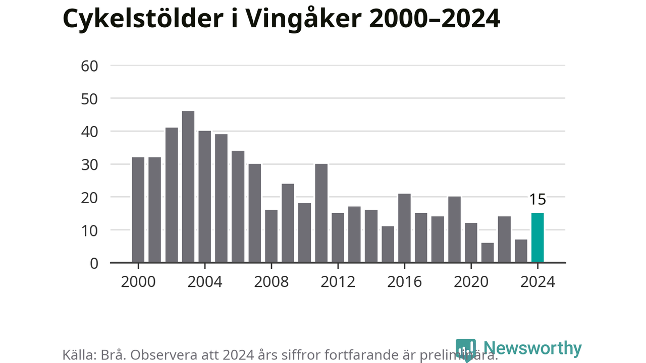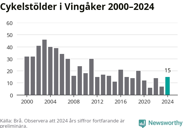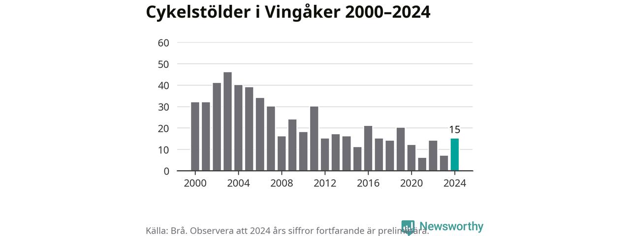 Vingåker är inte särskilt drabbat. 2024 gjordes 15 anmälningar om cykelstölder i kommunen, enligt siffror från Brottsförebyggande rådet, vilket motsvarar 1,7 anmälningar per 1 000 invånare. Det kan jämföras med 5,5 cyklar per 1 000 invånare i Nyköping, som hade flest cykelstölder per invånare i Södermanland.