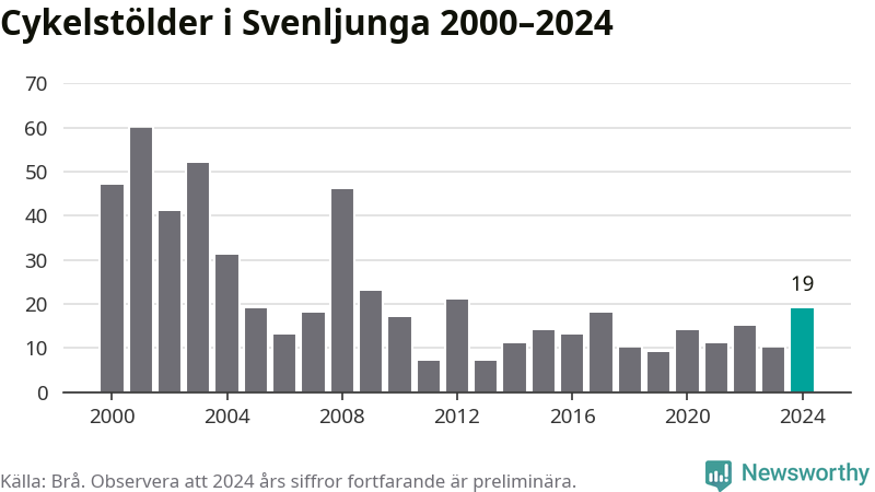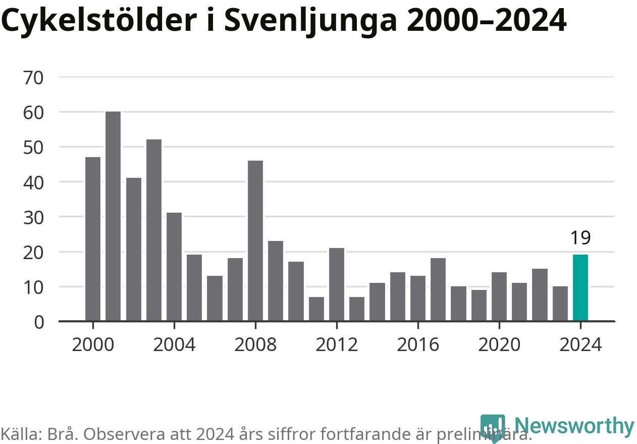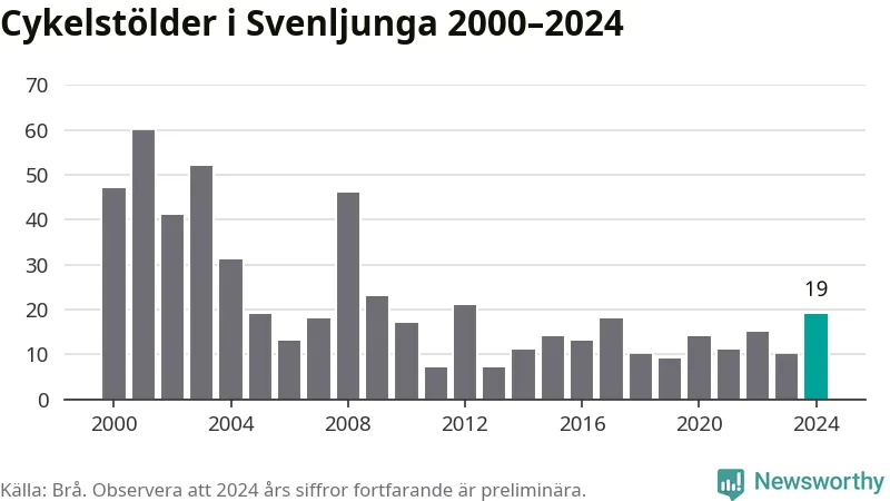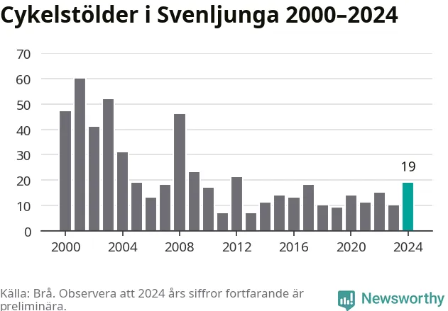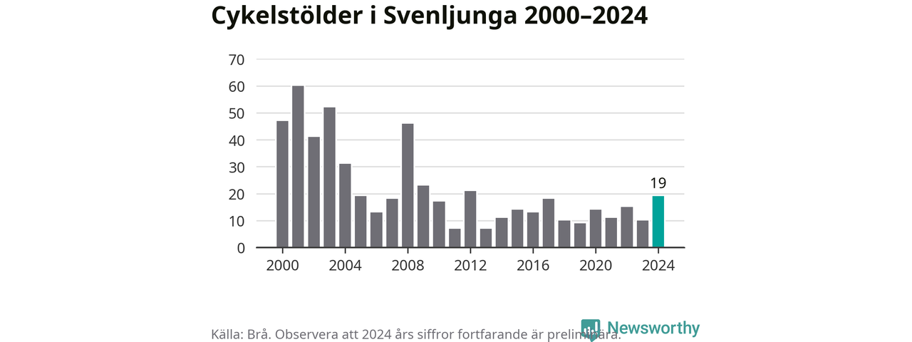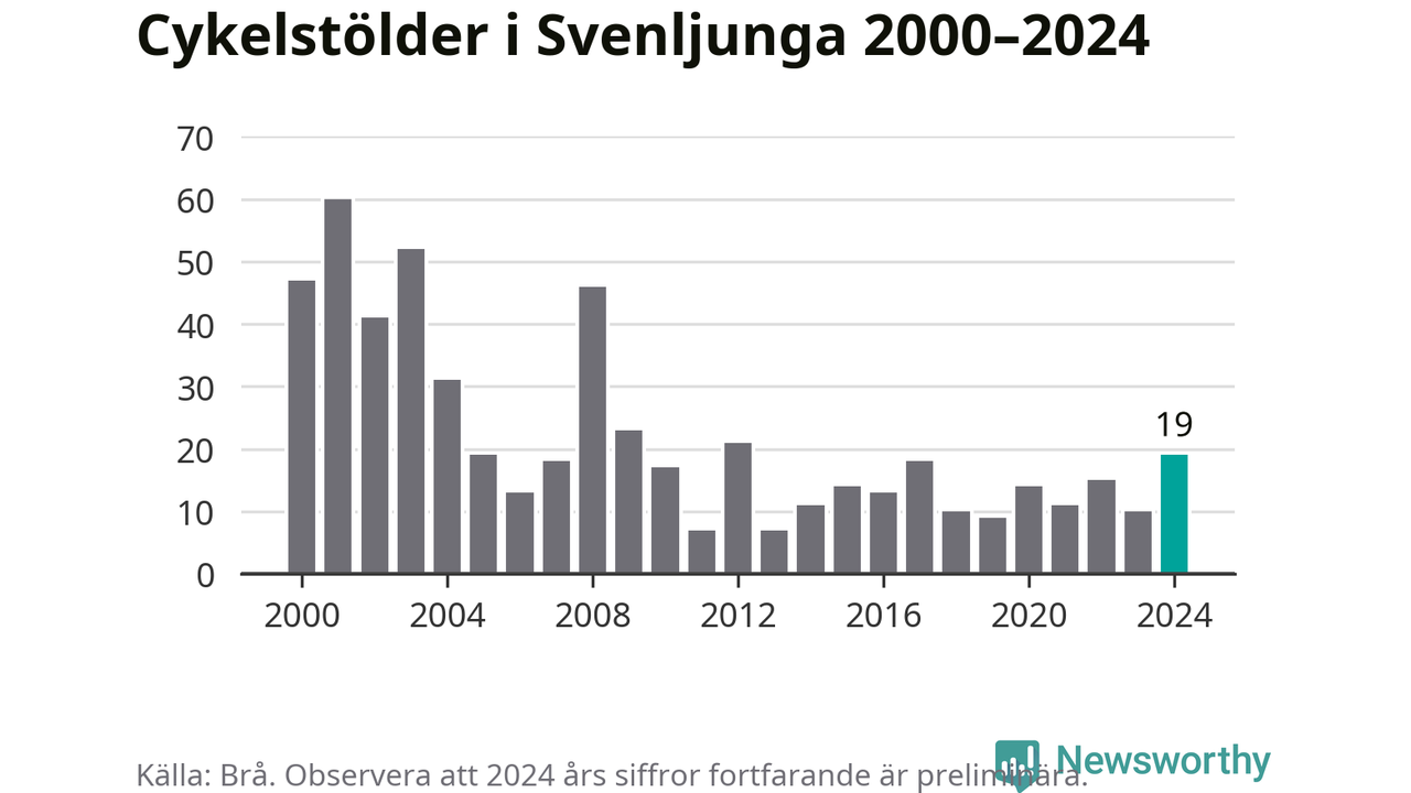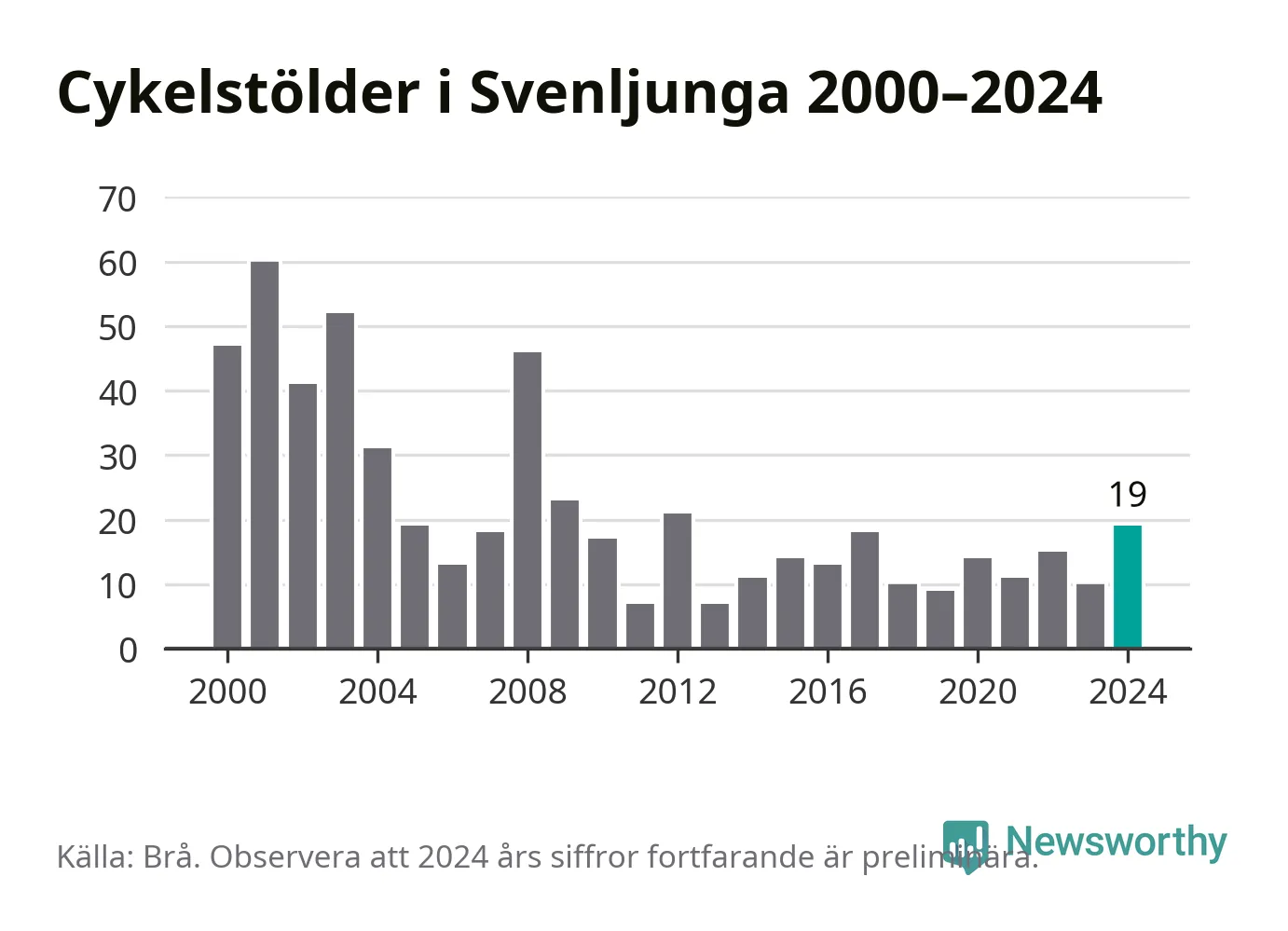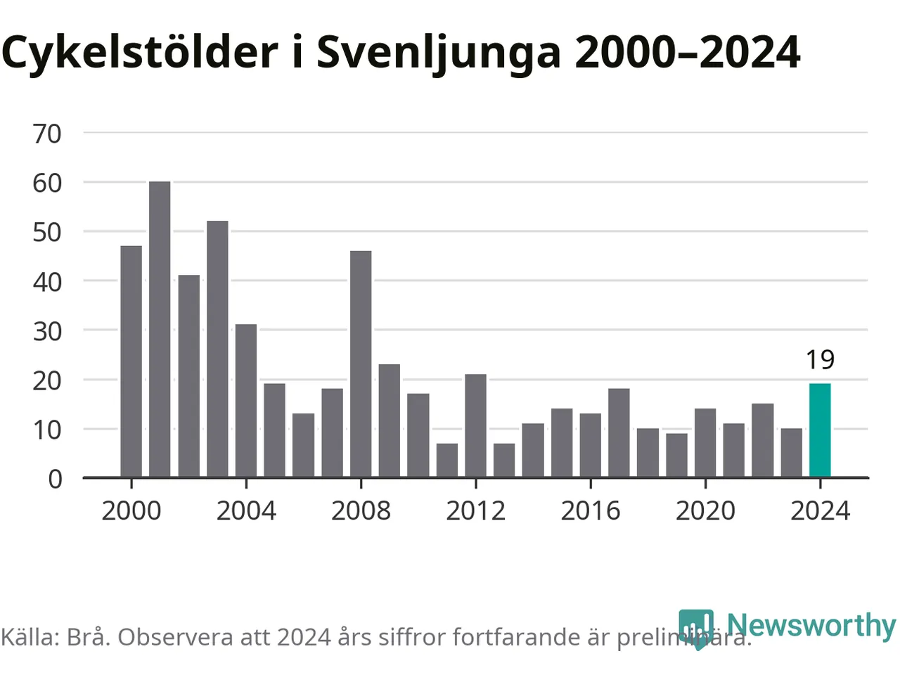 Svenljunga är inte särskilt drabbat. 2024 gjordes 19 anmälningar om cykelstölder i kommunen, enligt siffror från Brottsförebyggande rådet, vilket motsvarar 1,8 anmälningar per 1 000 invånare. Det kan jämföras med 7,4 cyklar per 1 000 invånare i Lidköping, som hade flest cykelstölder per invånare i Västra Götaland.