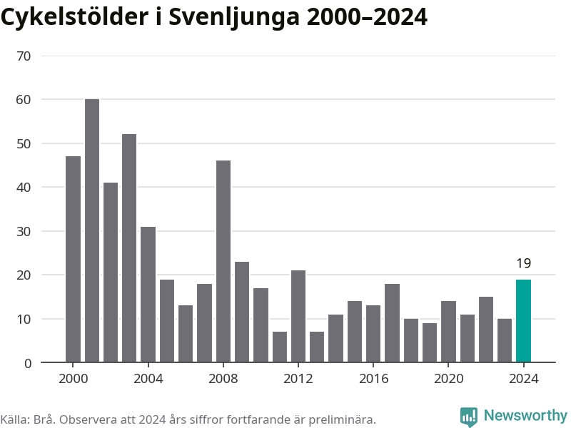 I Svenljunga kommun sticker antalet cykelstölder 2024 inte ut i en historisk kontext. Under de senaste 25 åren har det som mest anmälts 60 cykelstölder på ett år (2001), som minst 7 stycken (2011 och 2013).