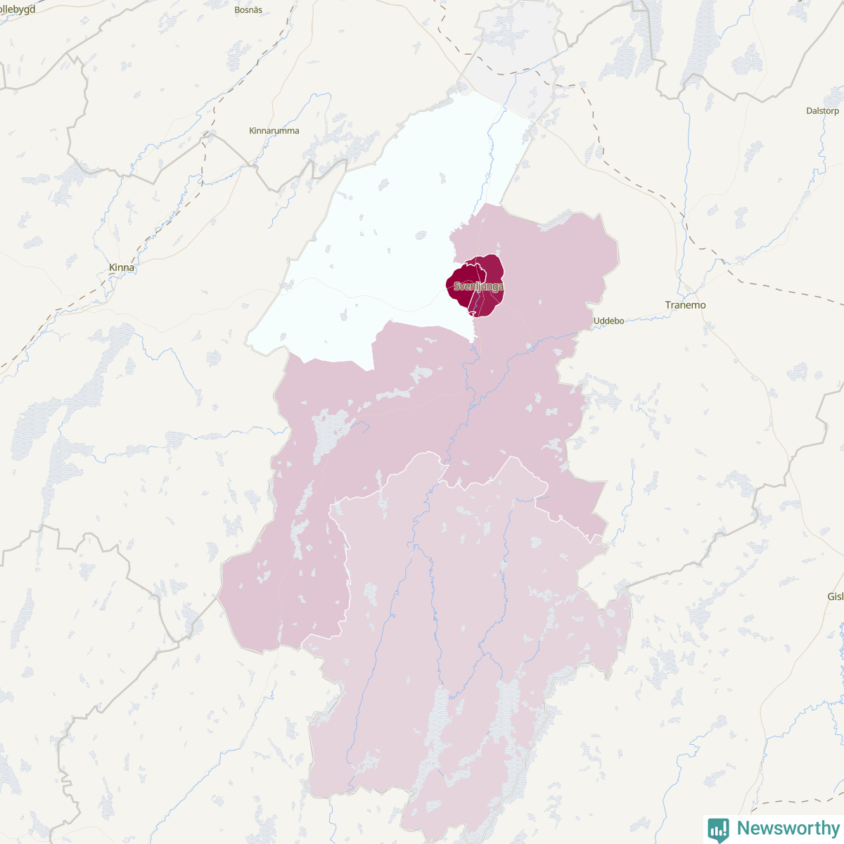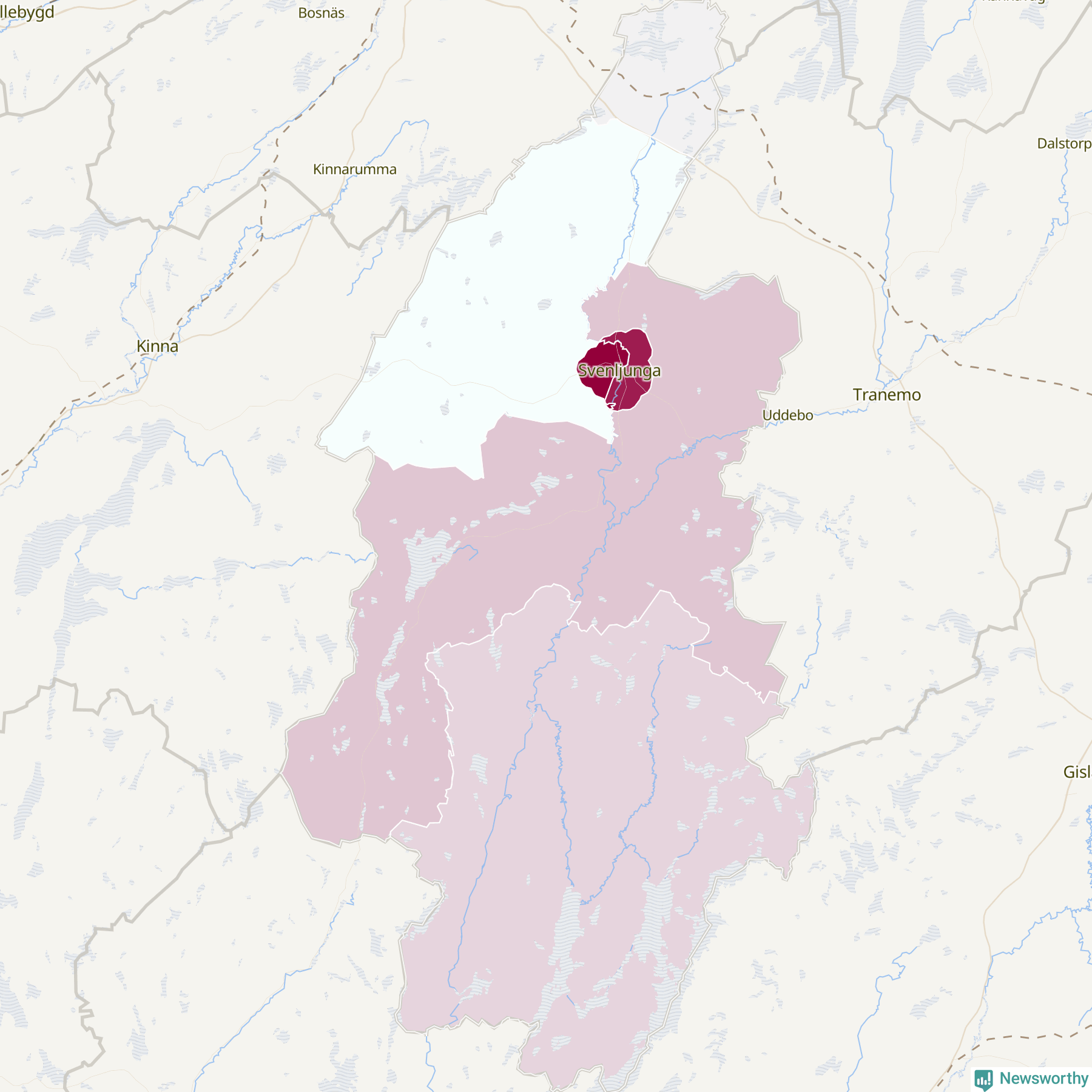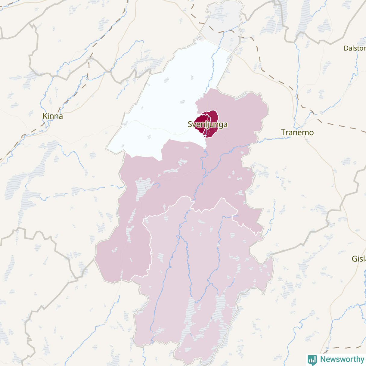Skillnaderna mellan olika områden i Svenljunga är relativt små. Det visar data för de senaste fem åren, som Newsworthy begärt ut från polisen. De anmälda stölderna har kopplats till SCB:s sex statistiska områden i kommunen. Det rör sig om mellan en handfull och ett tjugotal anmälda stölder per område.