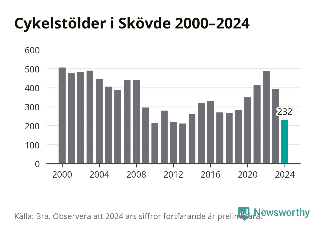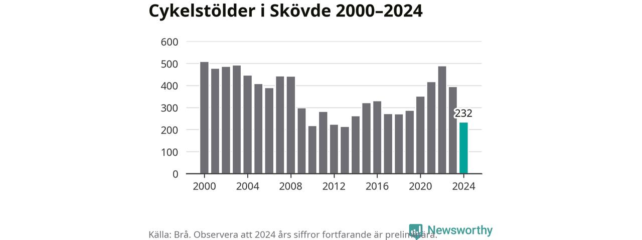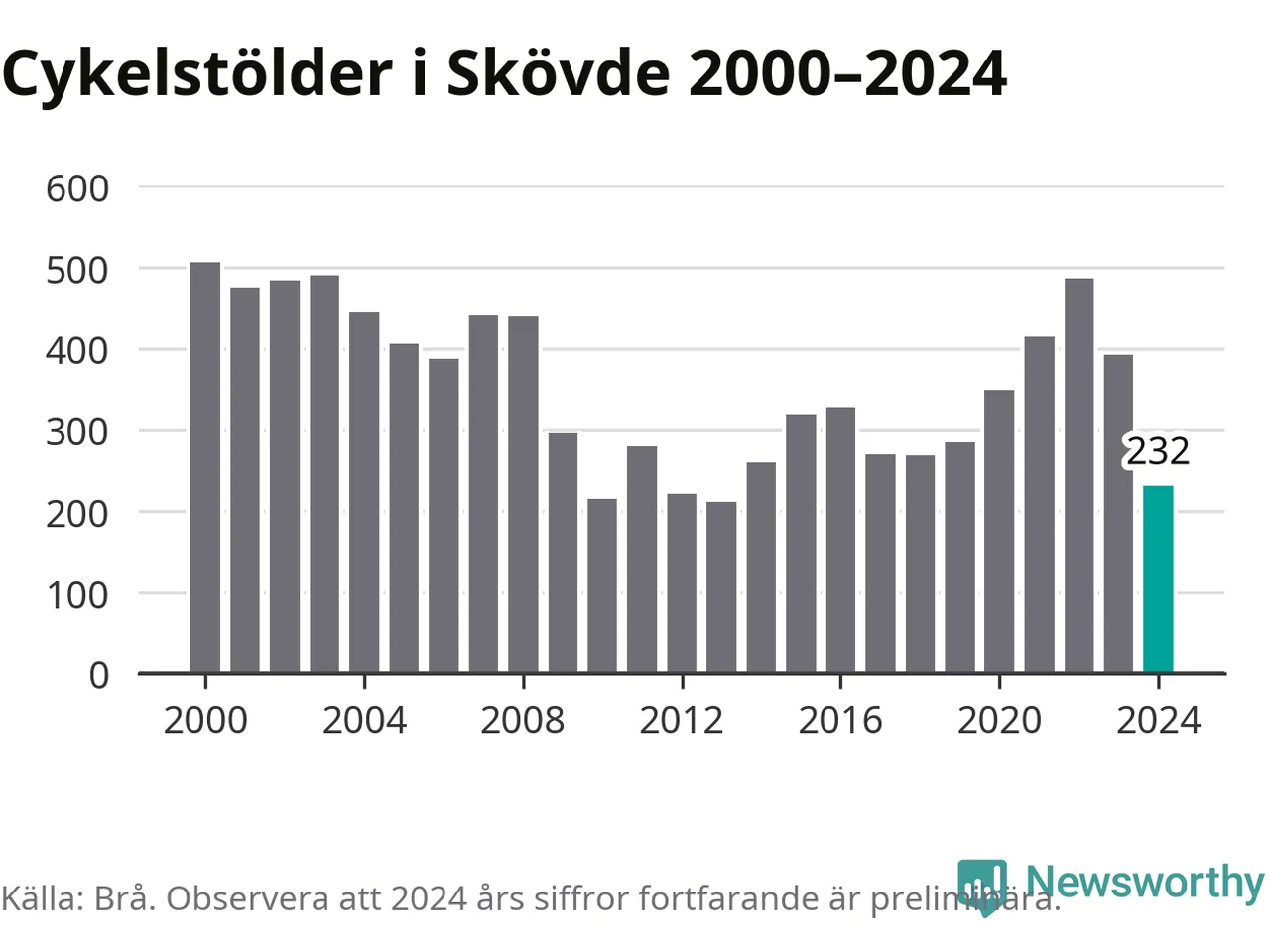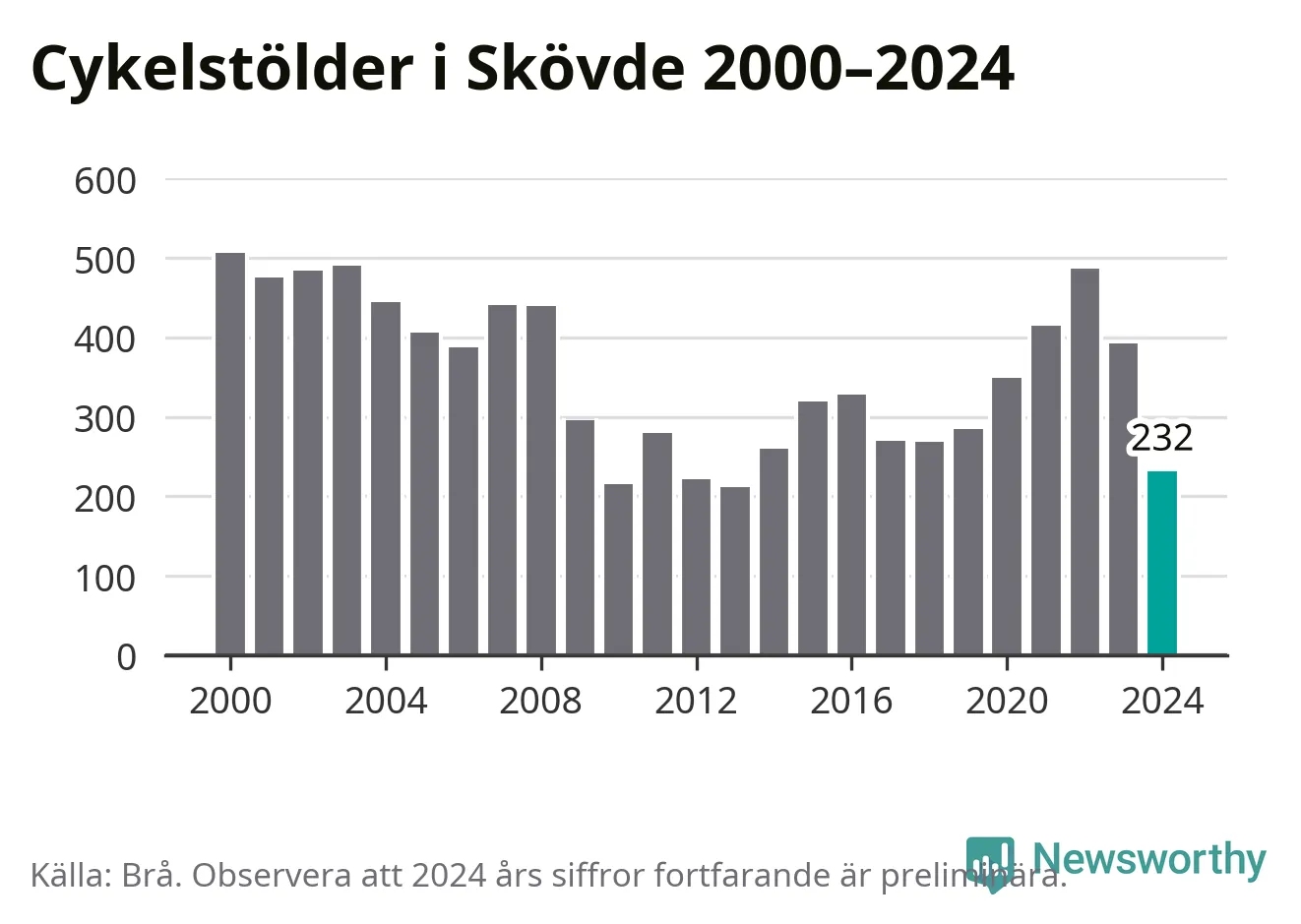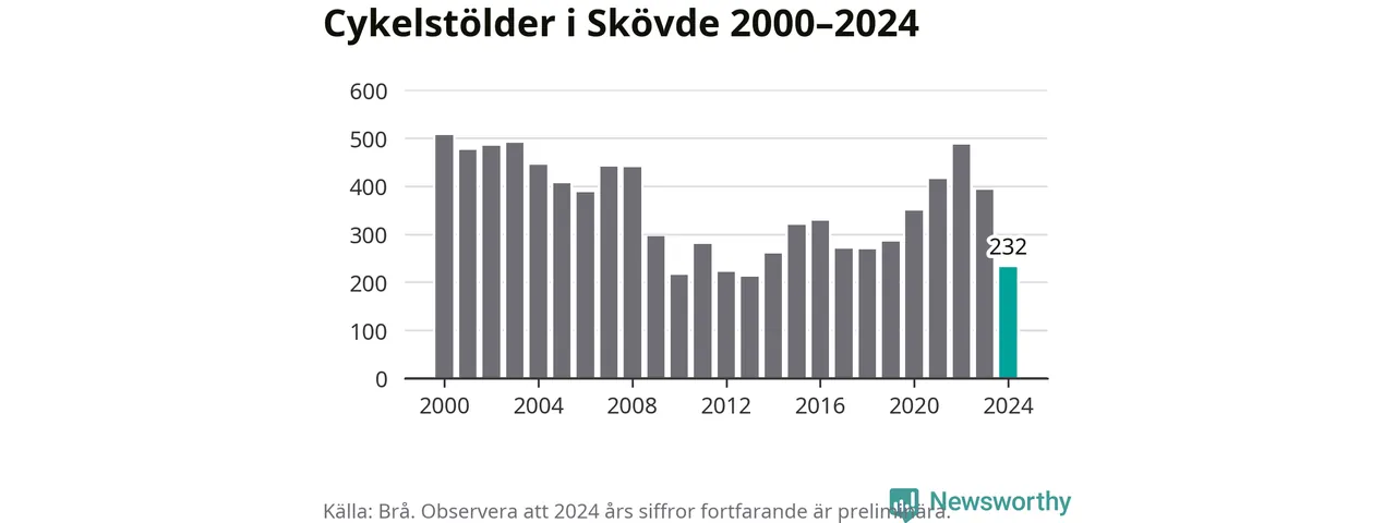 I Skövde kommun var antalet cykelstölder relativt få i en historisk kontext år 2024, även om det fortfarande är preliminära siffror. Under de senaste 25 åren har det som mest anmälts 507 cykelstölder på ett år (2000), som minst 212 stycken (2013).