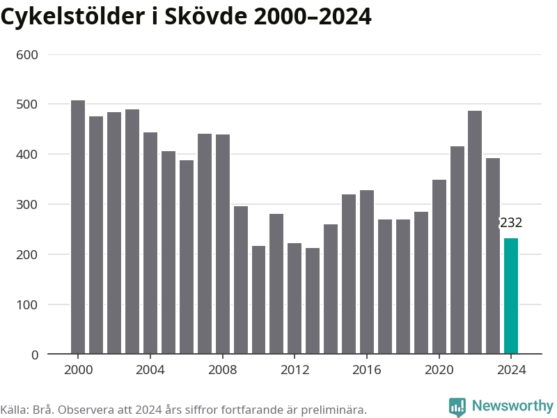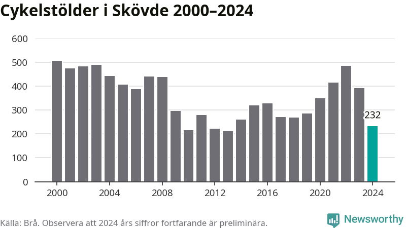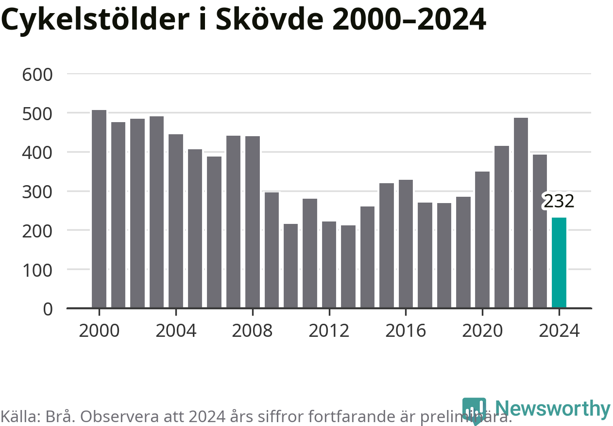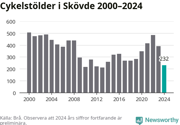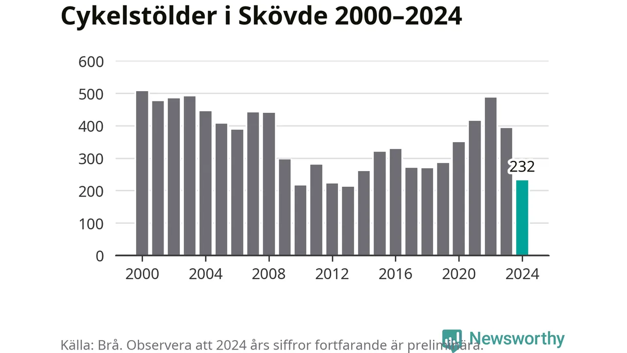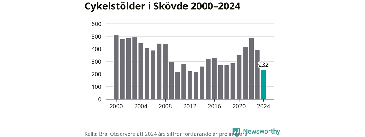 I Skövde kommun var antalet cykelstölder relativt få i en historisk kontext år 2024, även om det fortfarande är preliminära siffror. Under de senaste 25 åren har det som mest anmälts 507 cykelstölder på ett år (2000), som minst 212 stycken (2013).