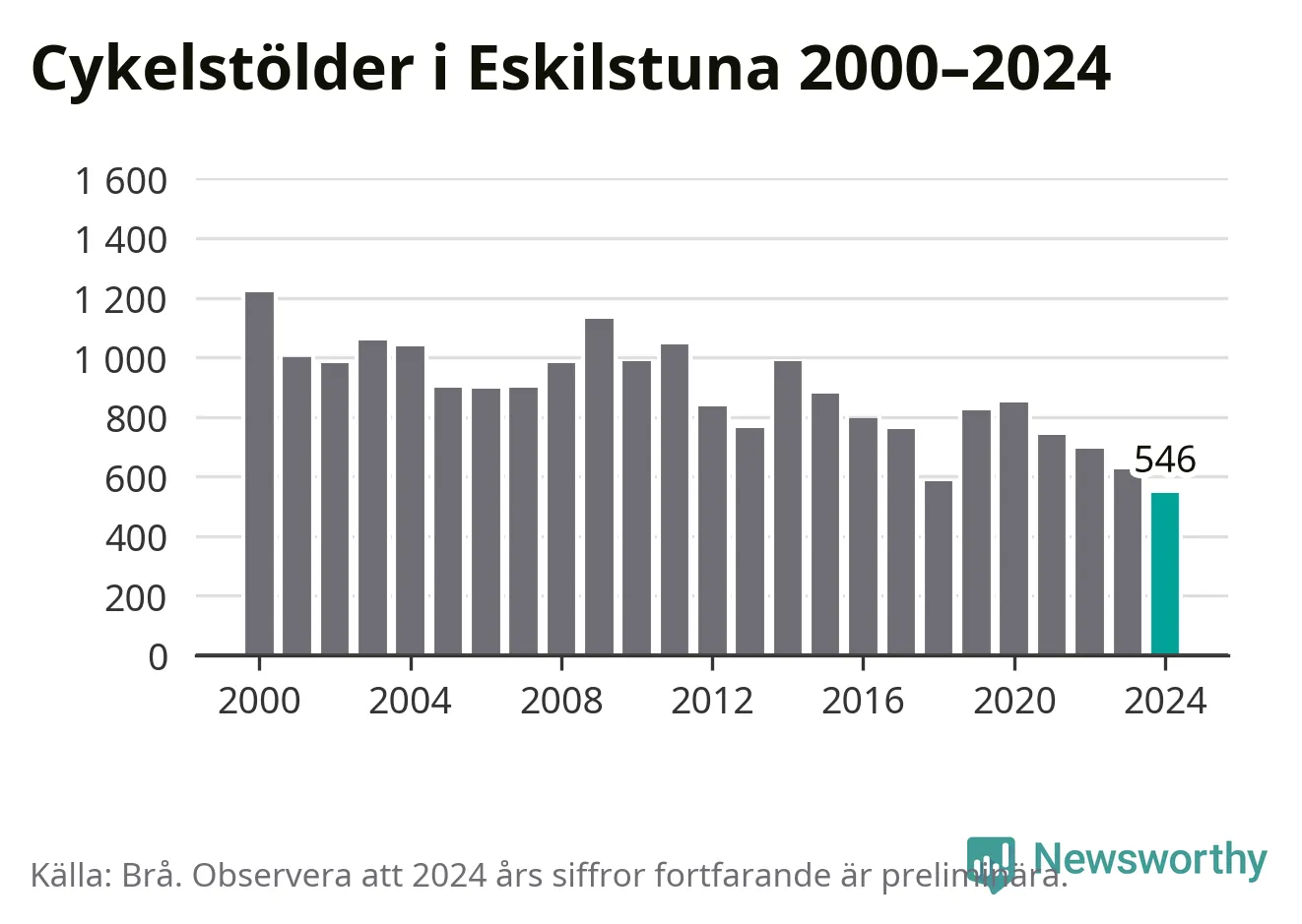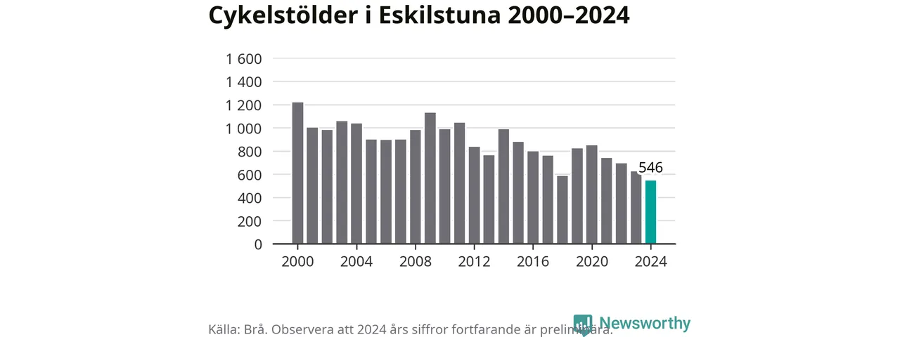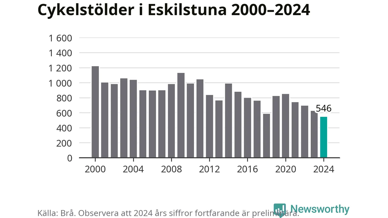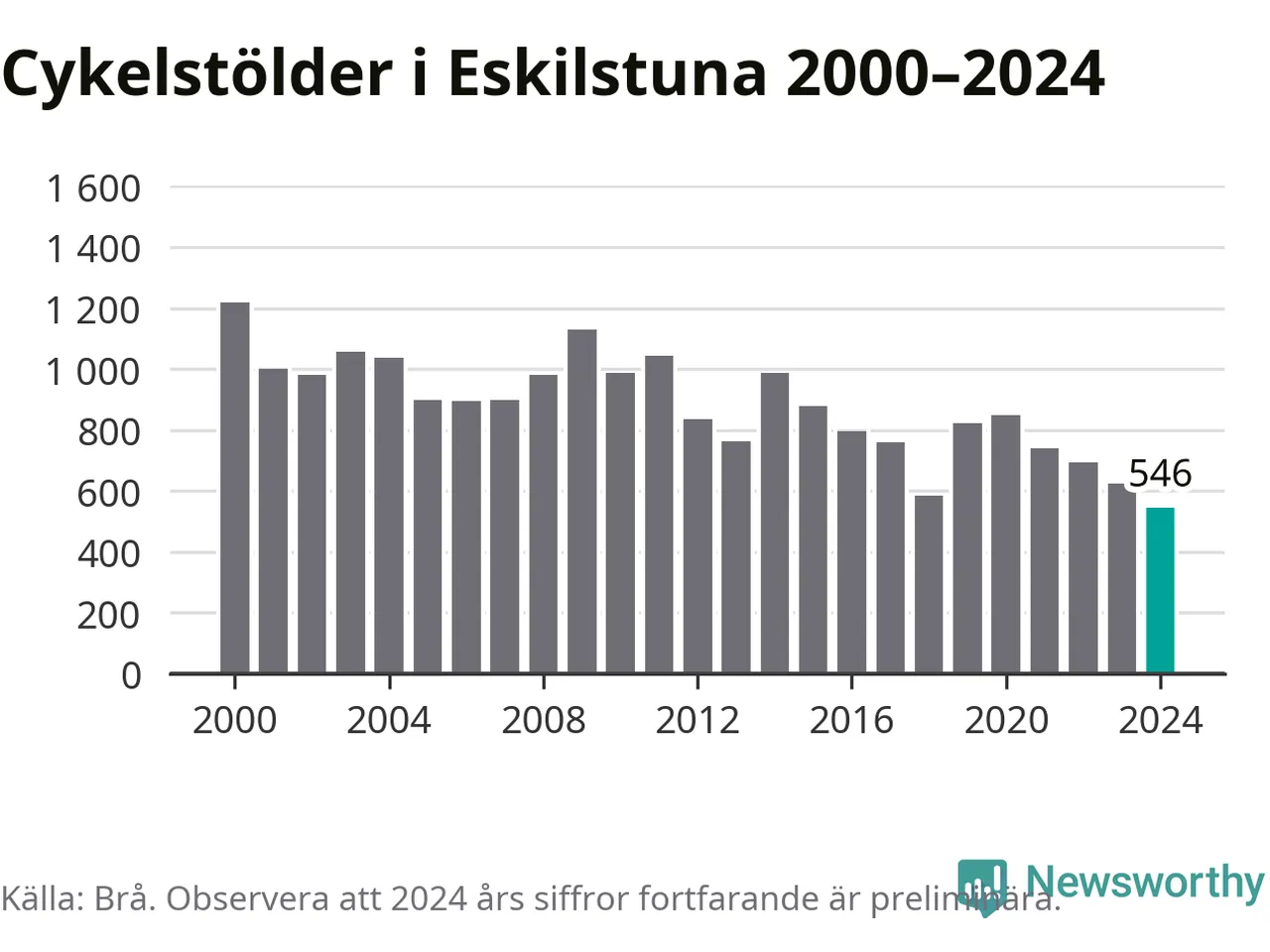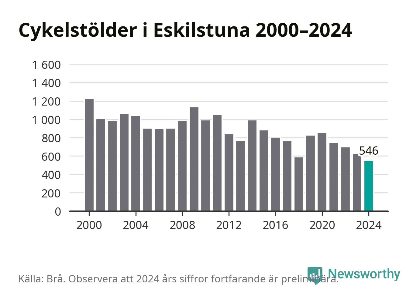 I Eskilstuna kommun noterades det lägsta antalet cykelstölder under hela 2000-talet år 2024, även om det fortfarande är preliminära siffror. Under de senaste 25 åren har det som mest anmälts 1 218 cykelstölder på ett år (2000).