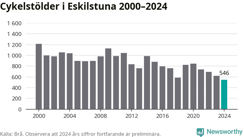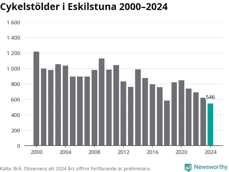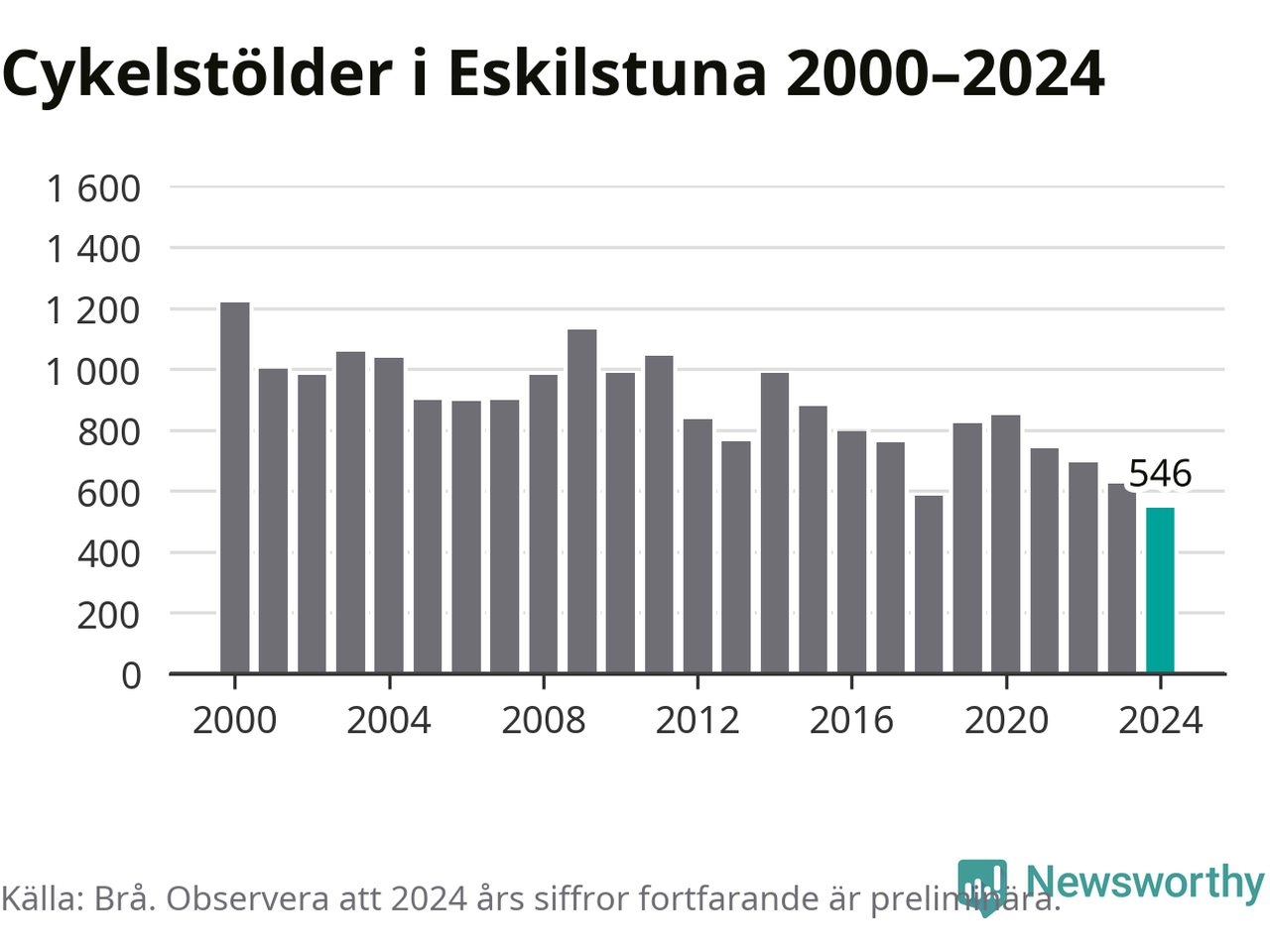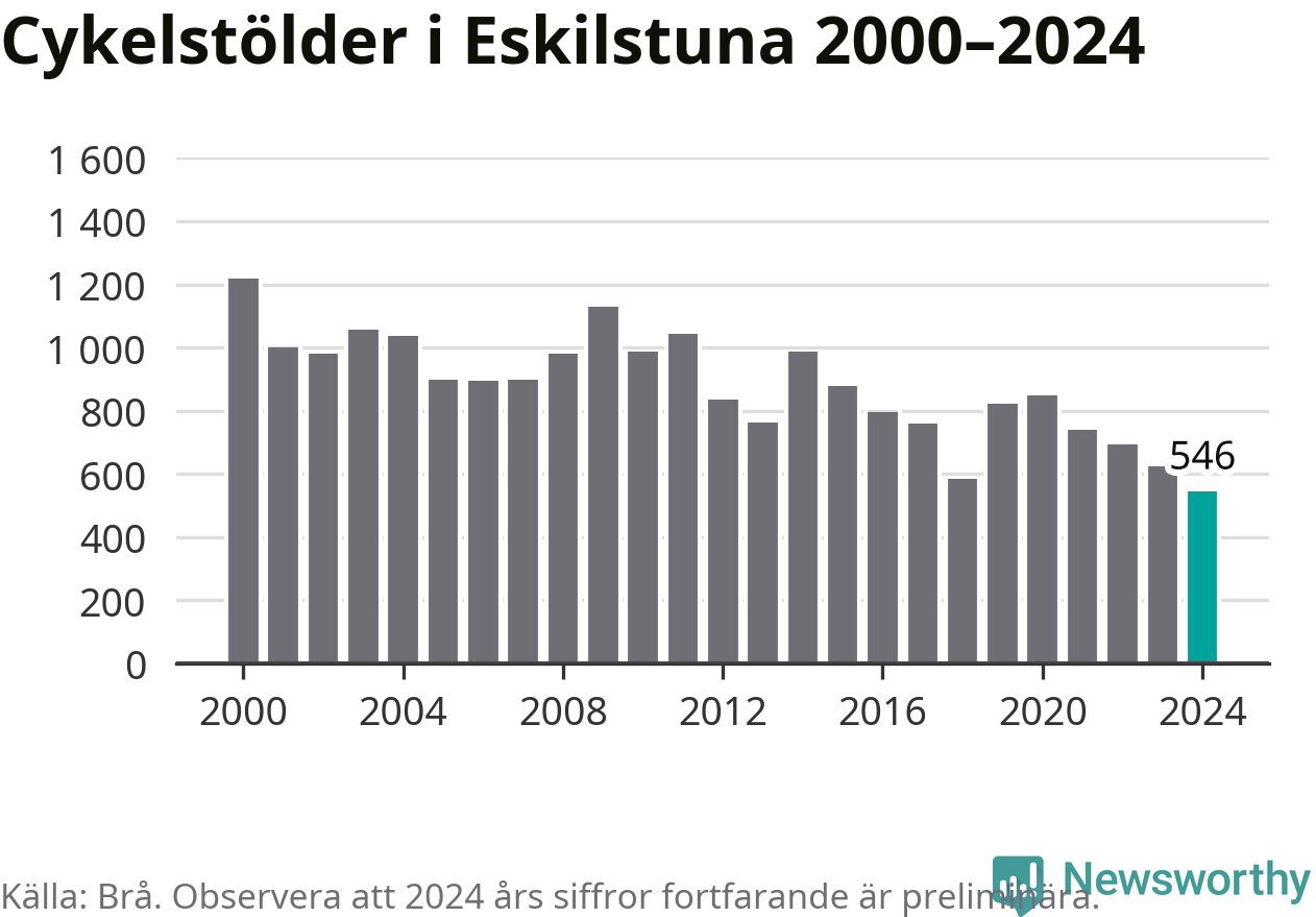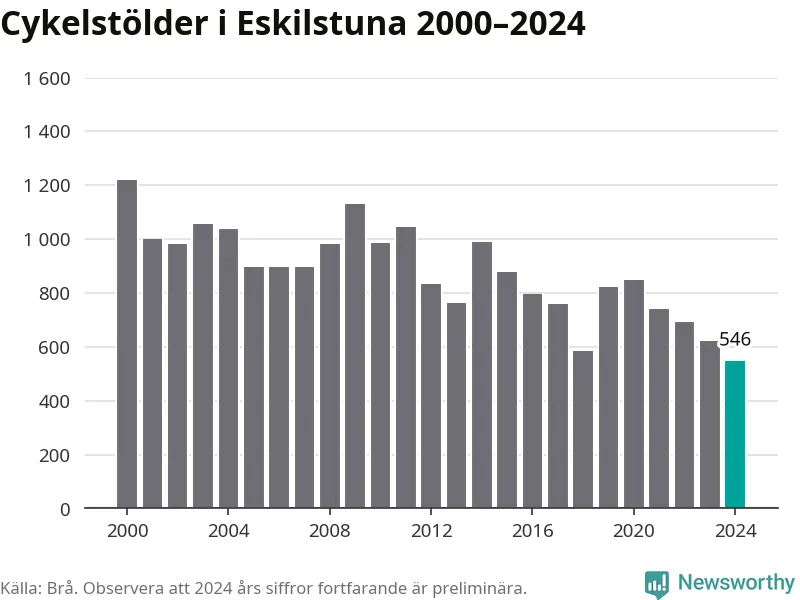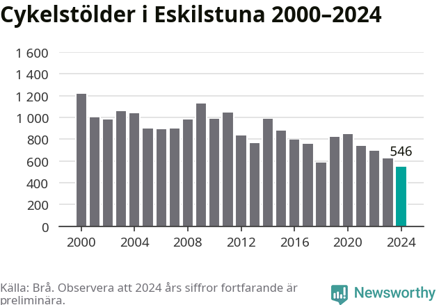 I Eskilstuna kommun noterades det lägsta antalet cykelstölder under hela 2000-talet år 2024, även om det fortfarande är preliminära siffror. Under de senaste 25 åren har det som mest anmälts 1 218 cykelstölder på ett år (2000).