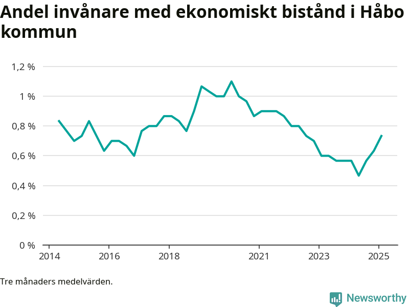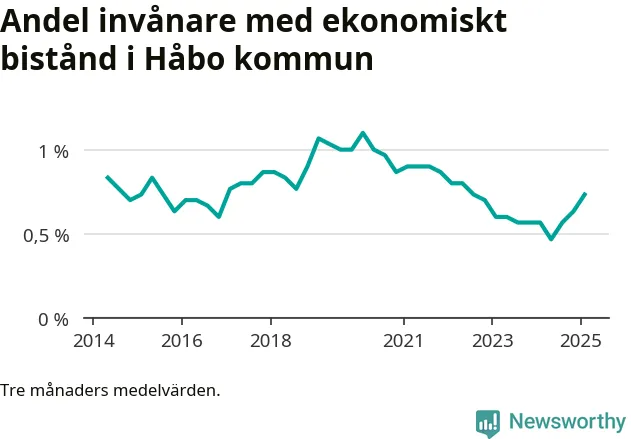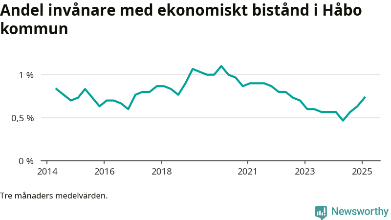 Den högsta andelen biståndstagare under det senaste decenniet hade kommunen under vintern 2020 (1,1 procent), och den lägsta andelen under våren 2024 (0,5 procent).