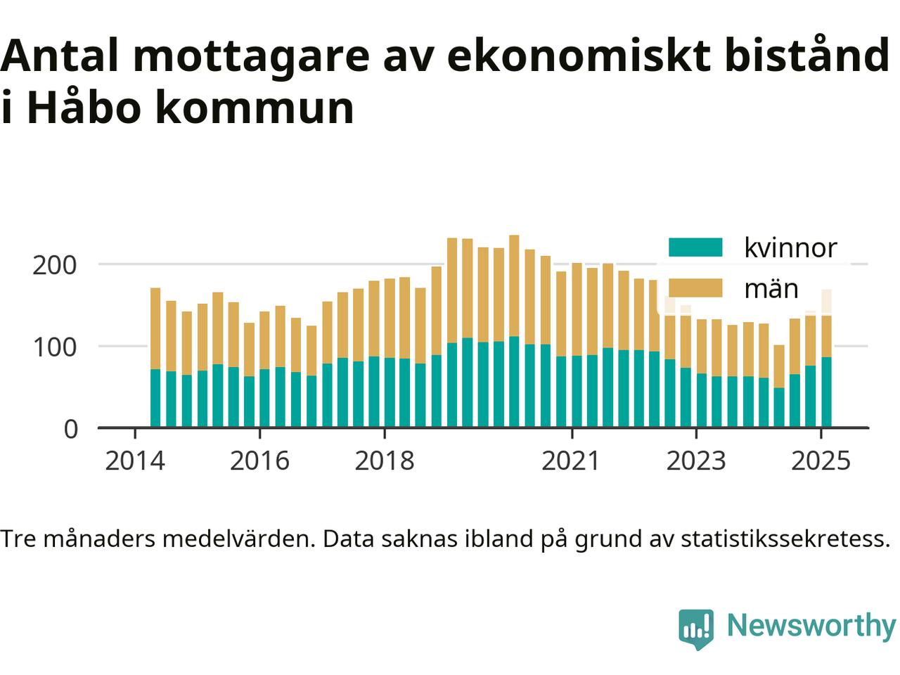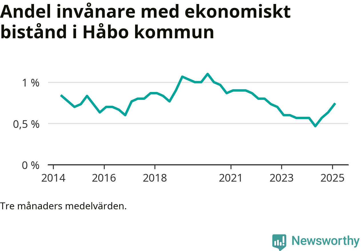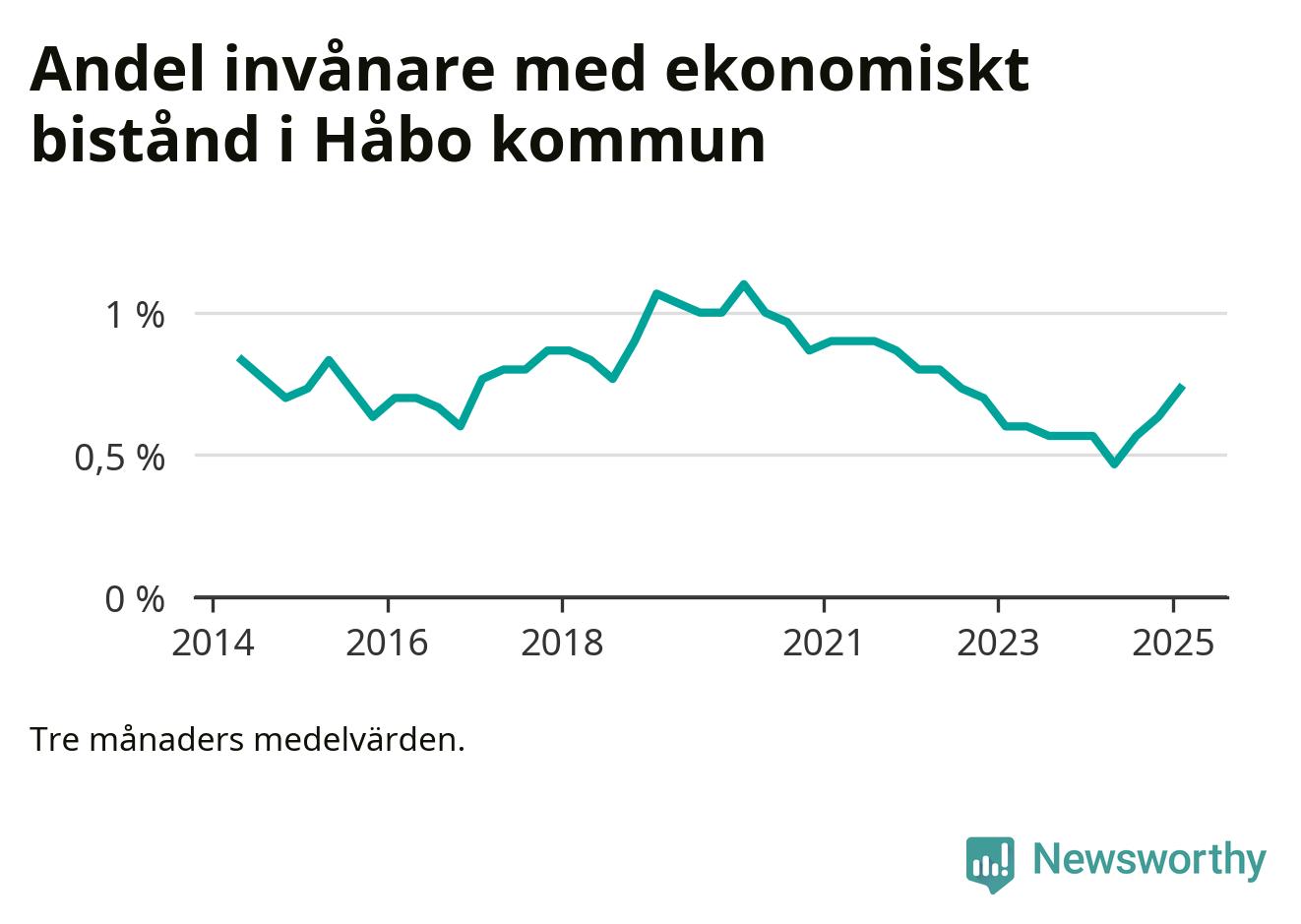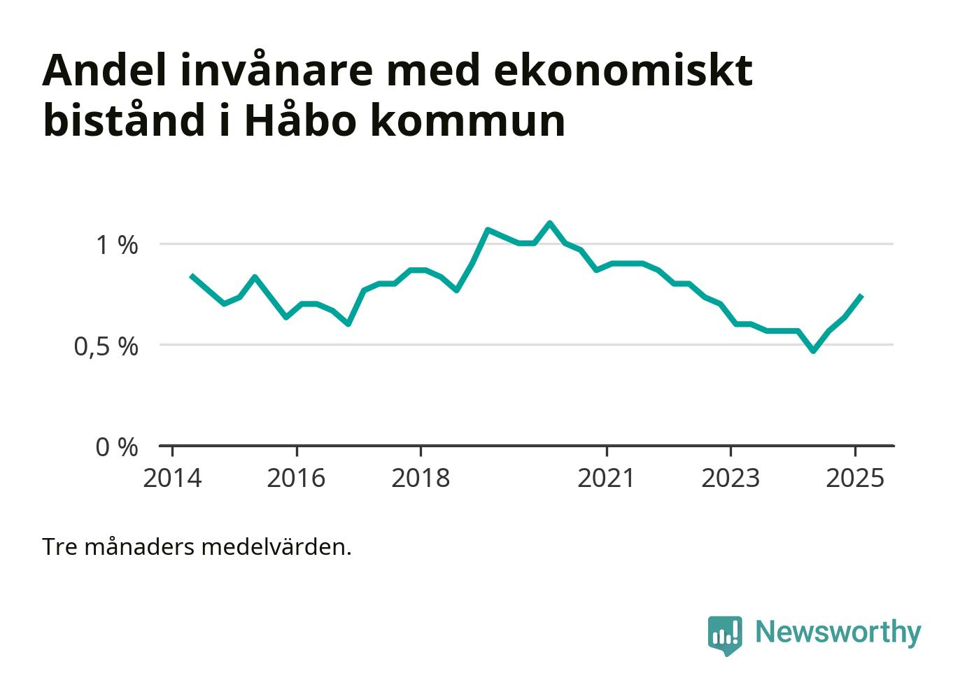 I genomsnitt 169 personer per månad fick ekonomiskt bistånd i Håbo kommun under vintermånaderna (december till februari), vilket motsvarar 0,7 procent av den vuxna befolkningen. Det är marginellt mer än i höstas, och något större andel än under vintern för ett år sedan.