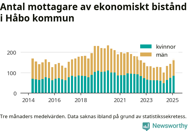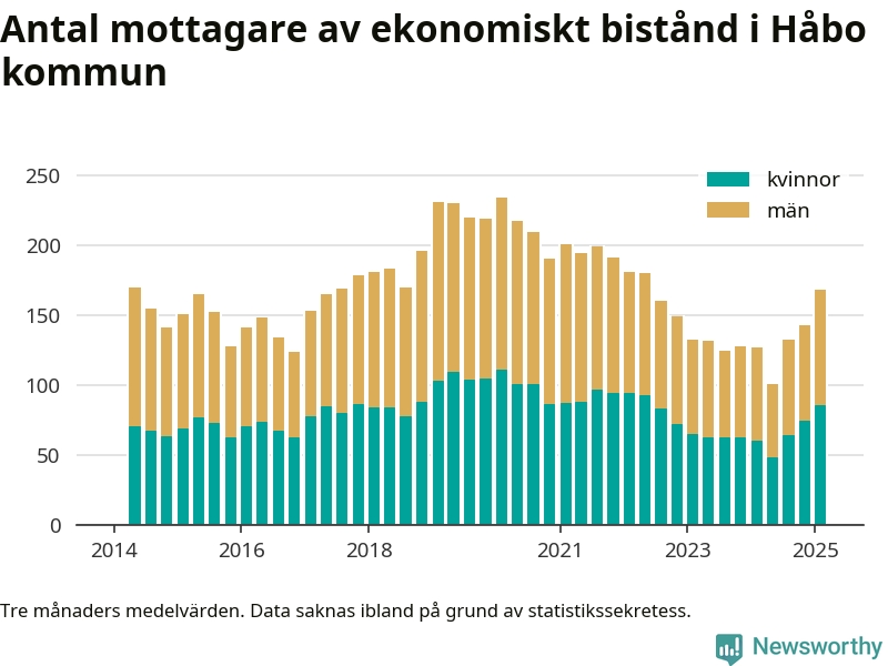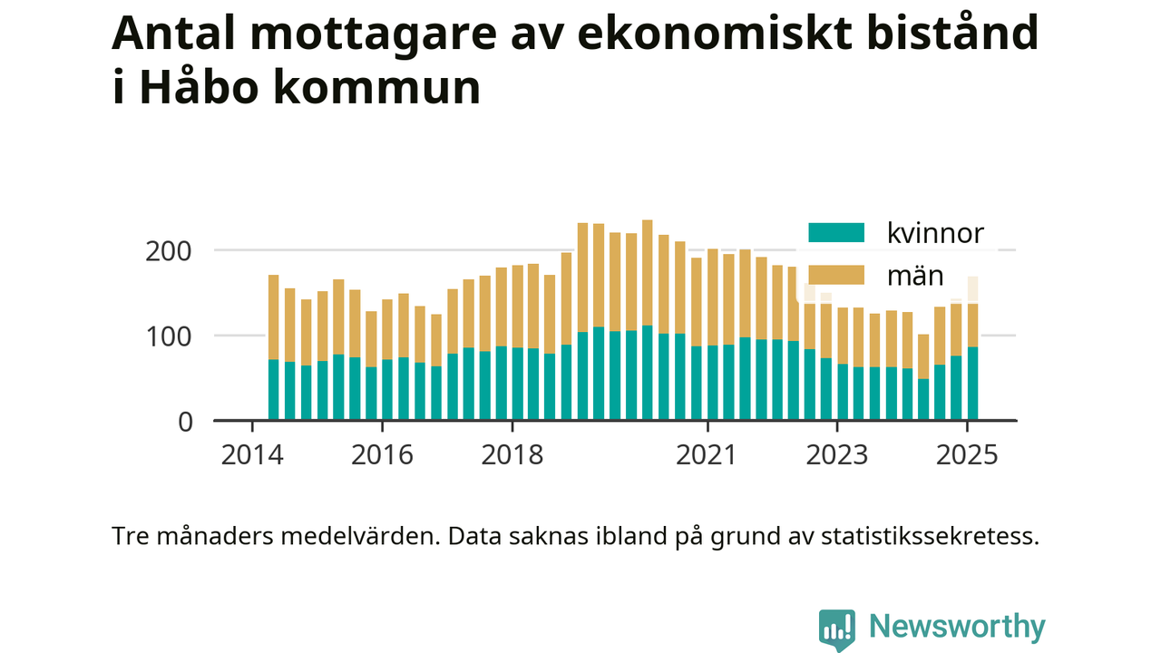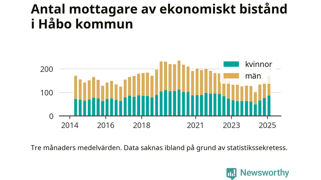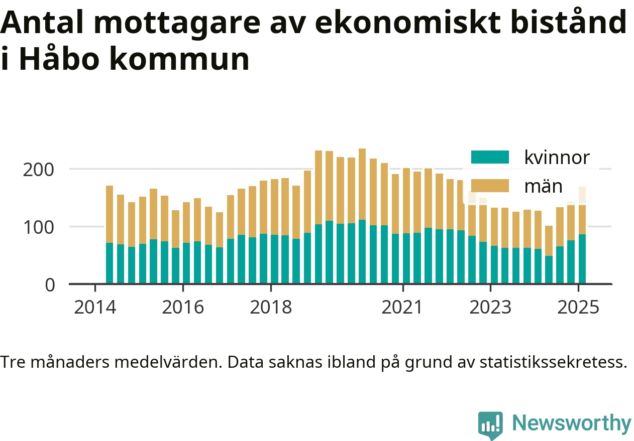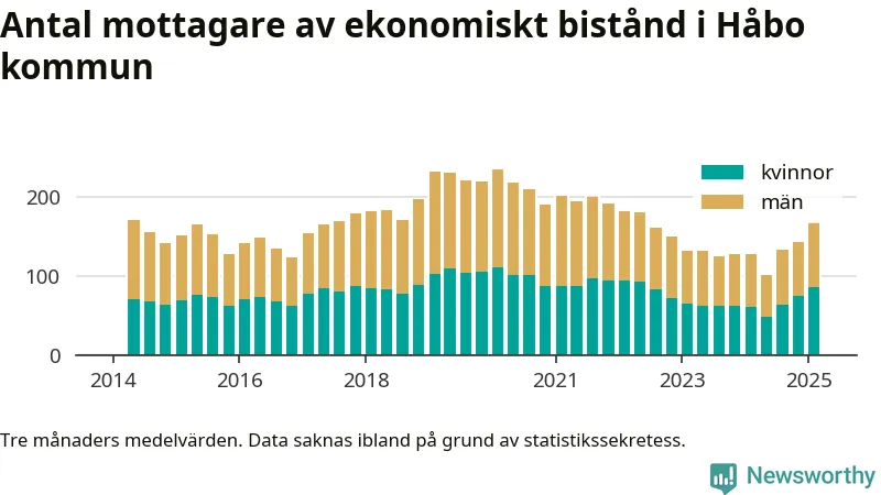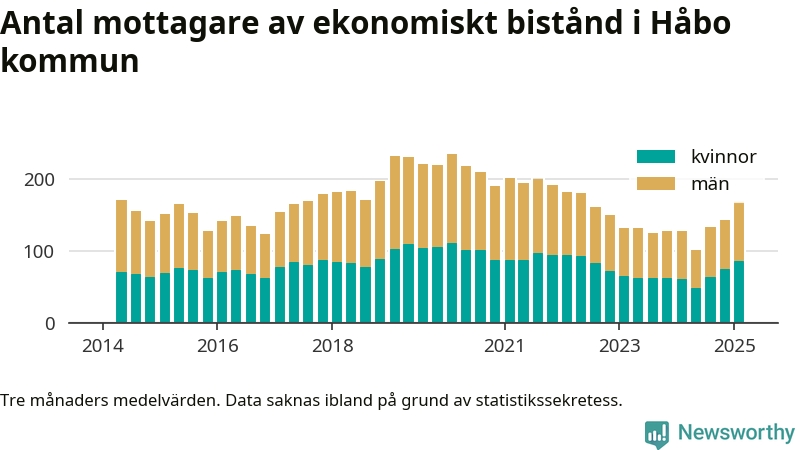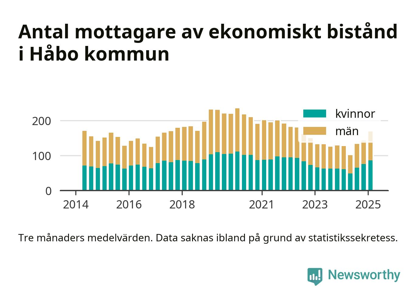 I genomsnitt 169 personer per månad fick ekonomiskt bistånd i Håbo kommun under vintermånaderna (december till februari), vilket motsvarar 0,7 procent av den vuxna befolkningen. Det är marginellt mer än i höstas, och något större andel än under vintern för ett år sedan.