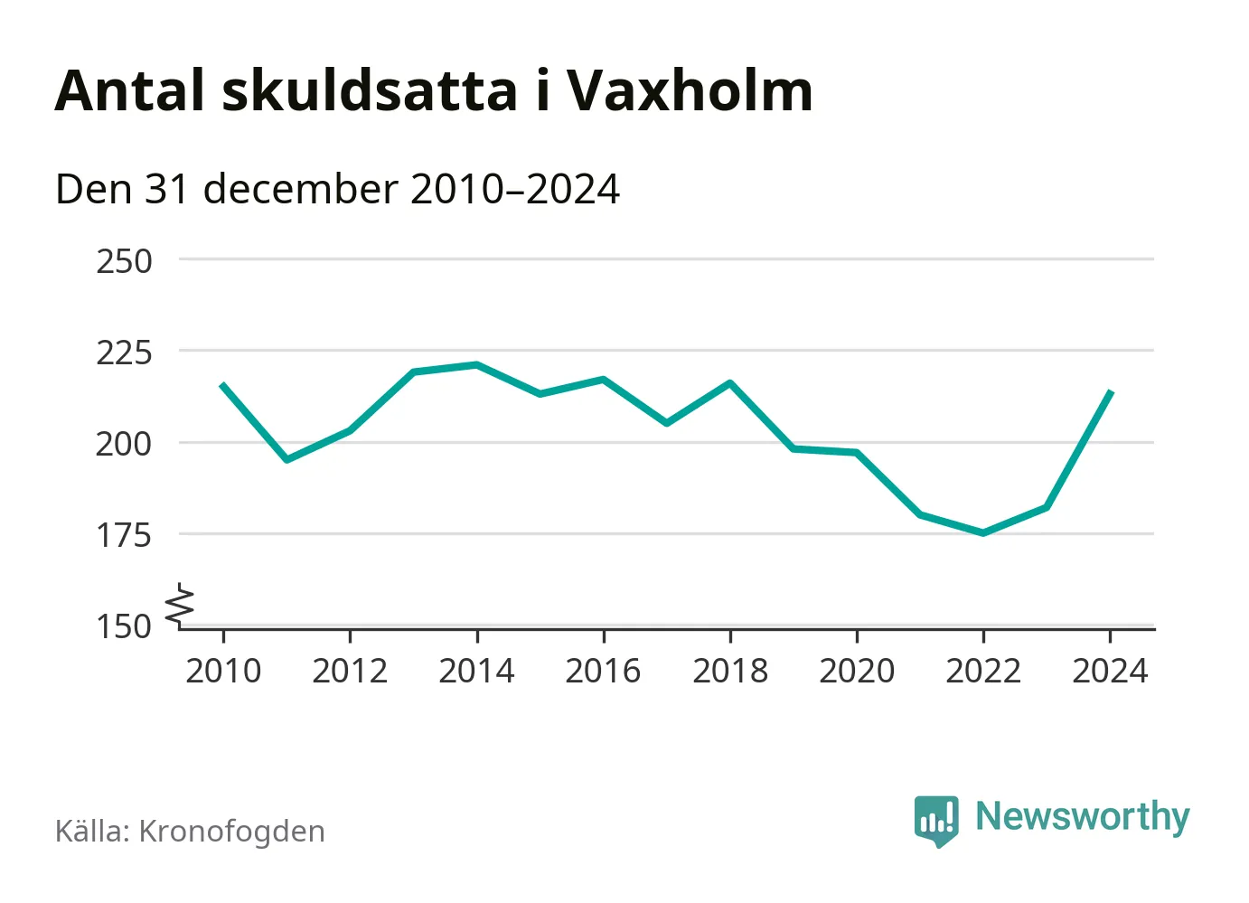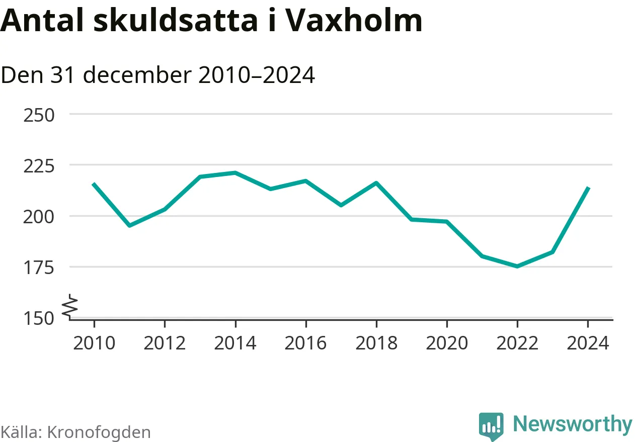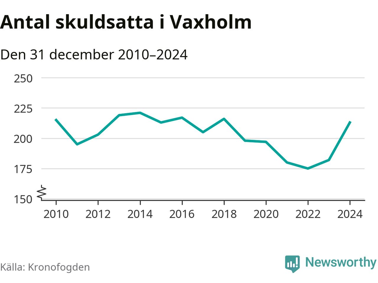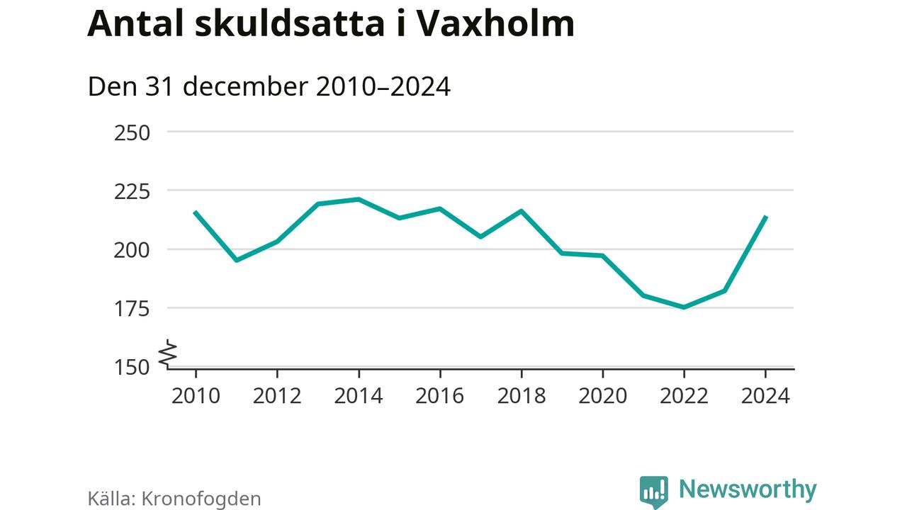 Allt fler Vaxholmsbor hamnar hos Kronofogden. Vid årskiftet var 213 invånare i kommunen skyldiga totalt 73,6 miljoner kronor. Det är en ökning med 31 personer – eller 17 procent – jämfört med året innan.