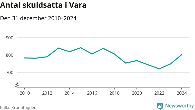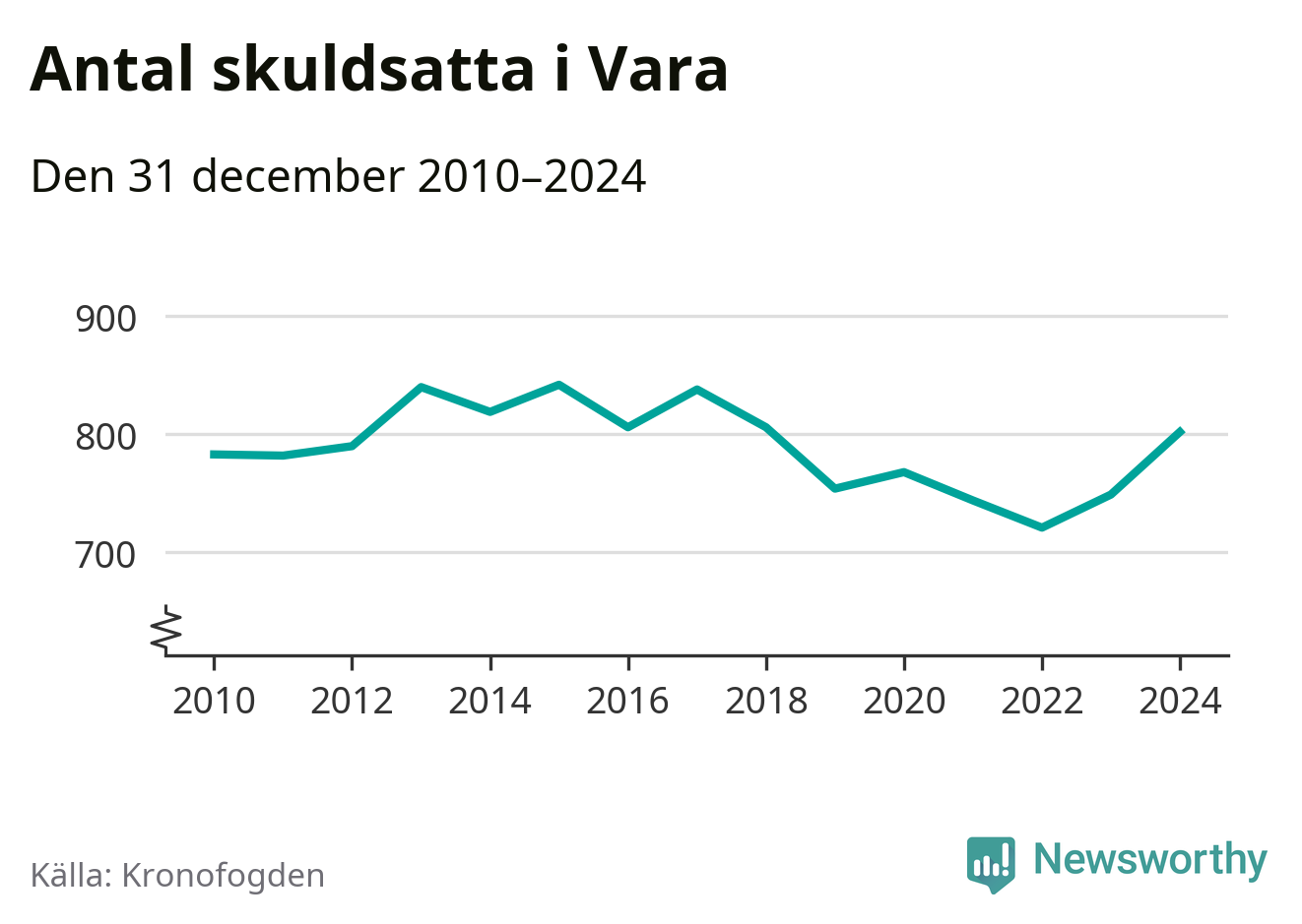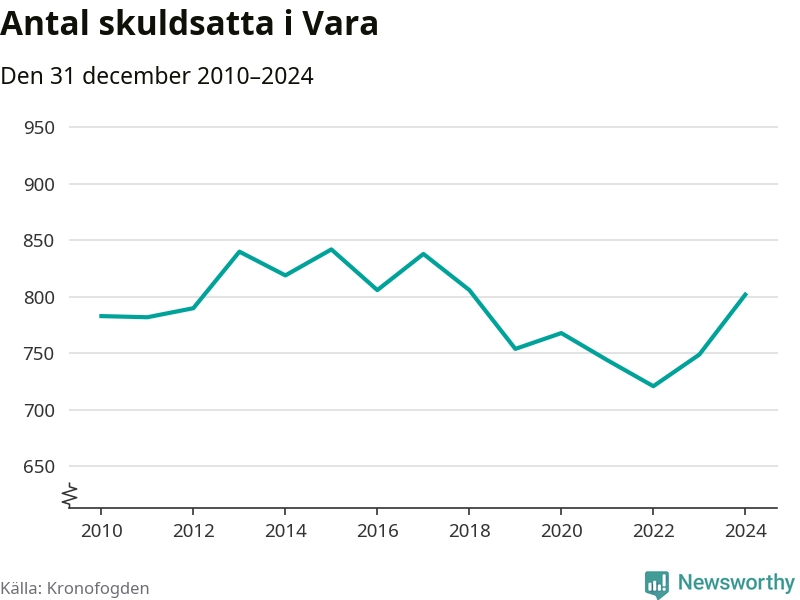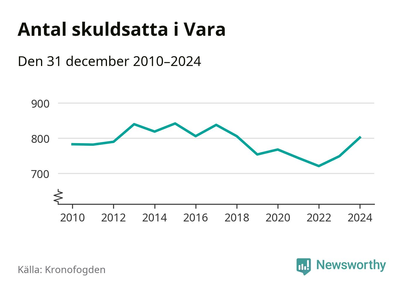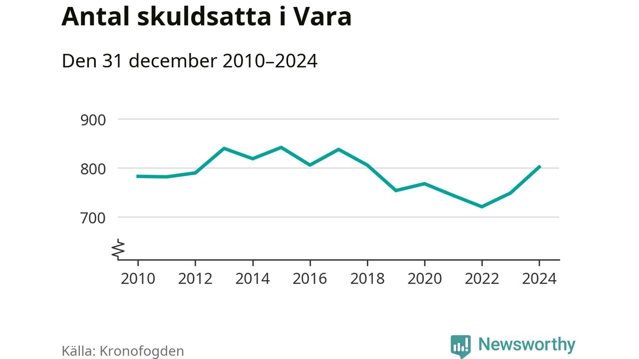 Vid årskiftet var 6 procent av alla Varabor över 18 år registrerade hos Kronofogden. Det är den näst högsta andelen av alla kommuner i Västra Götaland. Störst andel skuldsatta i länet finns i Färgelanda (7 procent), medan den lägsta andelen finns på Öckerö (2 procent).