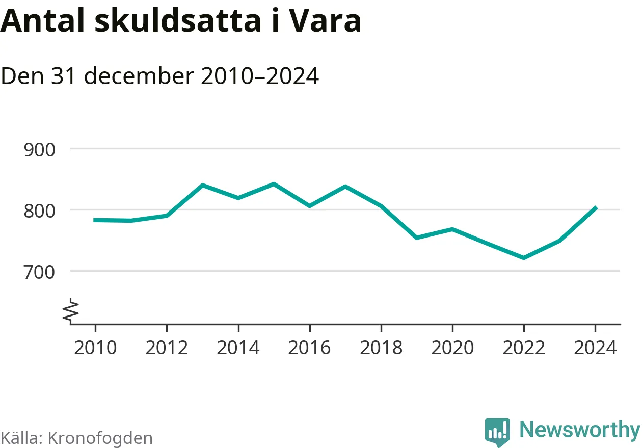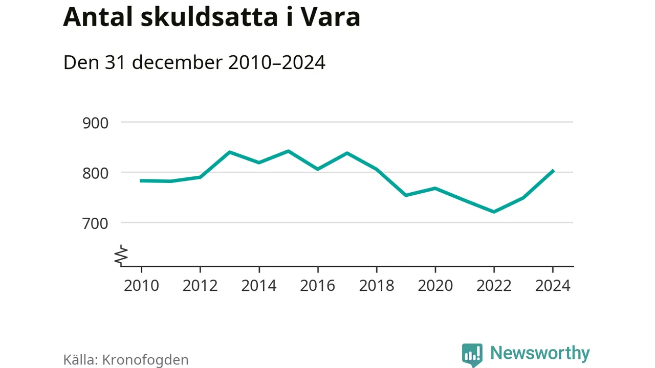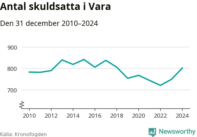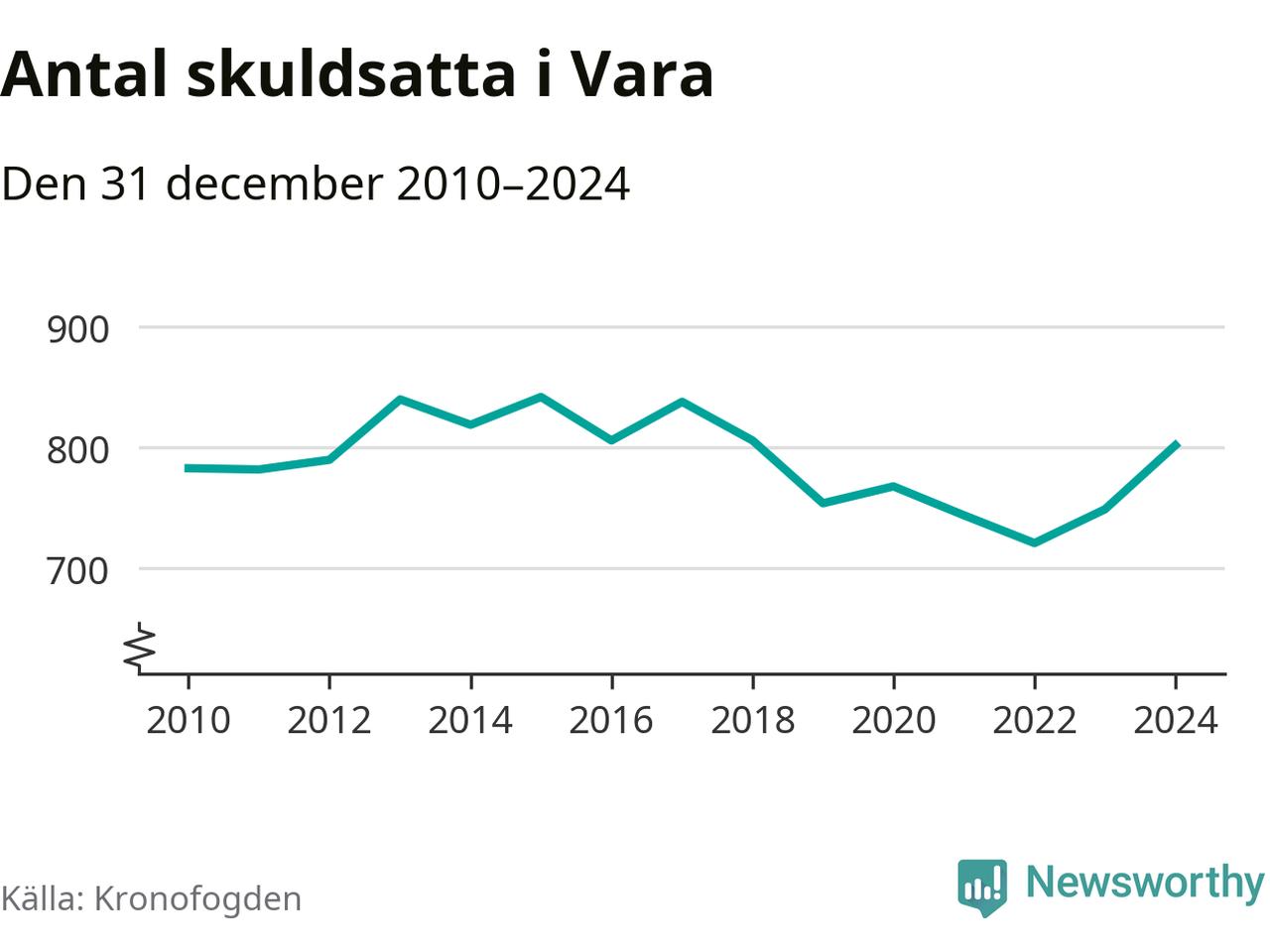 Allt fler Varabor hamnar hos Kronofogden. Vid årskiftet var 802 invånare i kommunen skyldiga totalt 245,3 miljoner kronor. Det är en ökning med 53 personer – eller 7 procent – jämfört med året innan.