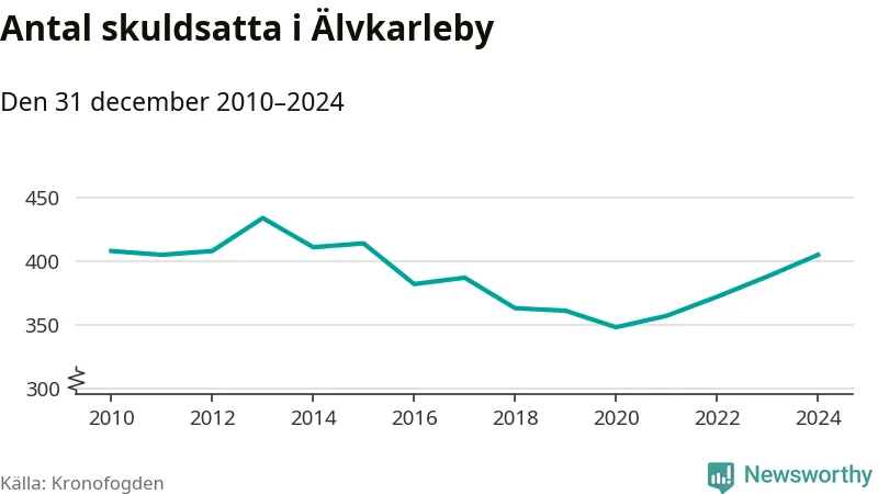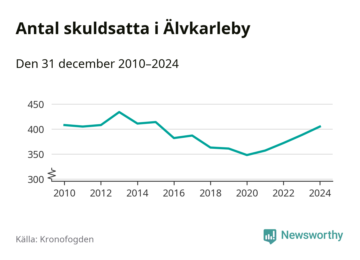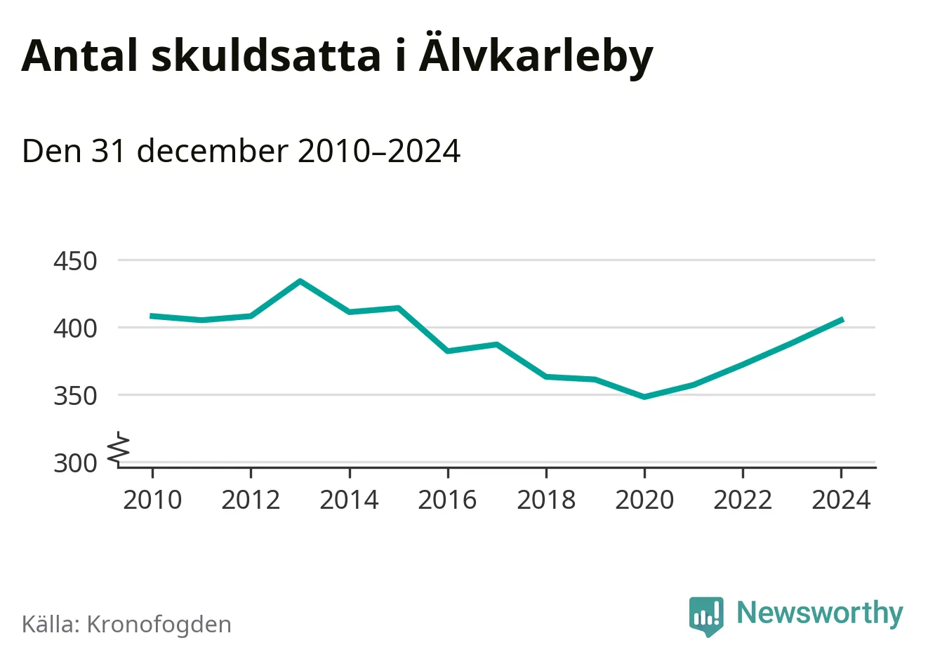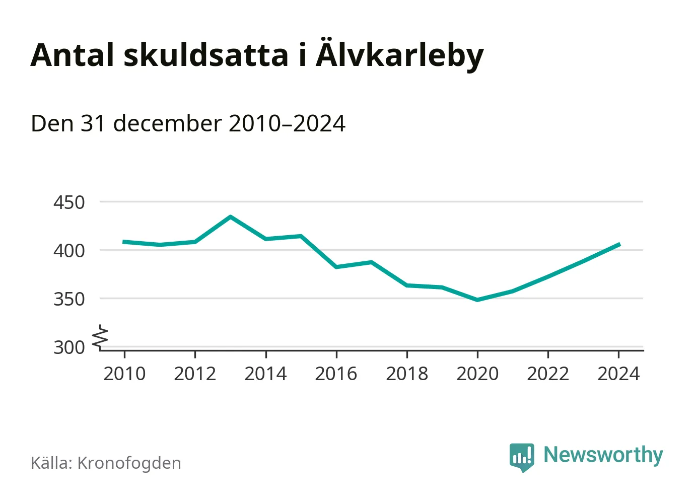 Allt fler Älvkarlebybor hamnar hos Kronofogden. Vid årskiftet var 405 invånare i kommunen skyldiga totalt 120,4 miljoner kronor. Det är en ökning med 17 personer – eller 4 procent – jämfört med året innan.
