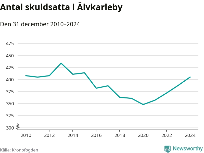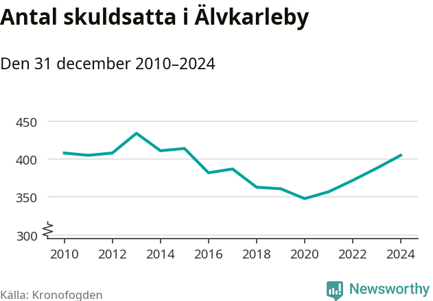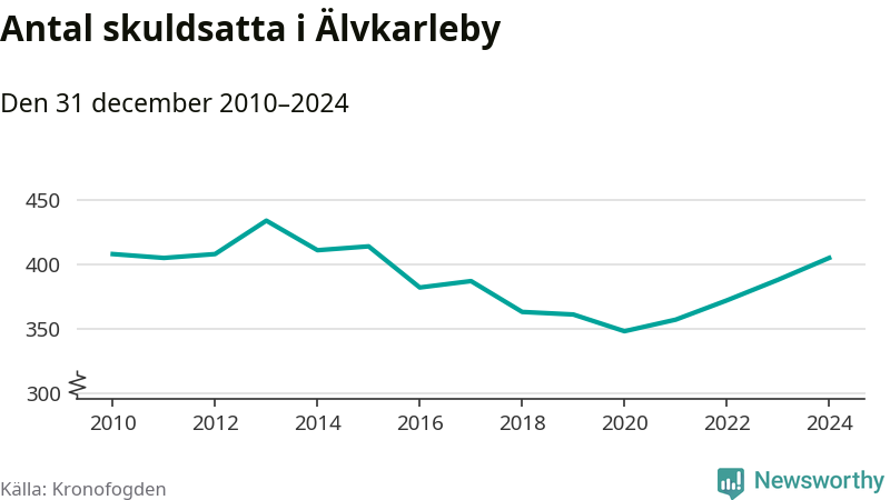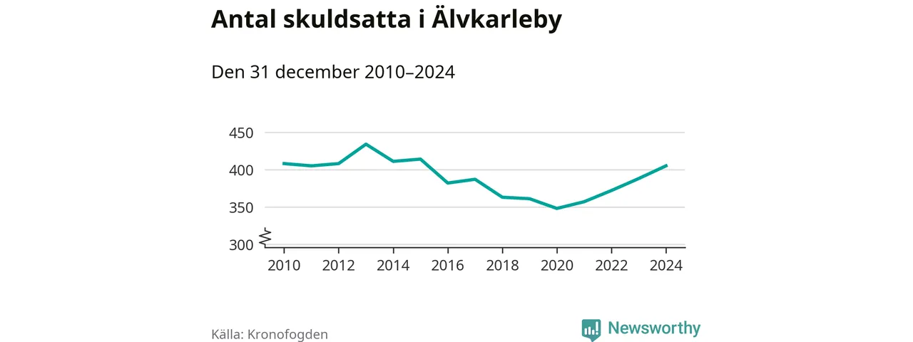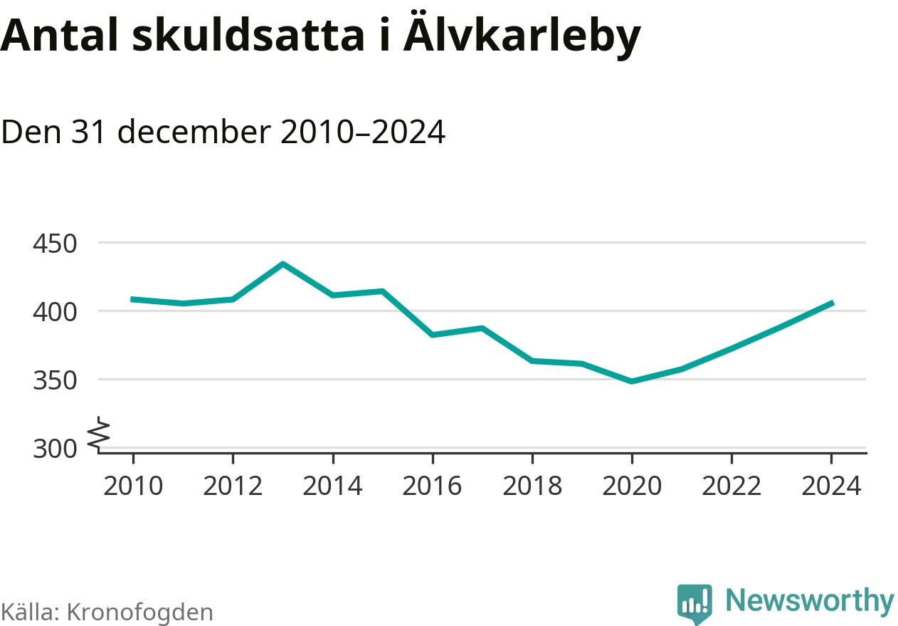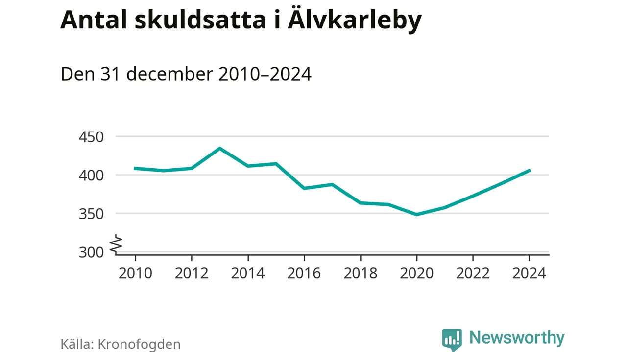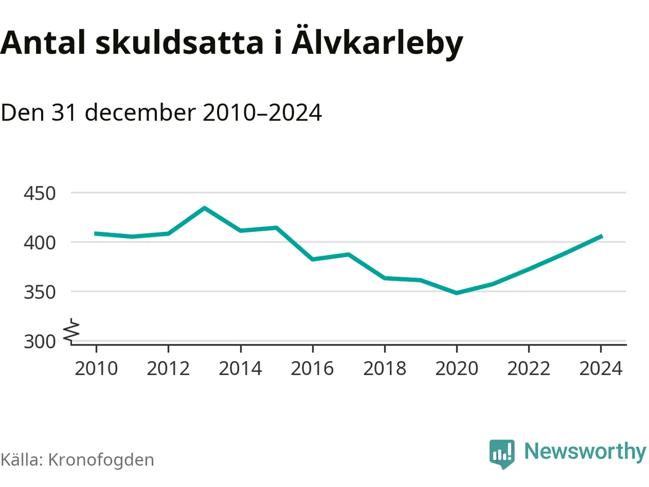 Allt fler Älvkarlebybor hamnar hos Kronofogden. Vid årskiftet var 405 invånare i kommunen skyldiga totalt 120,4 miljoner kronor. Det är en ökning med 17 personer – eller 4 procent – jämfört med året innan.