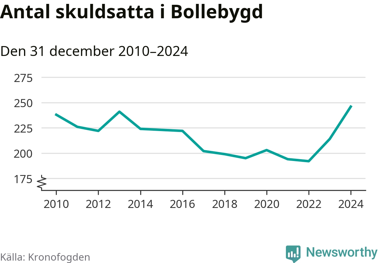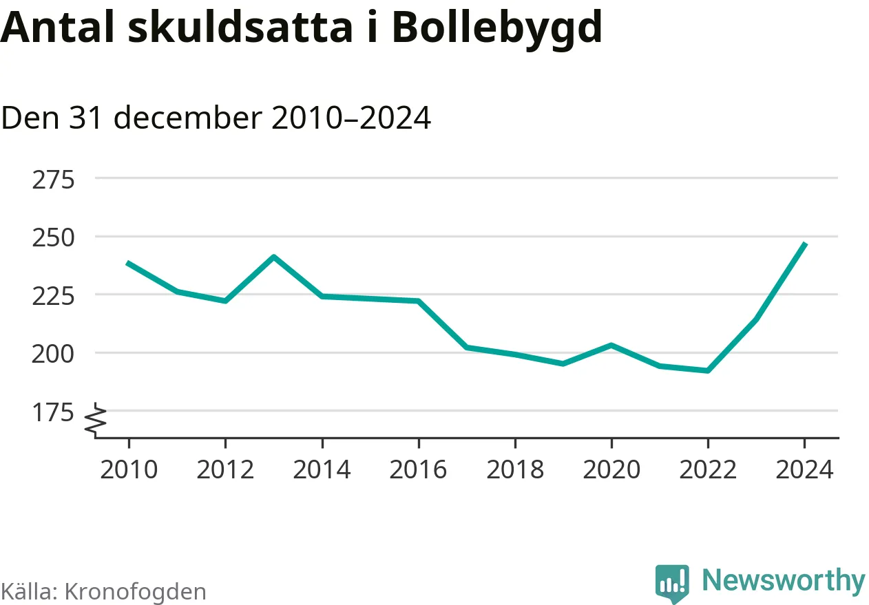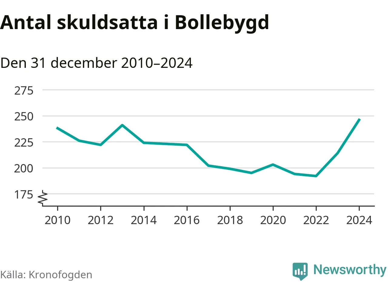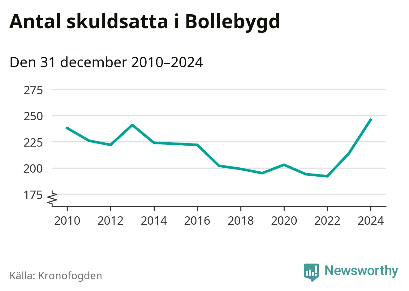 Inte sedan åtminstone 2010 har så många Bollebygdsbor hamnat hos Kronofogden. Vid årskiftet var 246 invånare i kommunen skyldiga totalt 90 miljoner kronor. Det är en ökning med 32 personer – eller 15 procent – jämfört med året innan.
