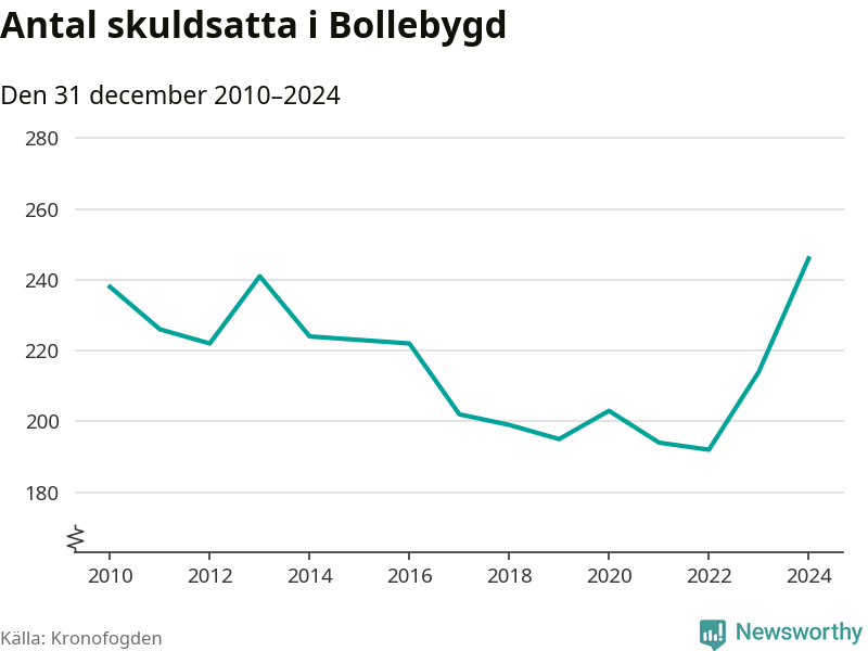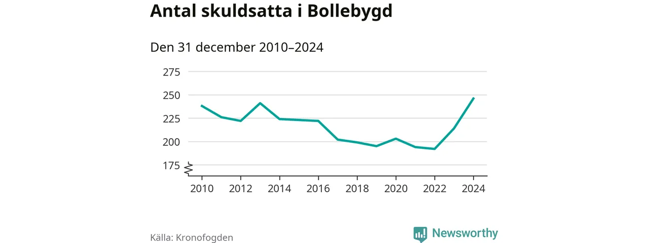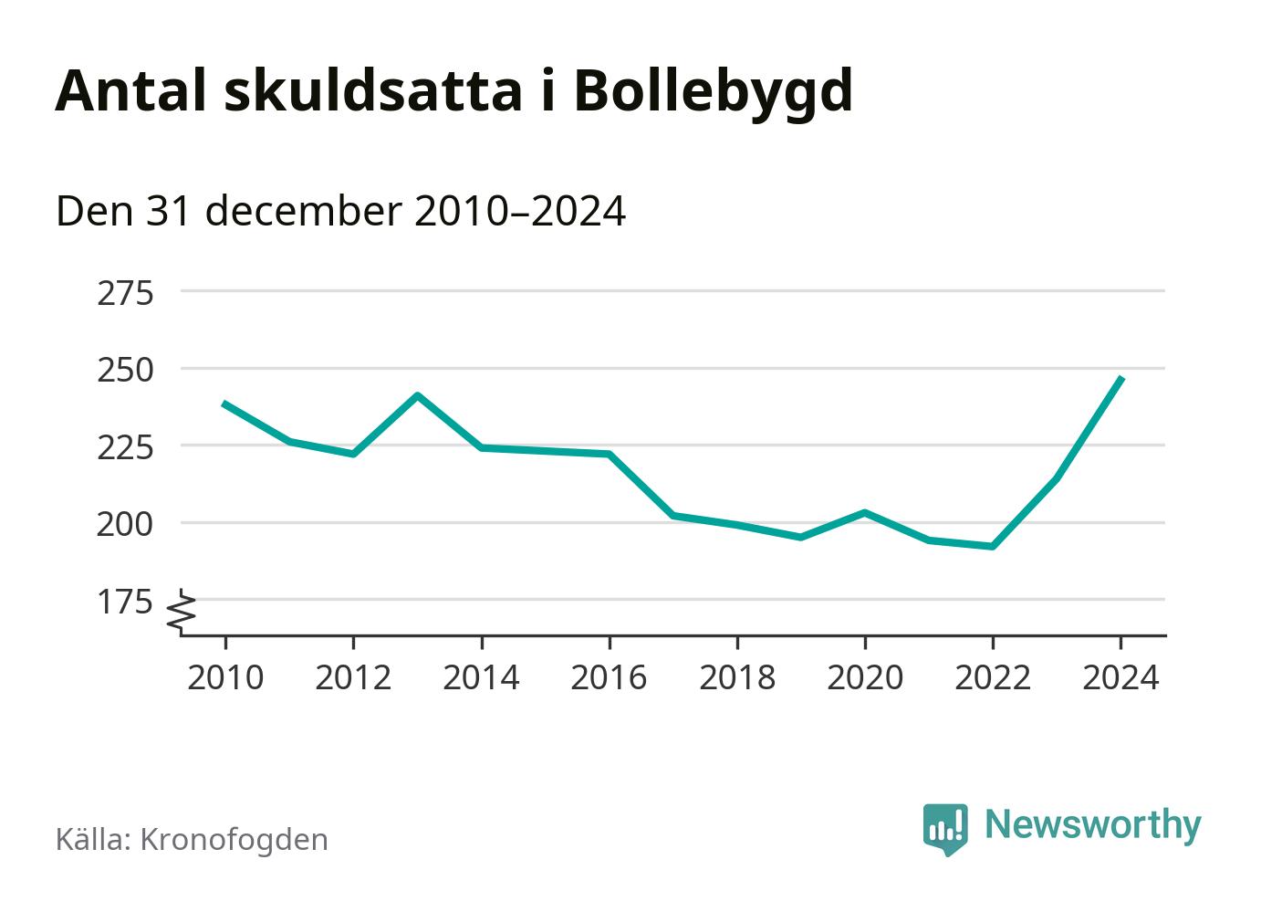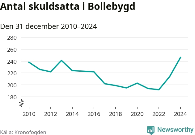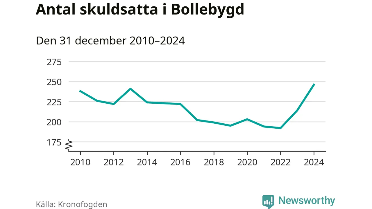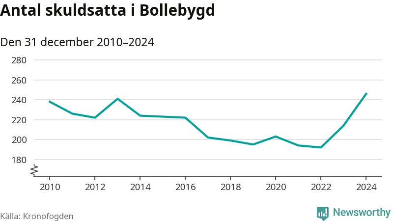 Inte sedan åtminstone 2010 har så många Bollebygdsbor hamnat hos Kronofogden. Vid årskiftet var 246 invånare i kommunen skyldiga totalt 90 miljoner kronor. Det är en ökning med 32 personer – eller 15 procent – jämfört med året innan.