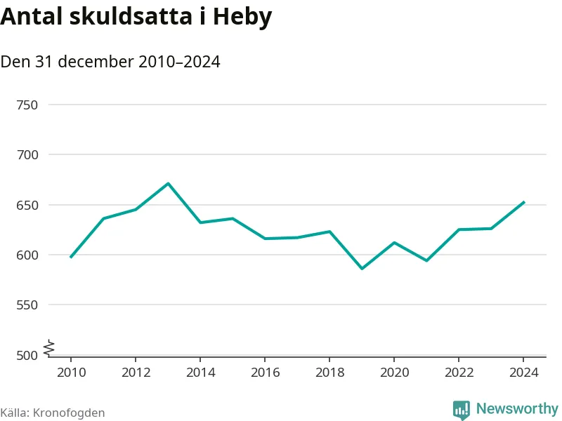 Vid årskiftet var 6 procent av alla Hebybor över 18 år registrerade hos Kronofogden. Det är den näst högsta andelen av alla kommuner i Uppsala län. Störst andel skuldsatta i länet finns i Tierp (6 procent), medan den lägsta andelen finns i Knivsta (3 procent).