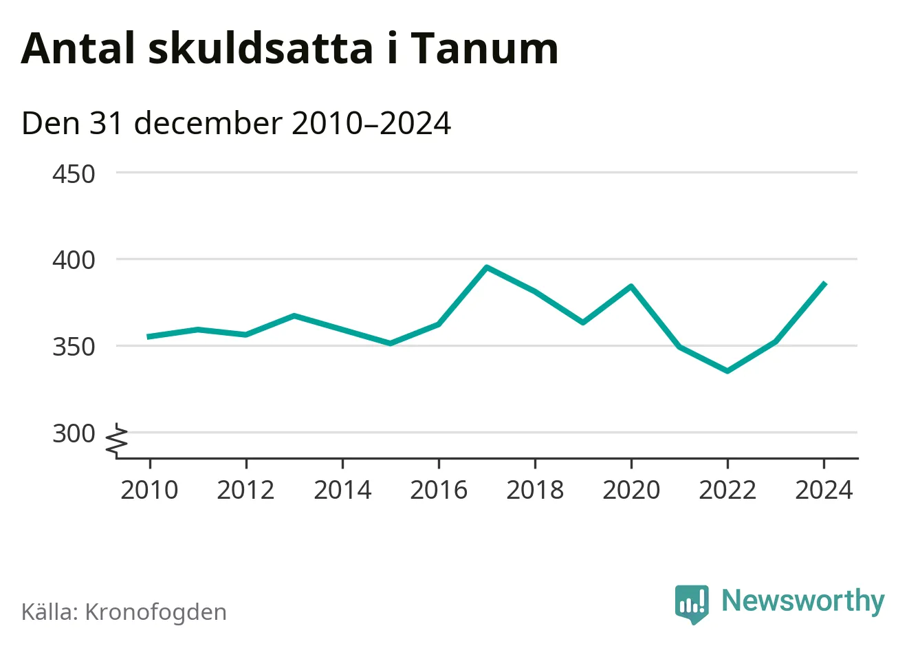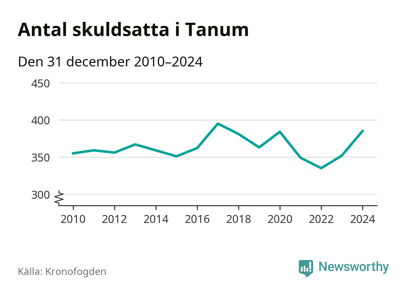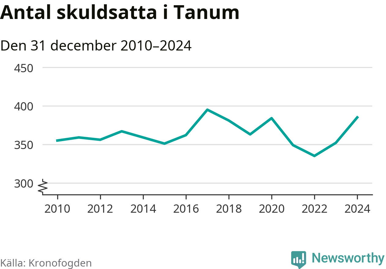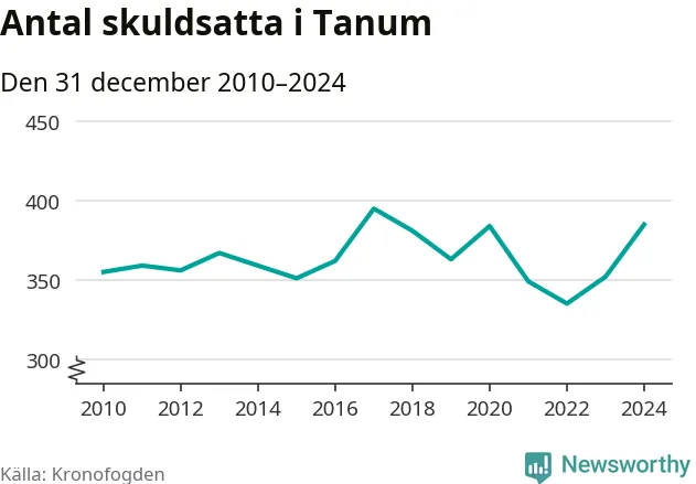 Allt fler Tanumsbor hamnar hos Kronofogden. Vid årskiftet var 385 invånare i kommunen skyldiga totalt 200,6 miljoner kronor. Det är en ökning med 33 personer – eller 9 procent – jämfört med året innan.