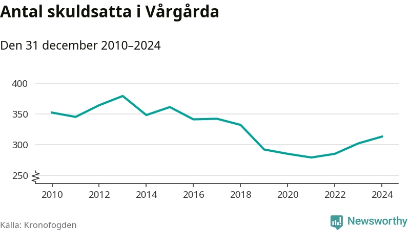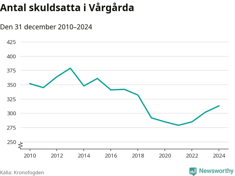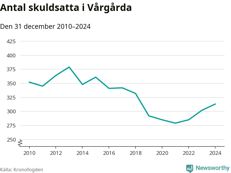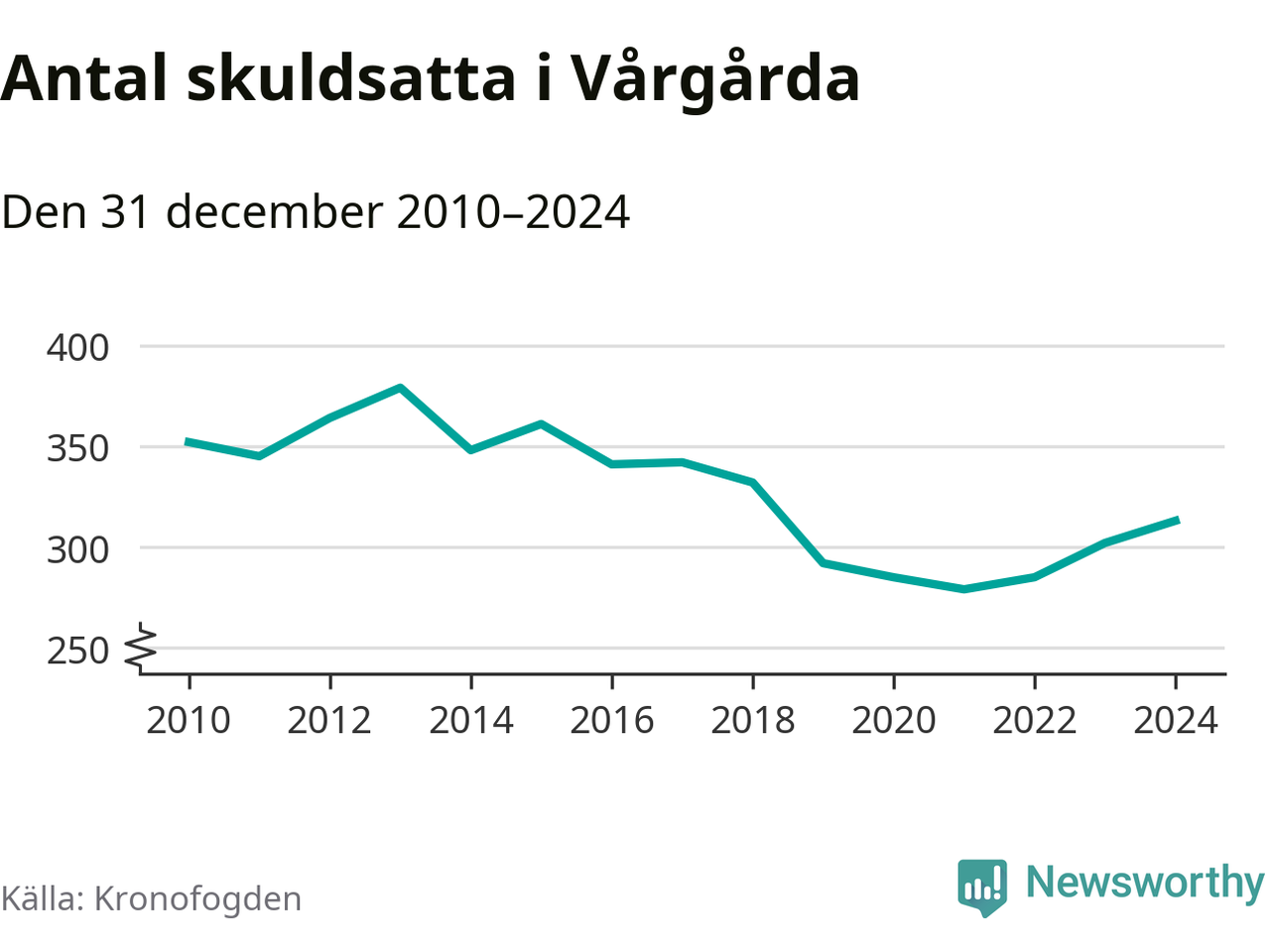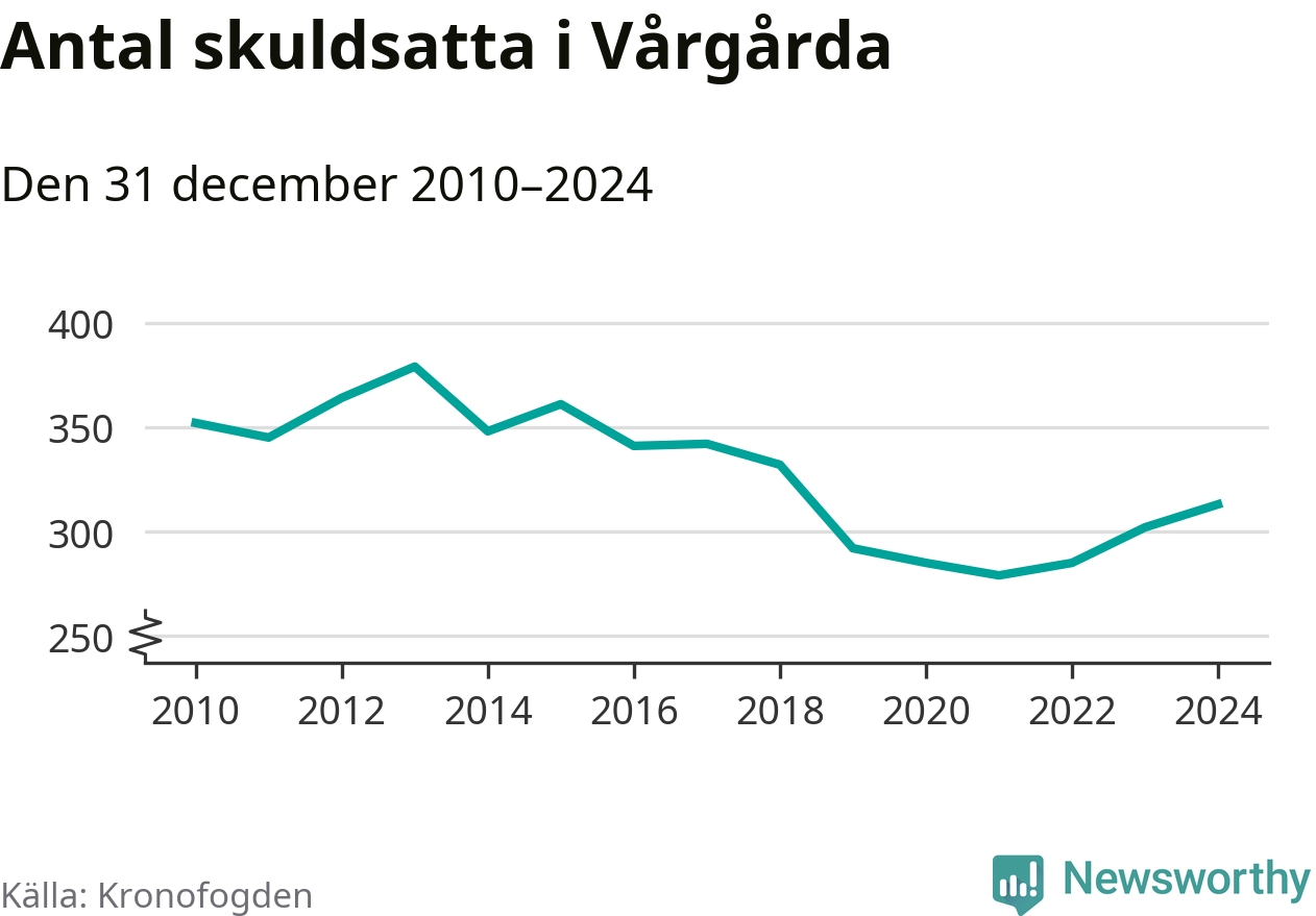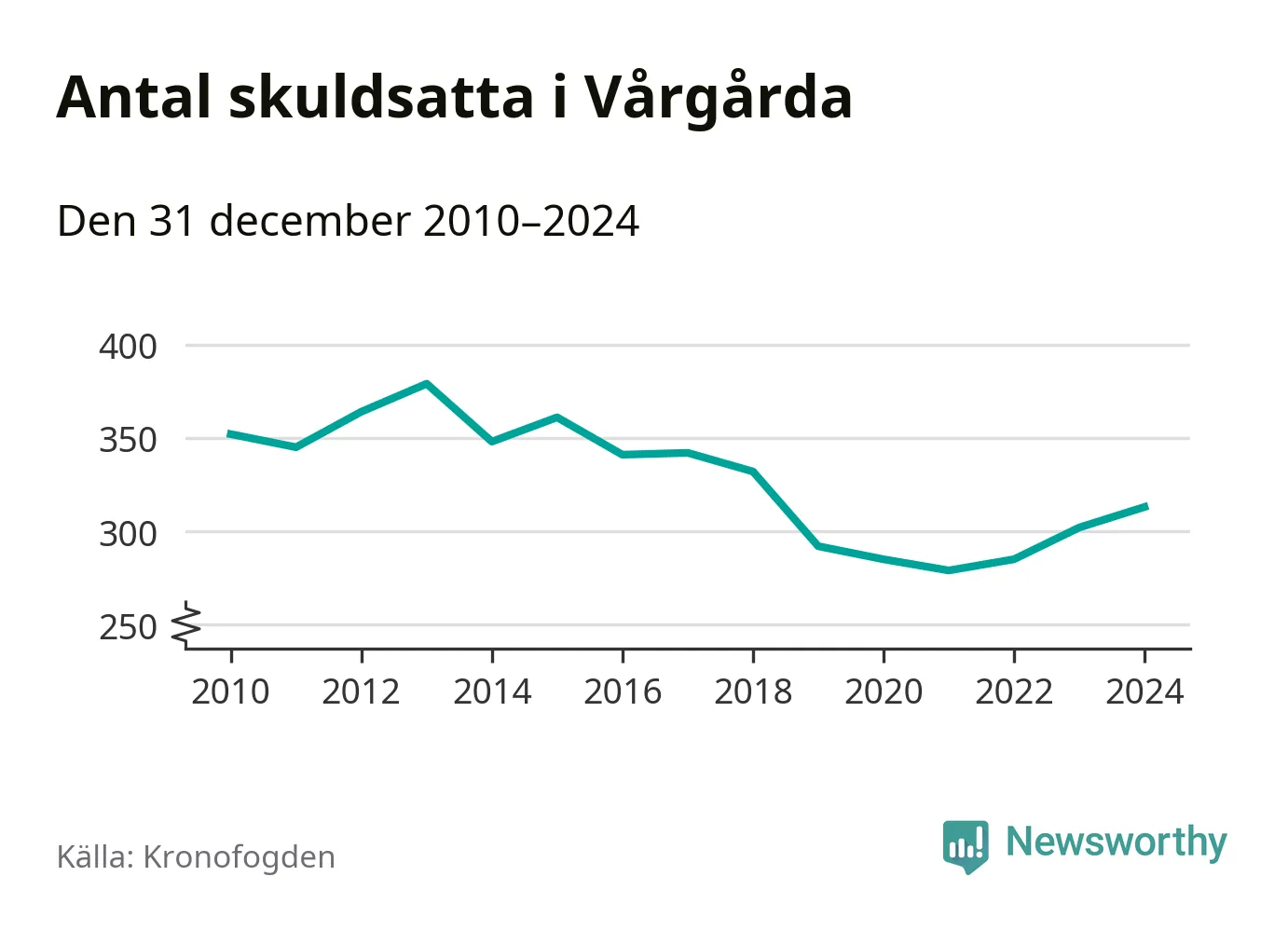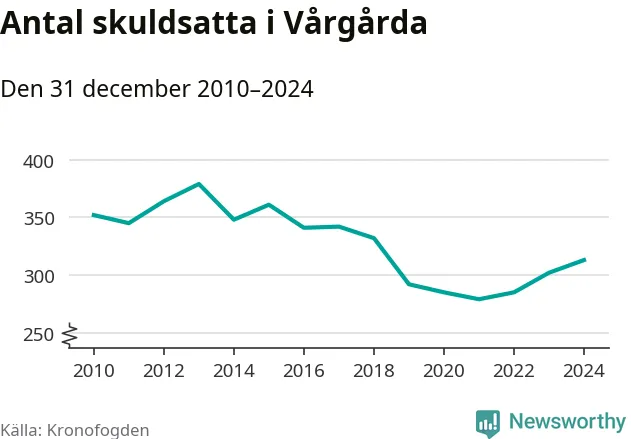 Inte sedan år 2018 har lika många Vårgårdabor varit registrerade hos Kronofogden. Listan toppas av en 53-årig kvinna.
