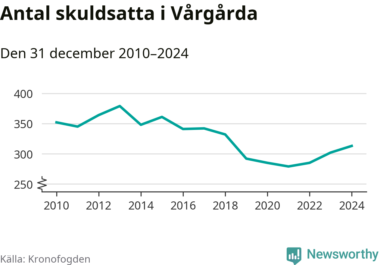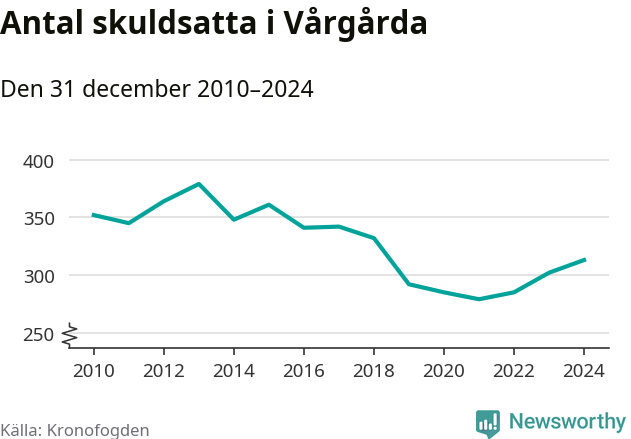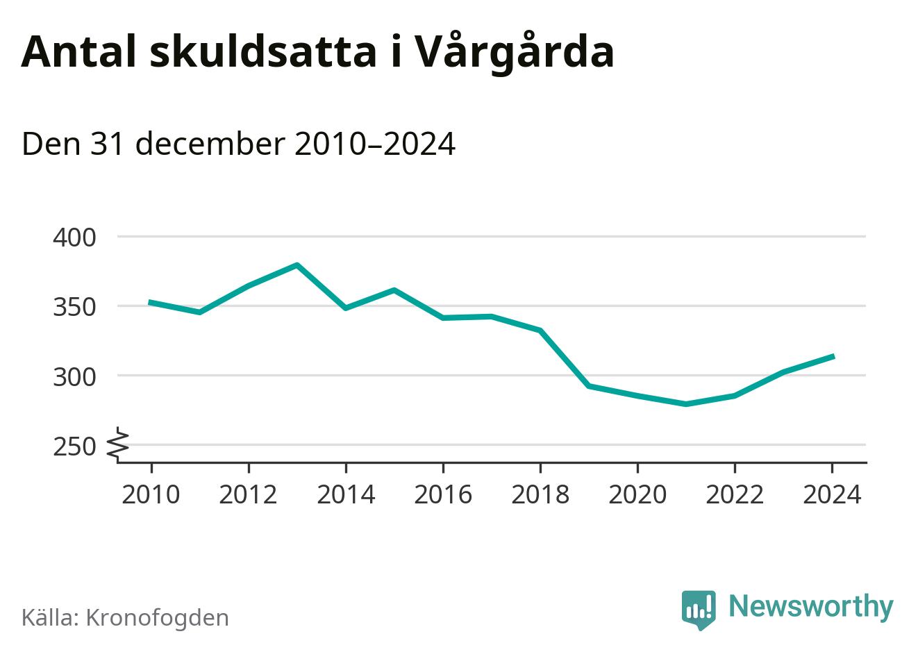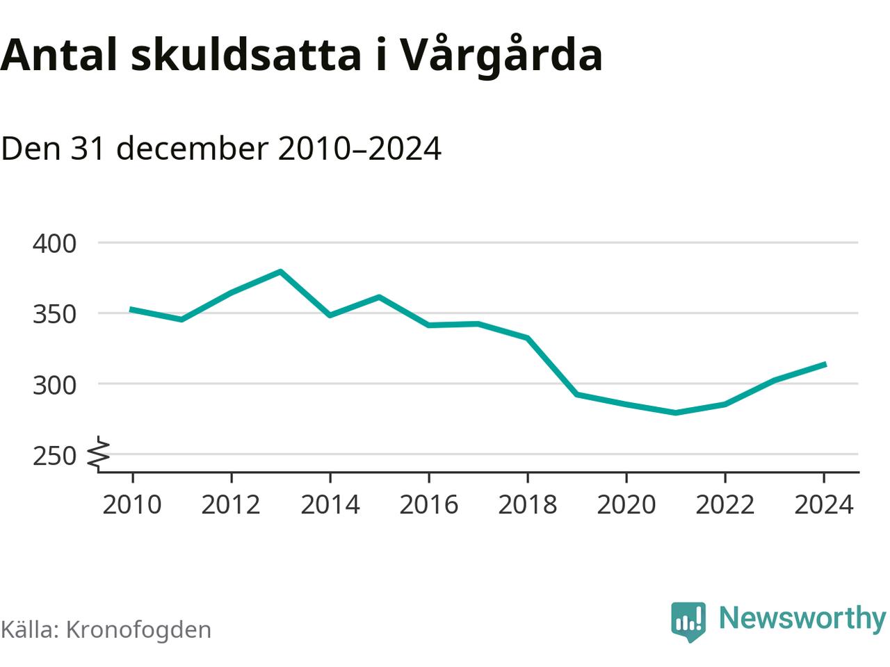 Allt fler Vårgårdabor hamnar hos Kronofogden. Vid årskiftet var 313 invånare i kommunen skyldiga totalt 85,5 miljoner kronor. Det är en ökning med elva personer – eller 4 procent – jämfört med året innan.