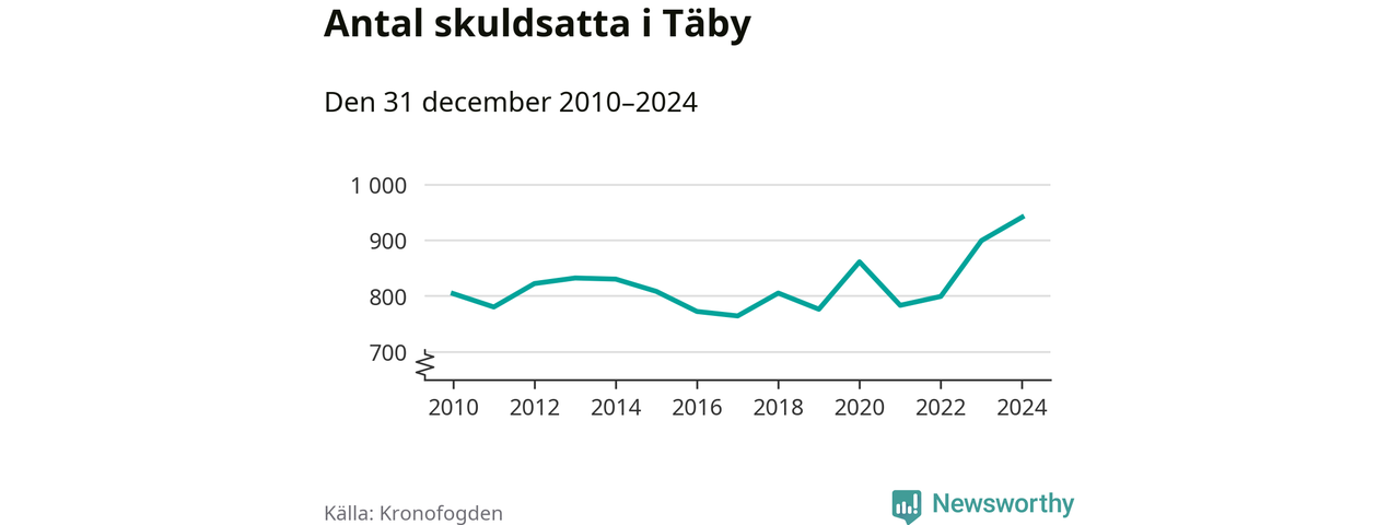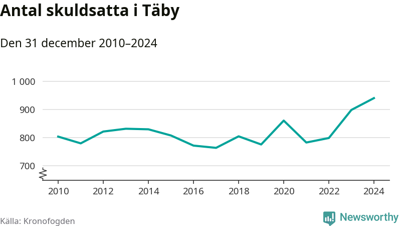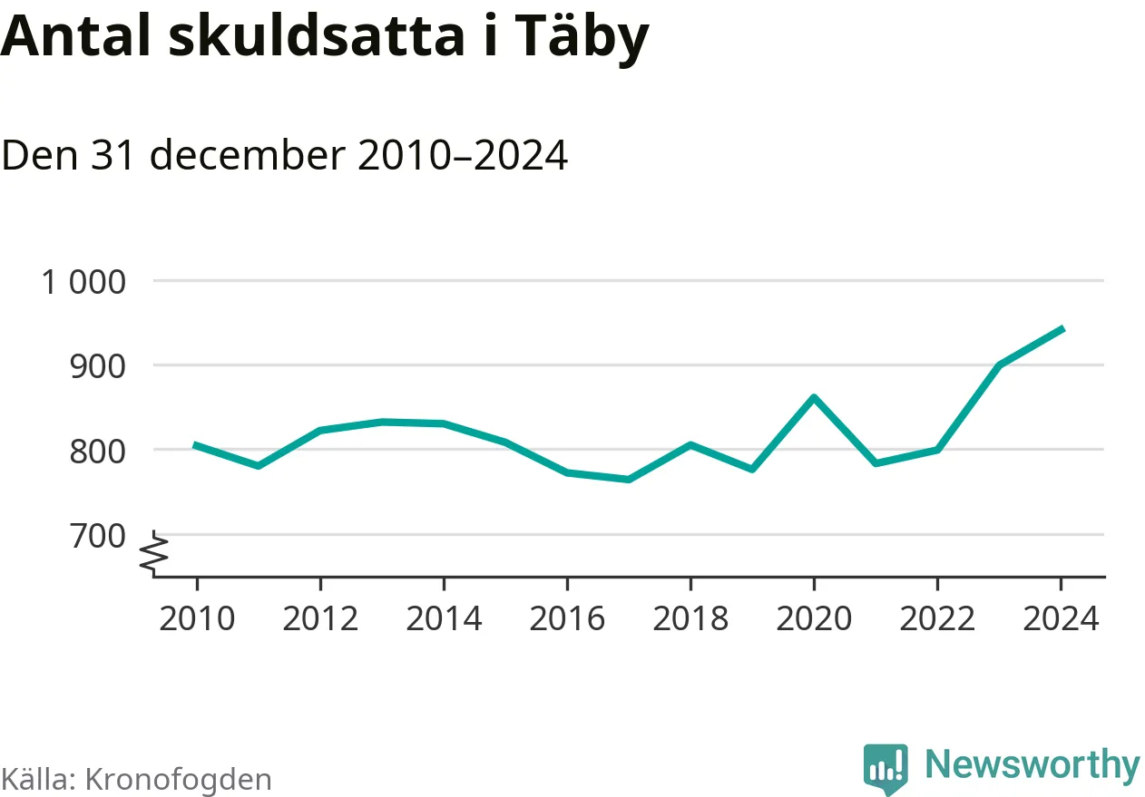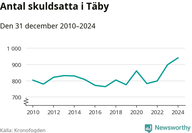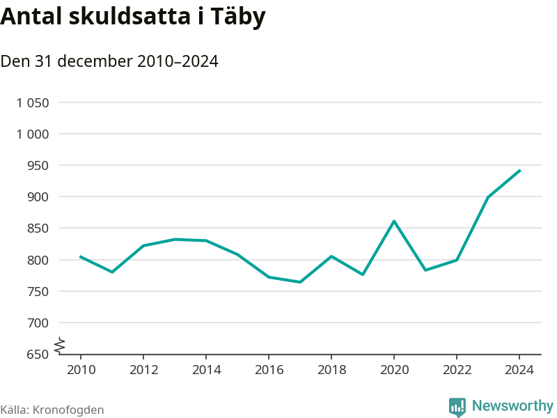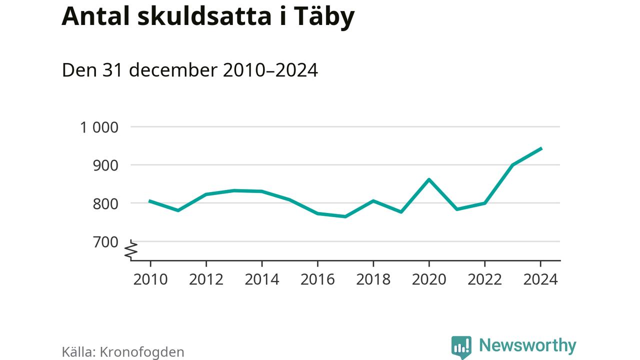 Inte sedan åtminstone 2010 har så många Täbybor hamnat hos Kronofogden. Vid årskiftet var 941 invånare i kommunen skyldiga totalt 386,3 miljoner kronor. Det är en ökning med 42 personer – eller 5 procent – jämfört med året innan.
