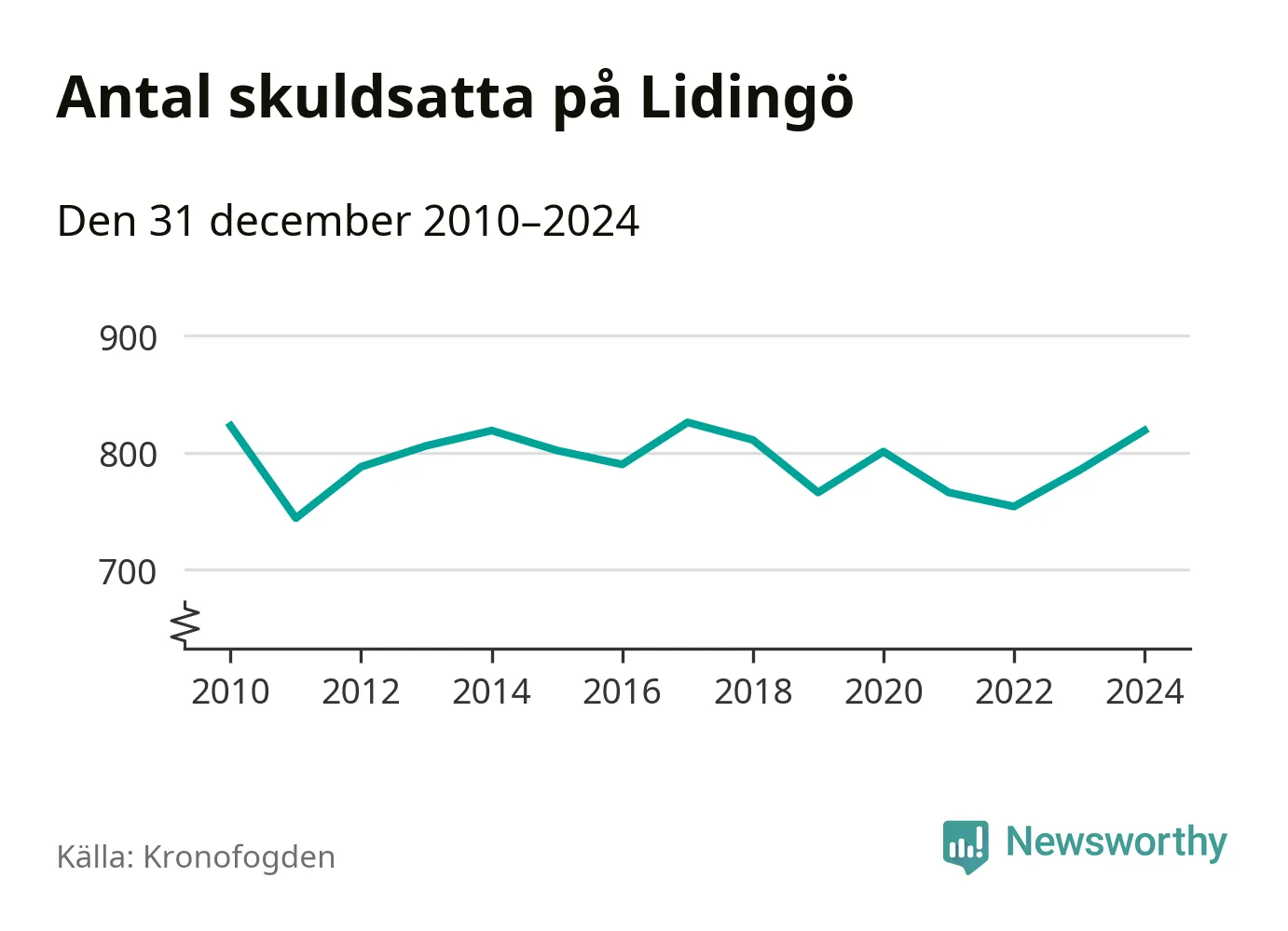 Vid årskiftet var 2 procent av alla Lidingöbor över 18 år registrerade hos Kronofogden. Störst andel skuldsatta i länet finns i Sigtuna (6 procent), medan den lägsta andelen finns i Danderyd (1 procent).