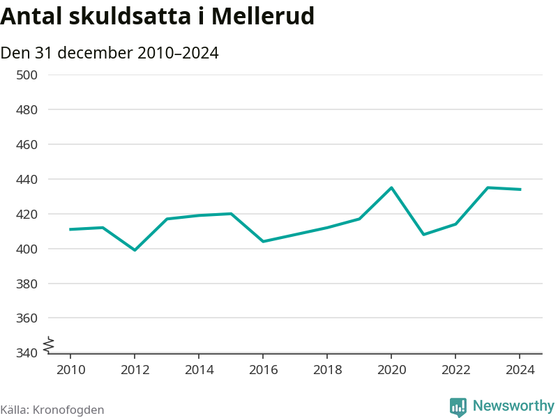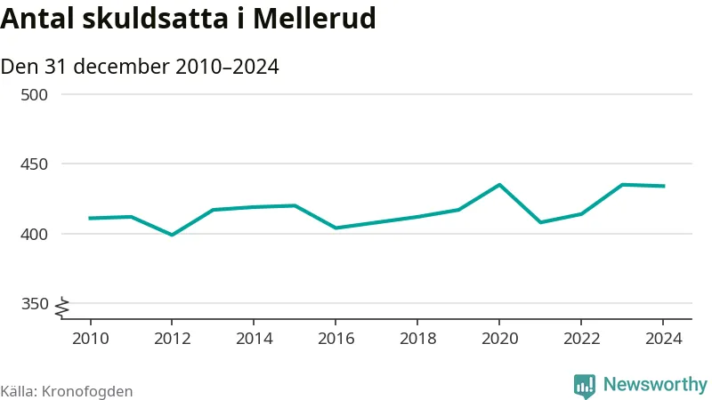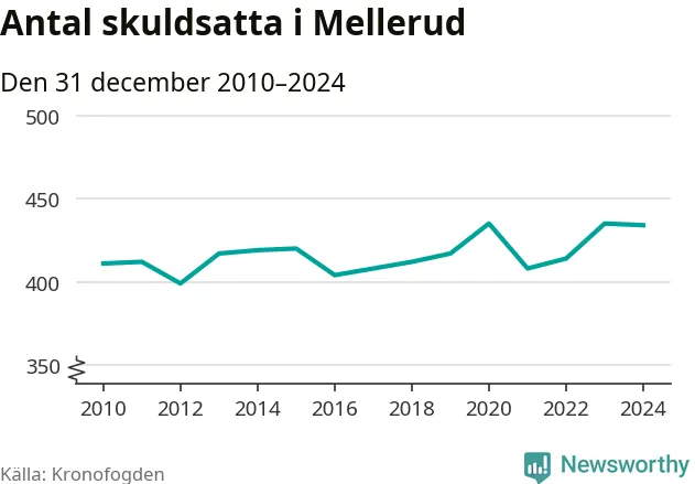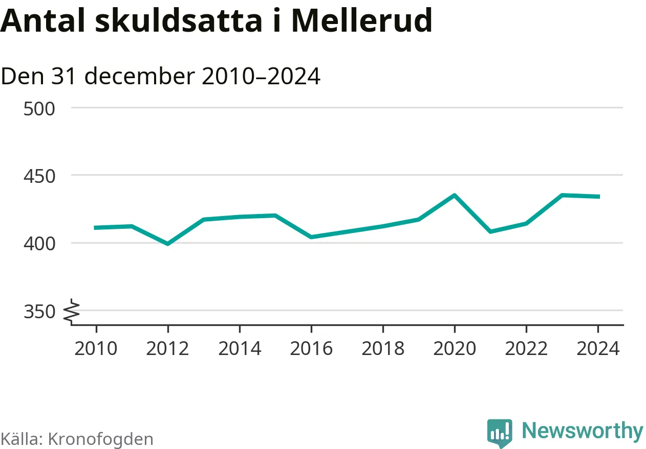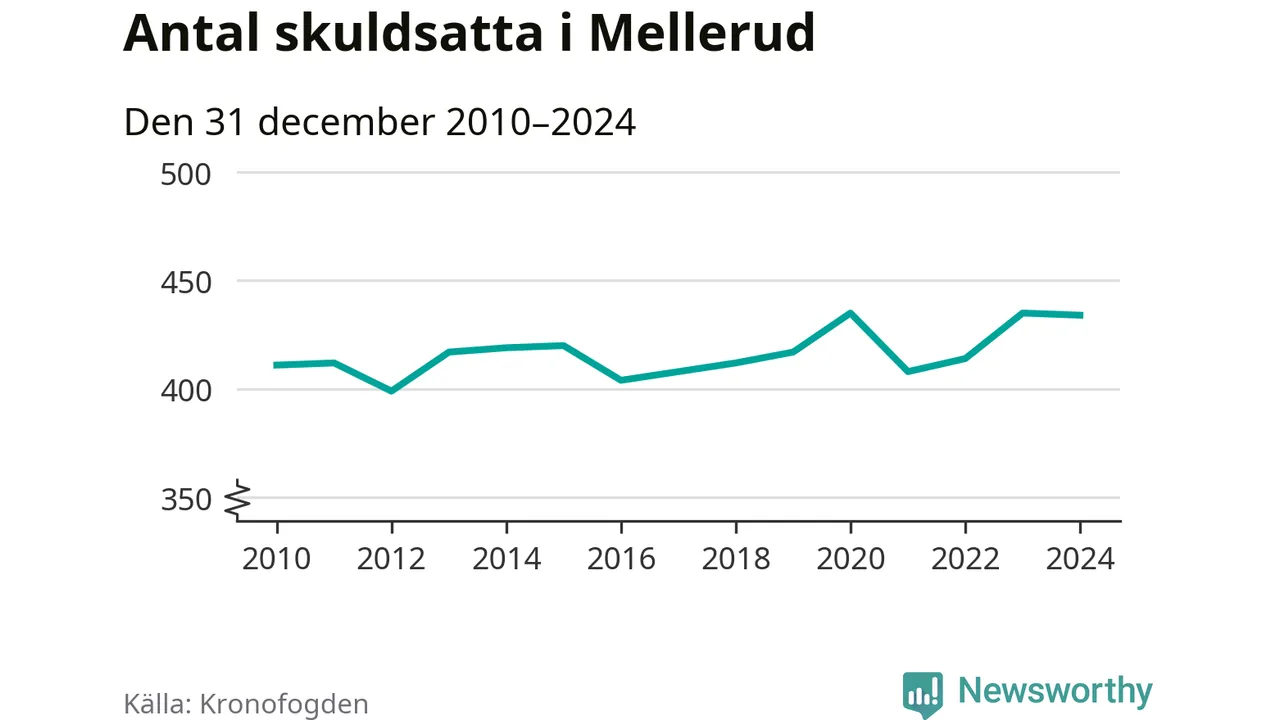 Vid årskiftet var 6 procent av alla Mellerudsbor över 18 år registrerade hos Kronofogden. Störst andel skuldsatta i länet finns i Färgelanda (7 procent), medan den lägsta andelen finns på Öckerö (2 procent).