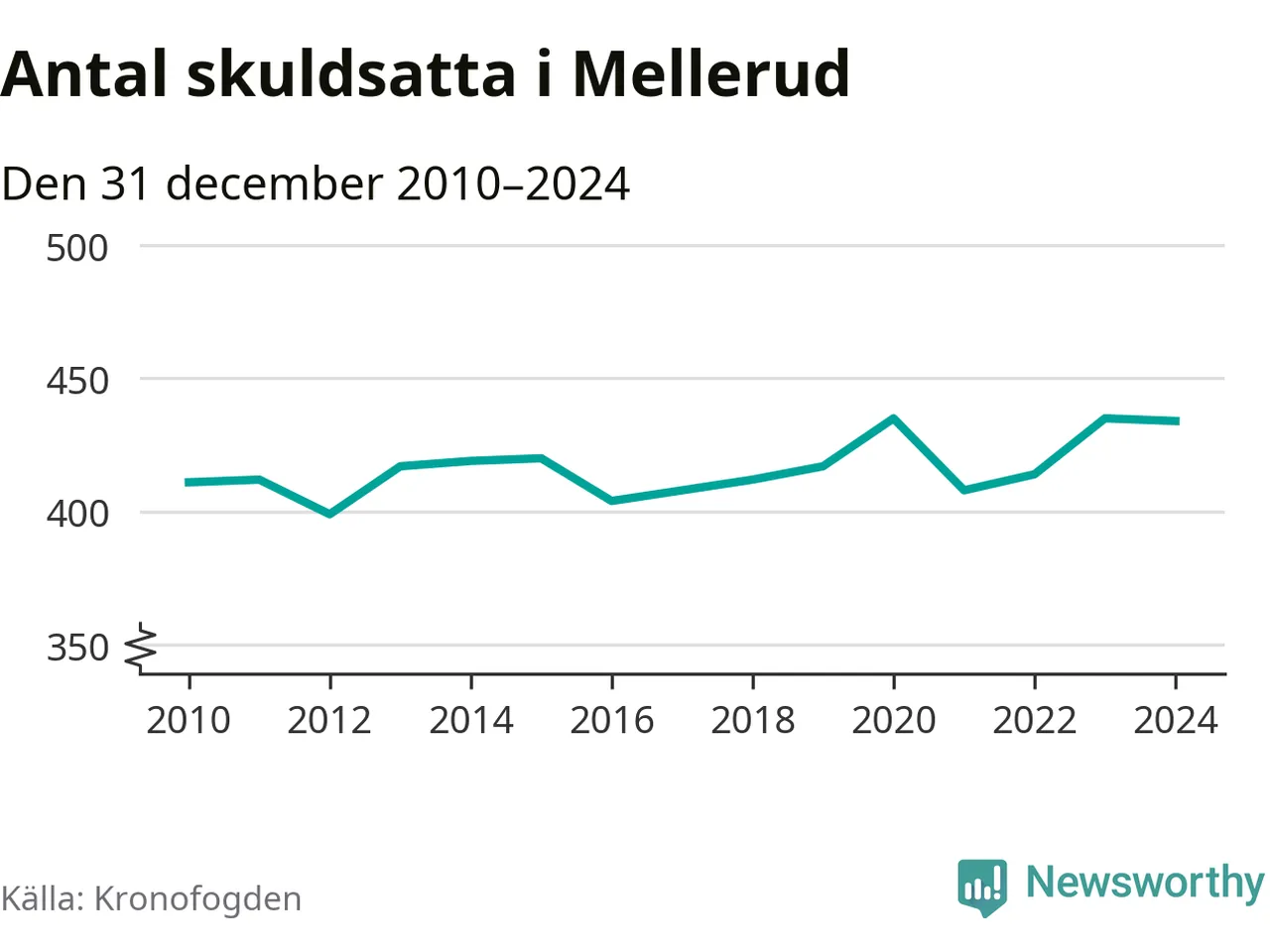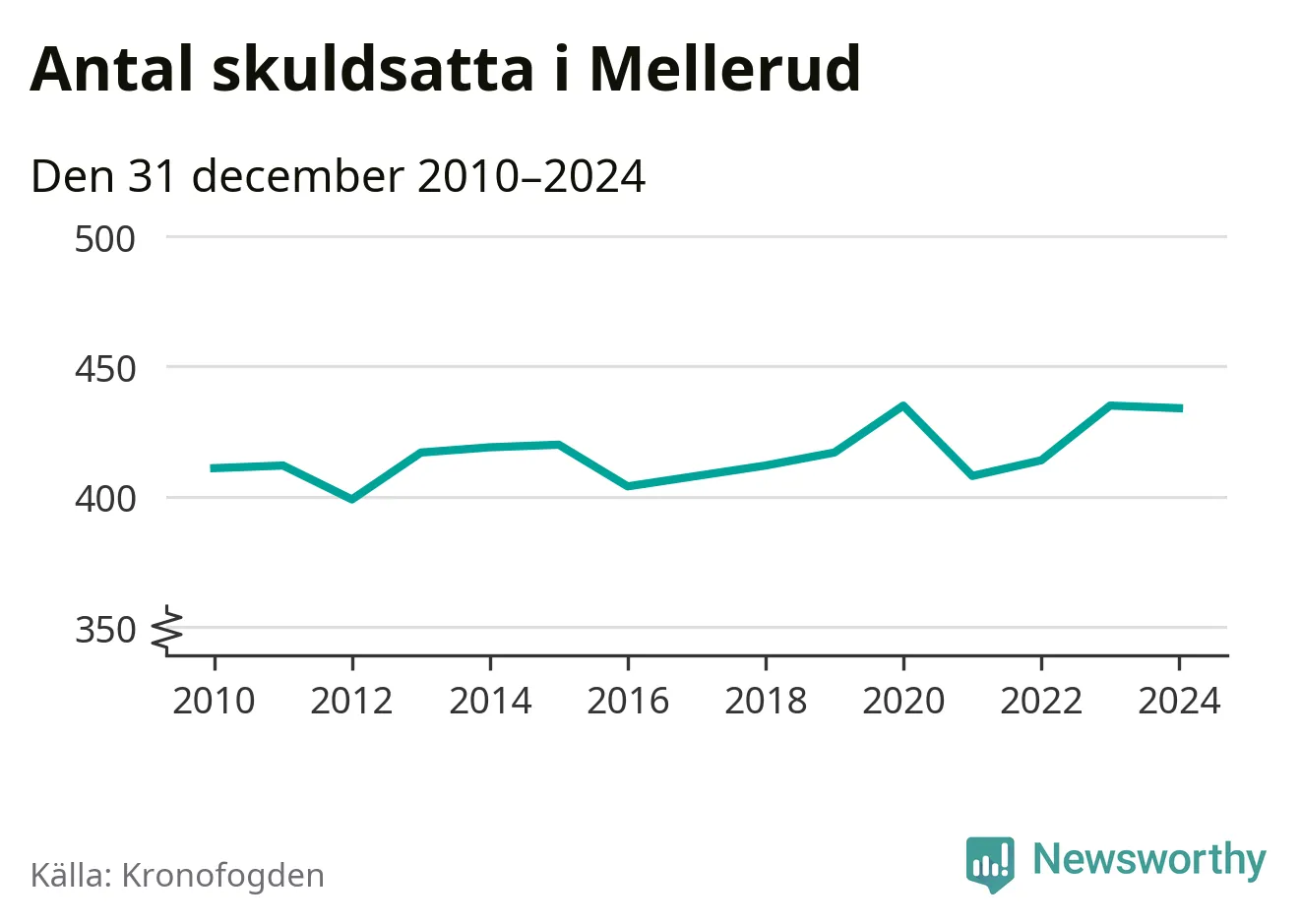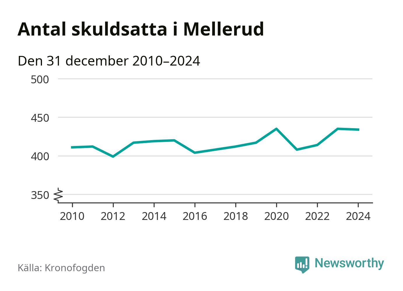 Vid årskiftet var 6 procent av alla Mellerudsbor över 18 år registrerade hos Kronofogden. Störst andel skuldsatta i länet finns i Färgelanda (7 procent), medan den lägsta andelen finns på Öckerö (2 procent).