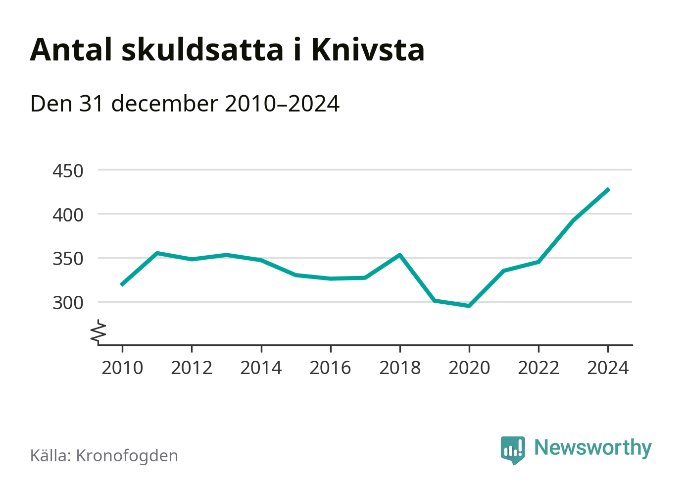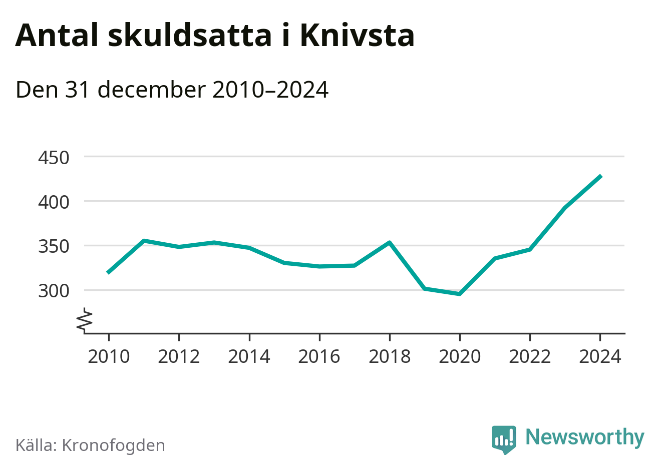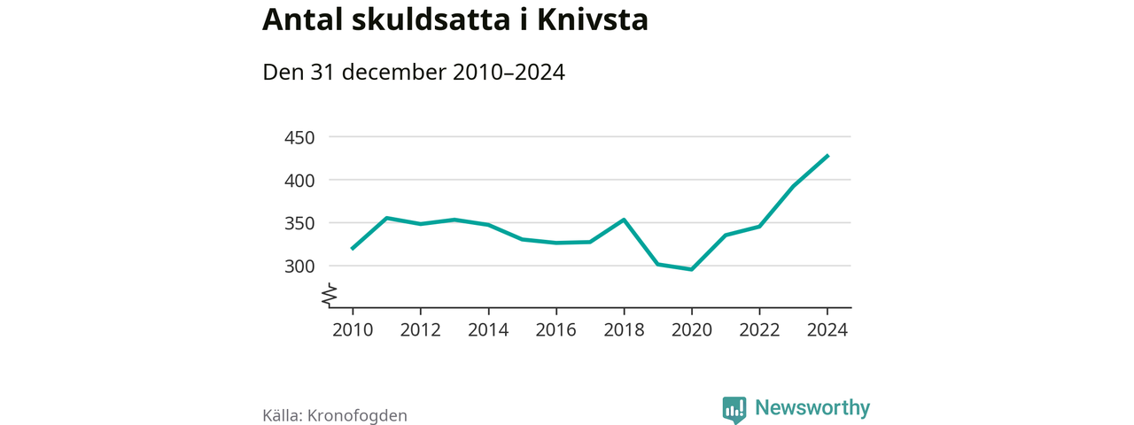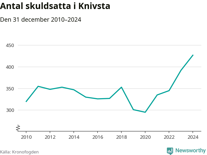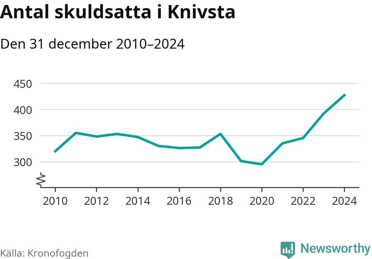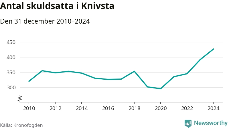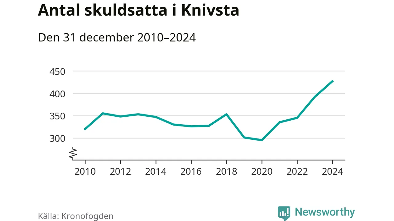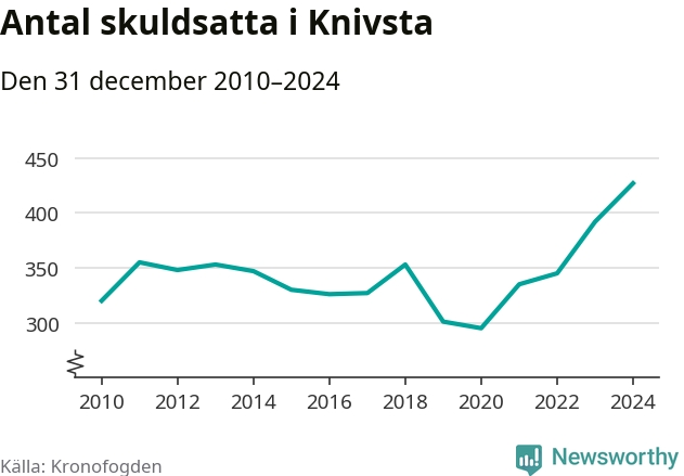 Inte sedan åtminstone 2010 har så många Knivstabor hamnat hos Kronofogden. Vid årskiftet var 427 invånare i kommunen skyldiga totalt 135,8 miljoner kronor. Det är en ökning med 35 personer – eller 9 procent – jämfört med året innan.