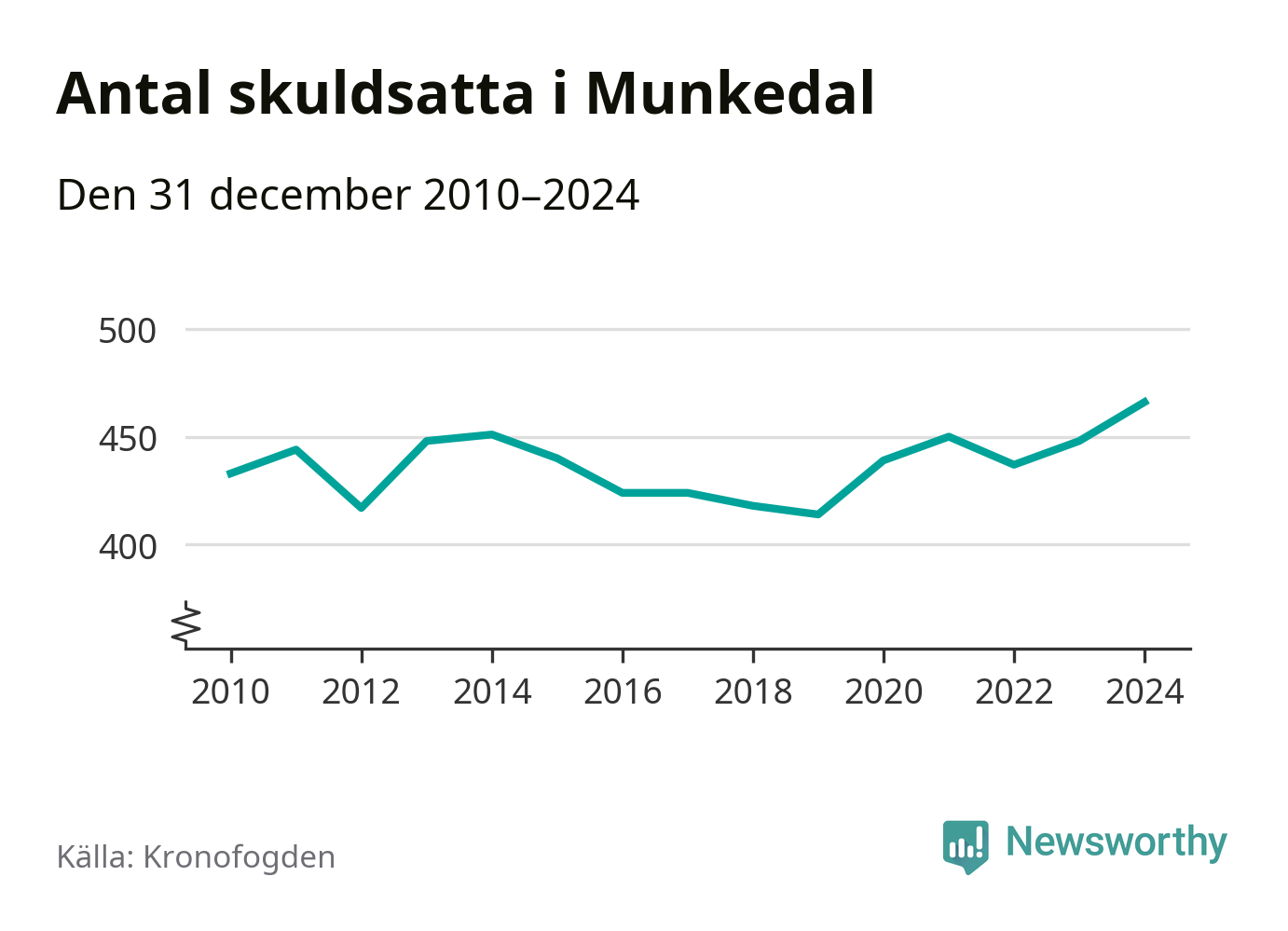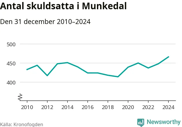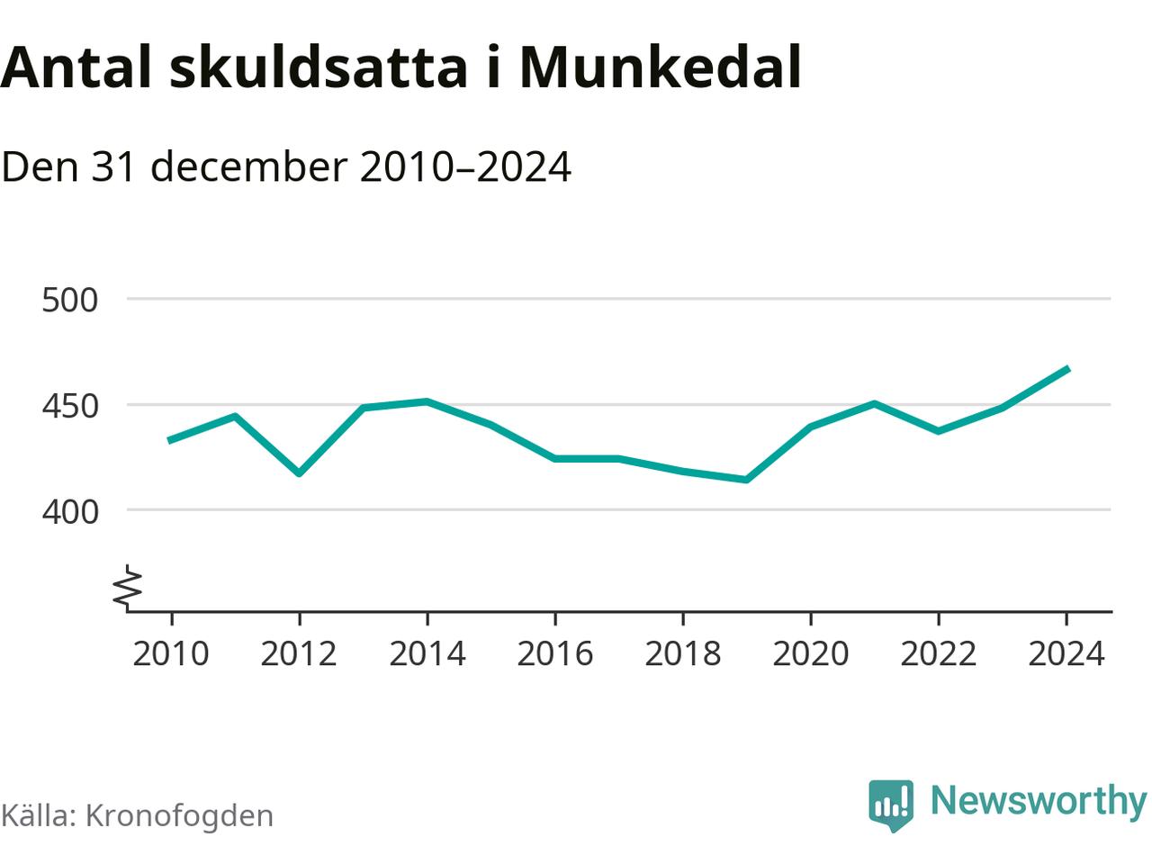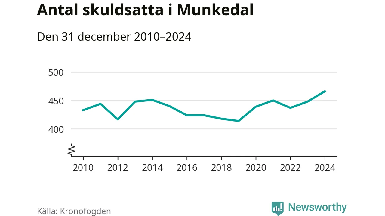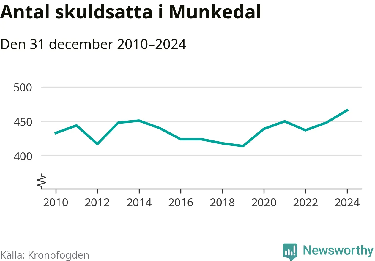 Inte sedan åtminstone 2010 har så många Munkedalsbor hamnat hos Kronofogden. Vid årskiftet var 466 invånare i kommunen skyldiga totalt 132,7 miljoner kronor. Det är en ökning med 18 personer – eller 4 procent – jämfört med året innan.