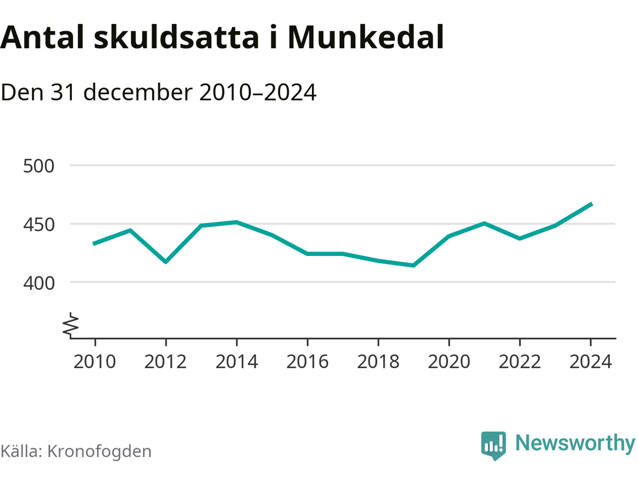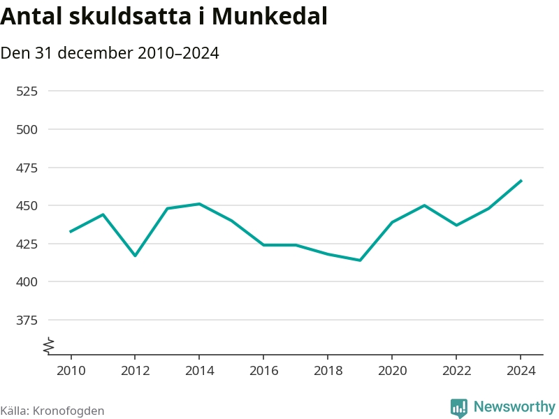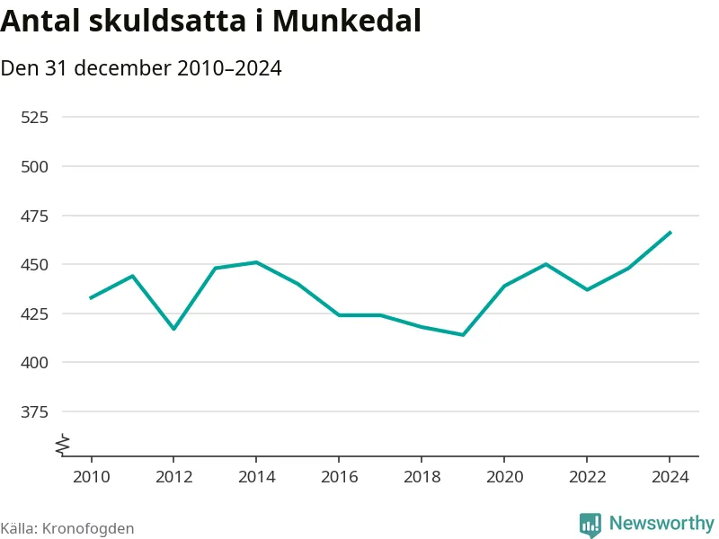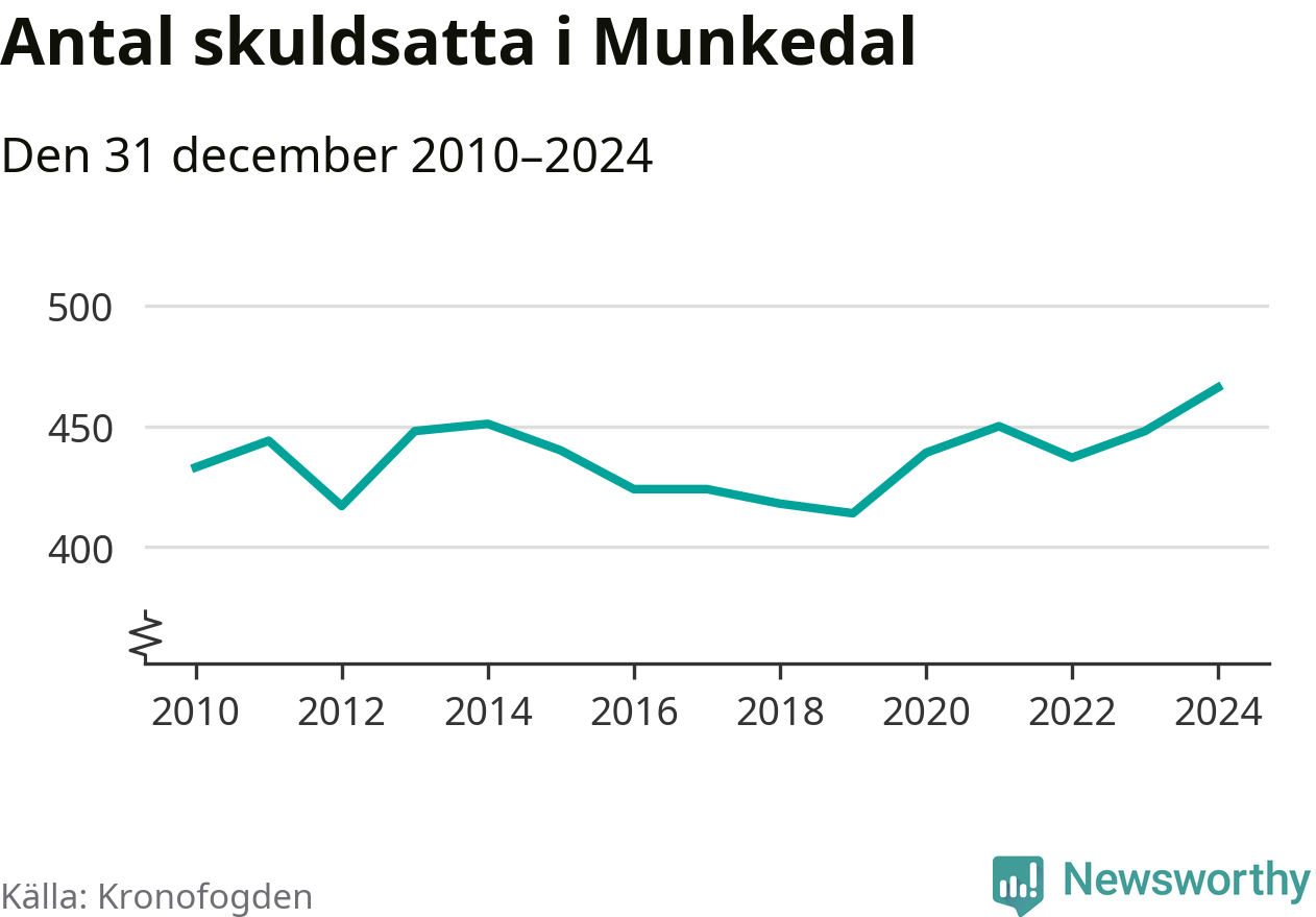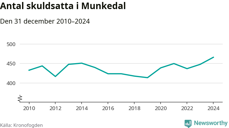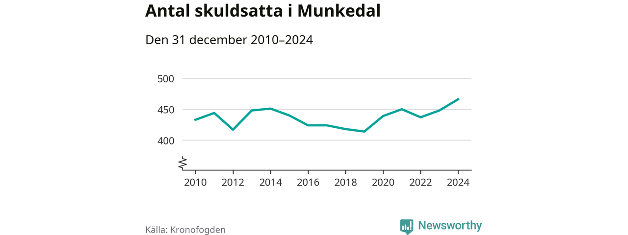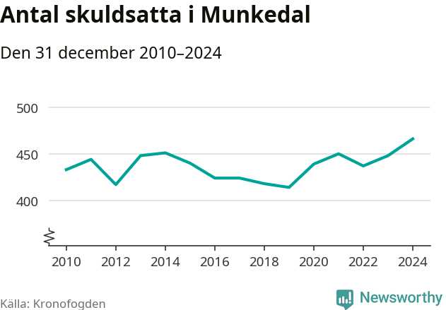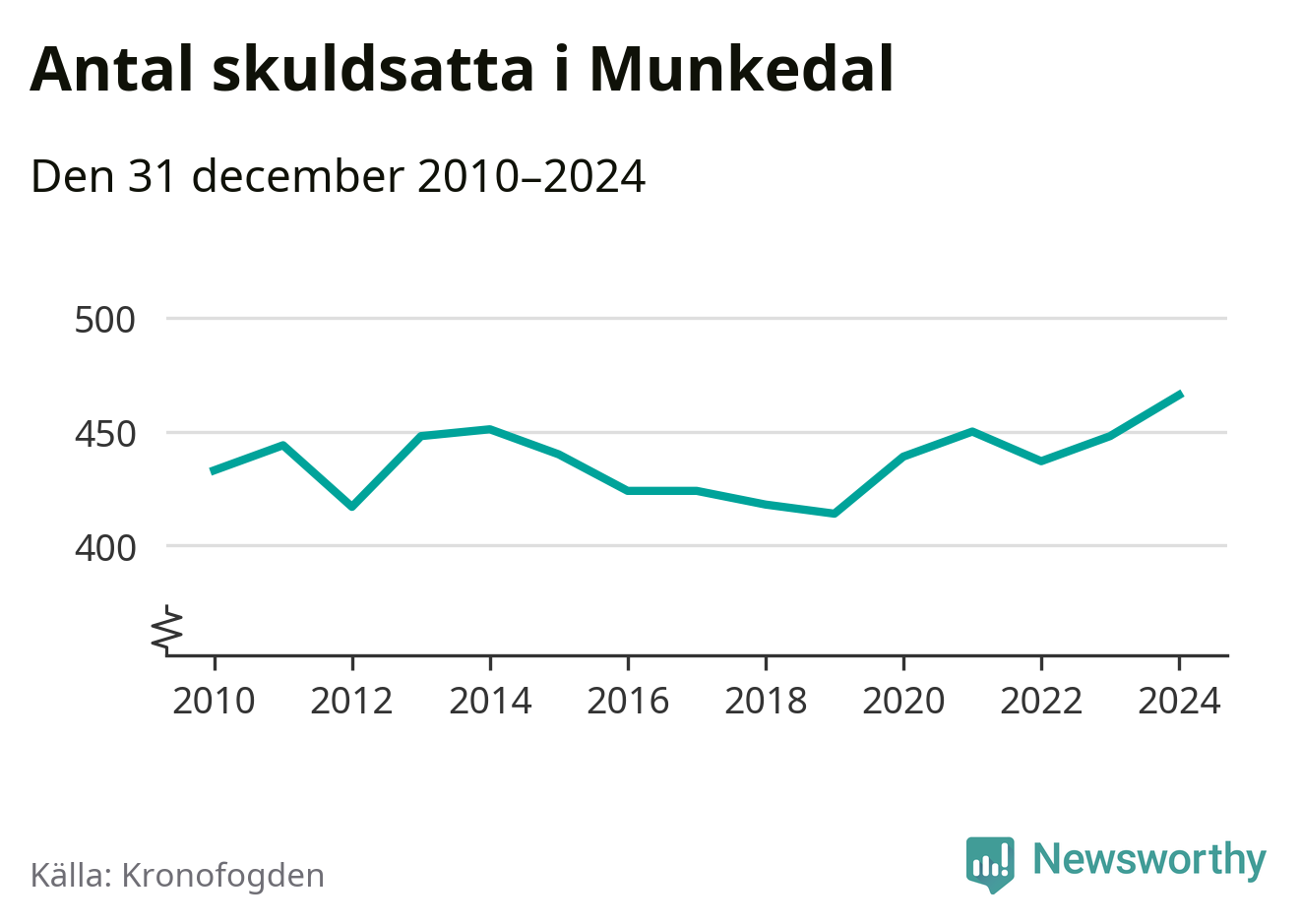 Inte sedan åtminstone 2010 har så många Munkedalsbor hamnat hos Kronofogden. Vid årskiftet var 466 invånare i kommunen skyldiga totalt 132,7 miljoner kronor. Det är en ökning med 18 personer – eller 4 procent – jämfört med året innan.