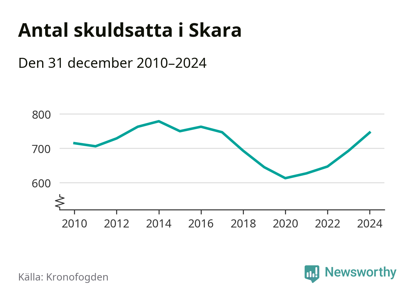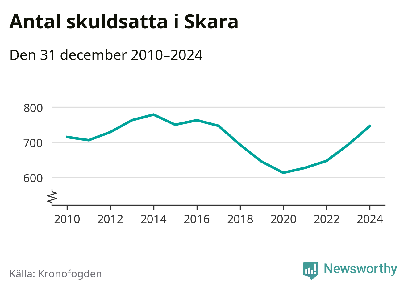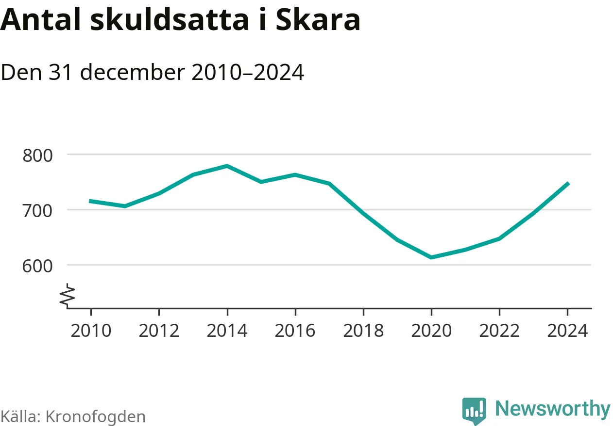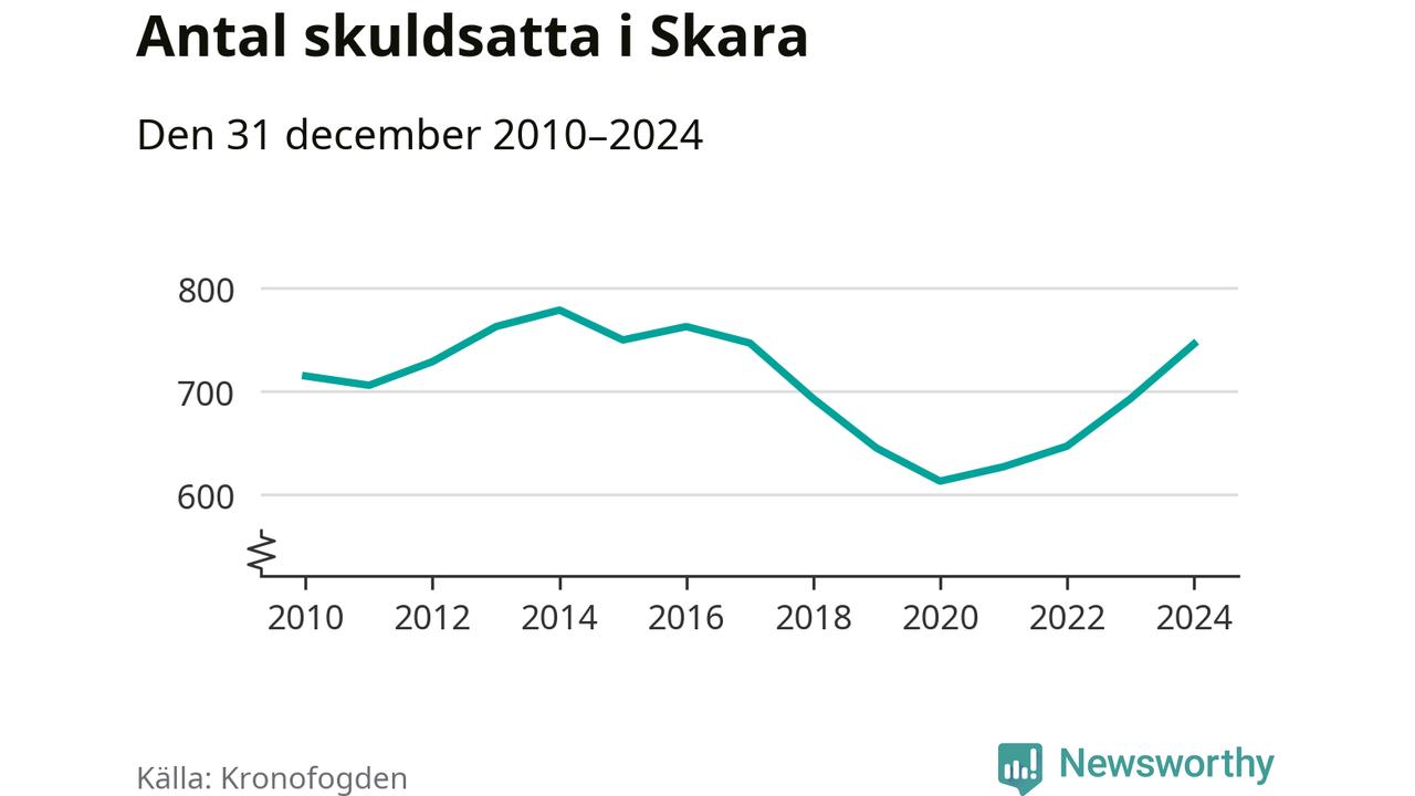 Allt fler Skarabor hamnar hos Kronofogden. Vid årskiftet var 746 invånare i kommunen skyldiga totalt 200,7 miljoner kronor. Det är en ökning med 53 personer – eller 8 procent – jämfört med året innan.