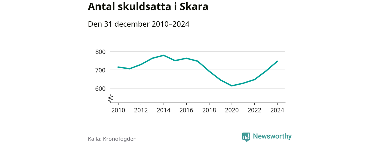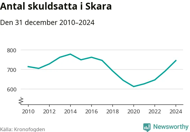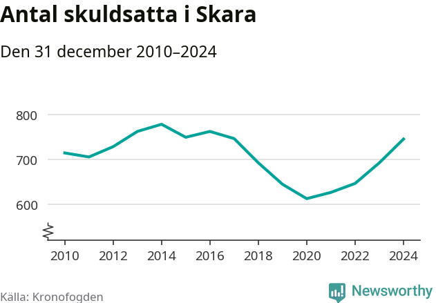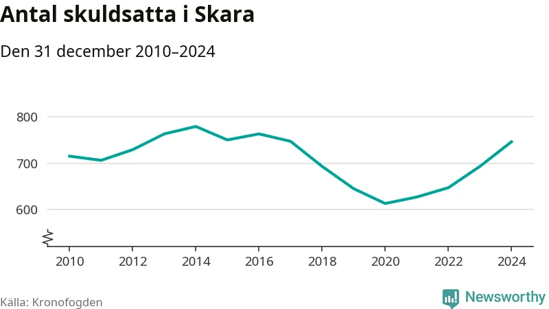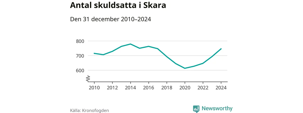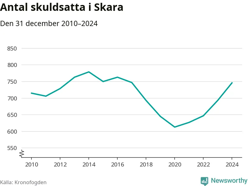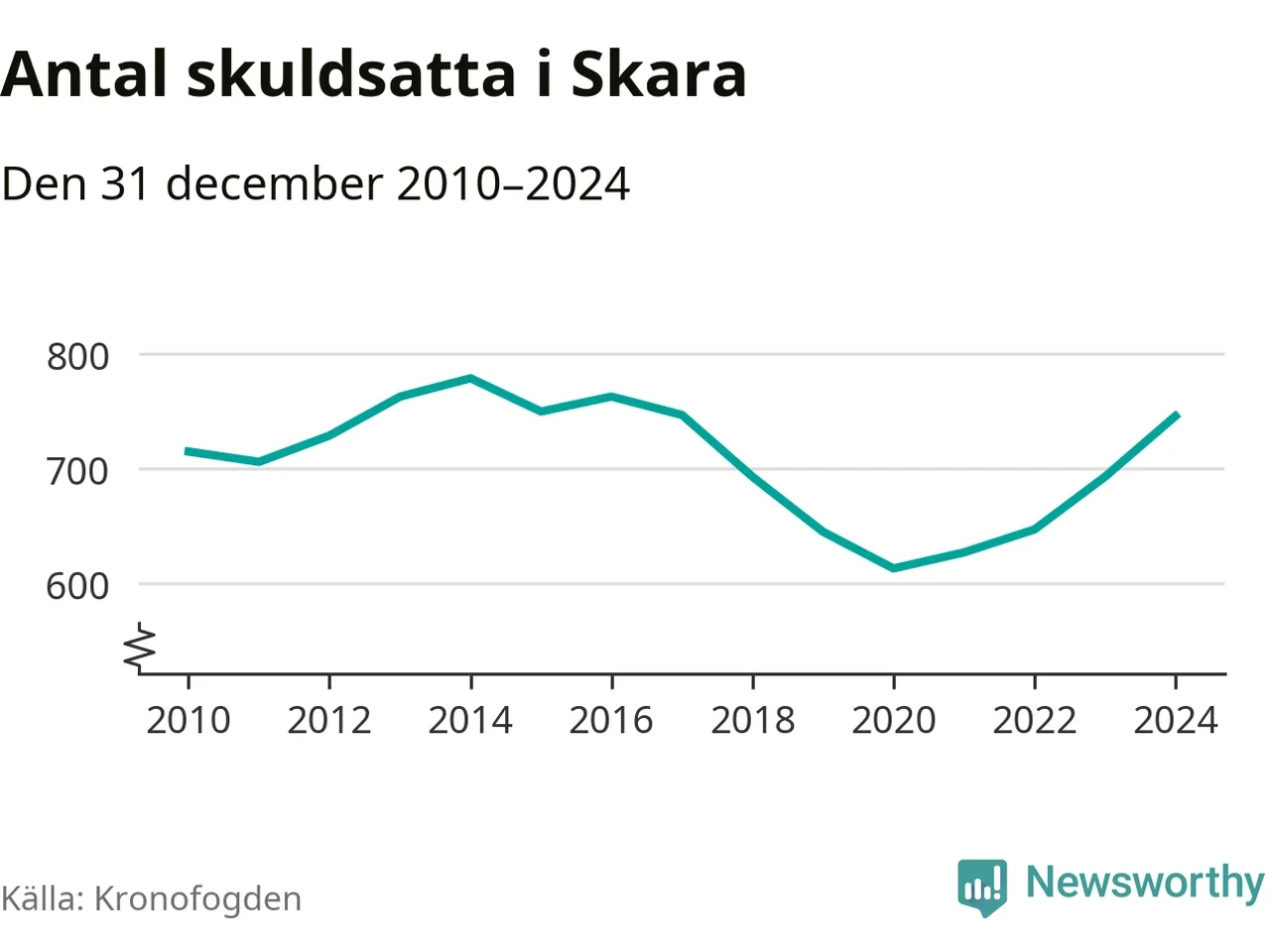 Allt fler Skarabor hamnar hos Kronofogden. Vid årskiftet var 746 invånare i kommunen skyldiga totalt 200,7 miljoner kronor. Det är en ökning med 53 personer – eller 8 procent – jämfört med året innan.