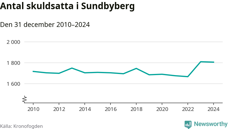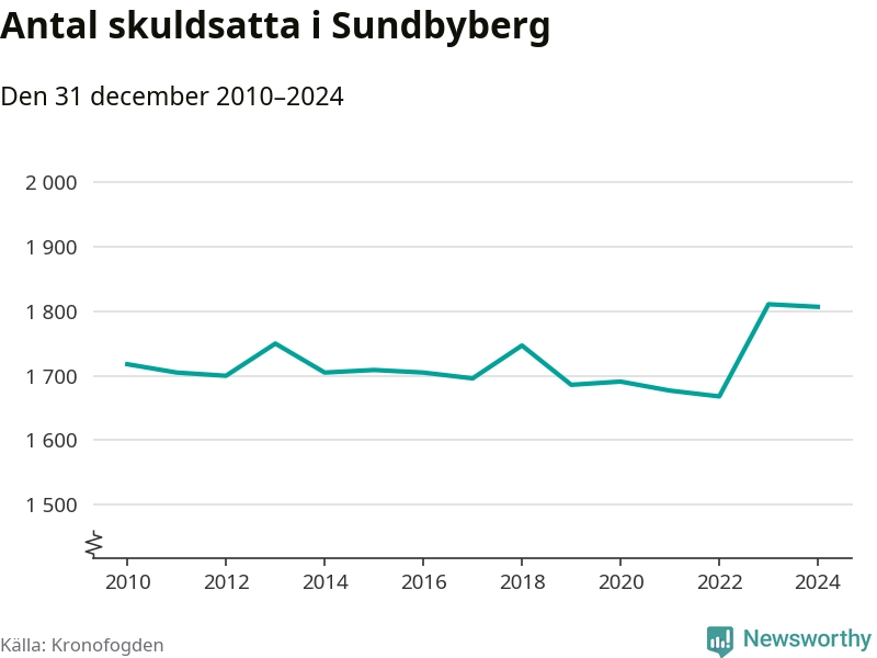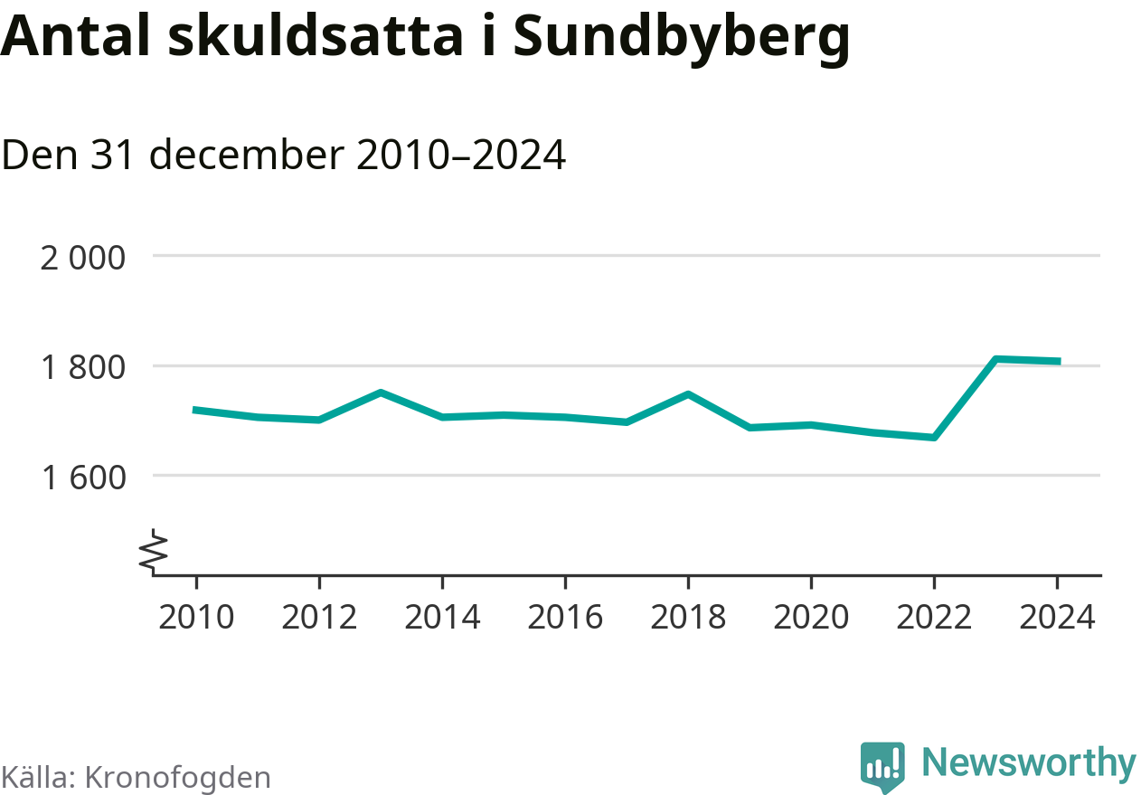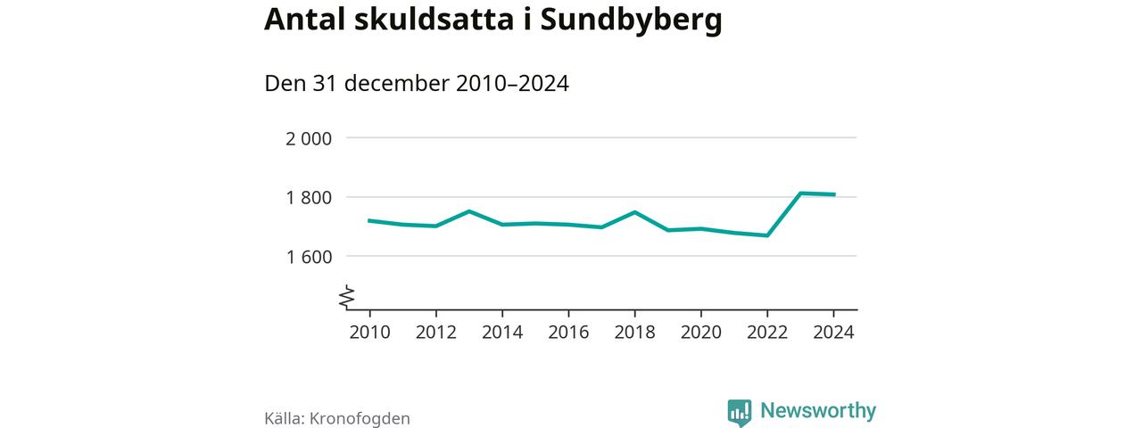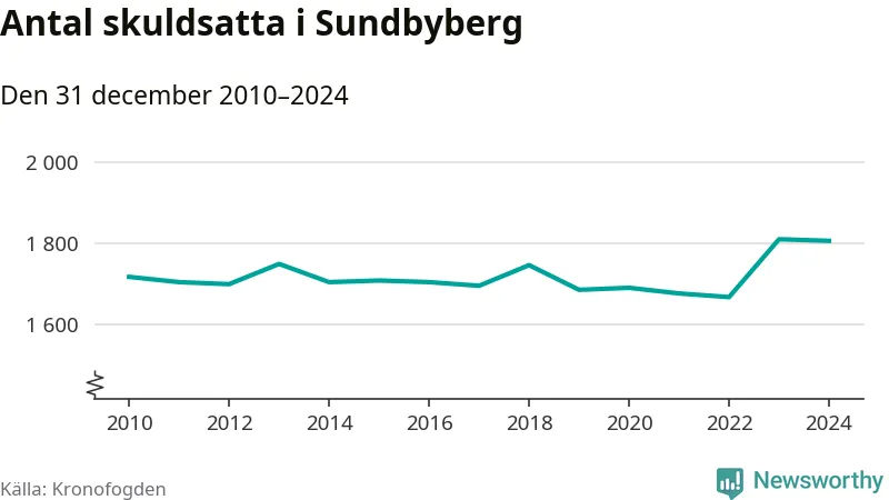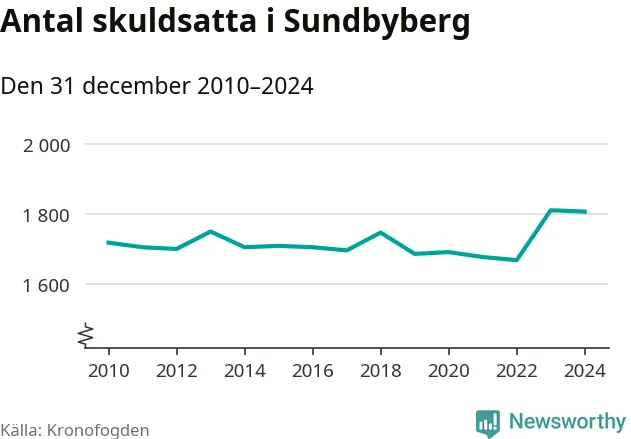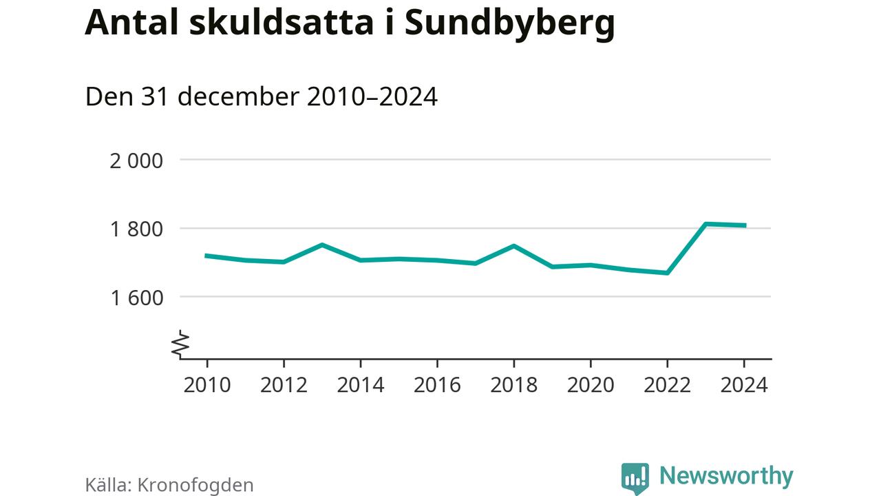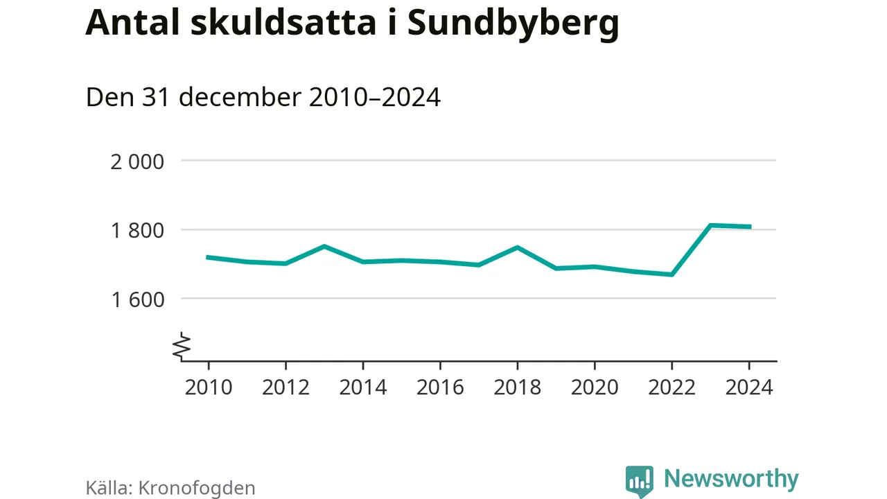 Vid årskiftet var 4 procent av alla Sundbybergsbor över 18 år registrerade hos Kronofogden. Störst andel skuldsatta i länet finns i Sigtuna (6 procent), medan den lägsta andelen finns i Danderyd (1 procent).