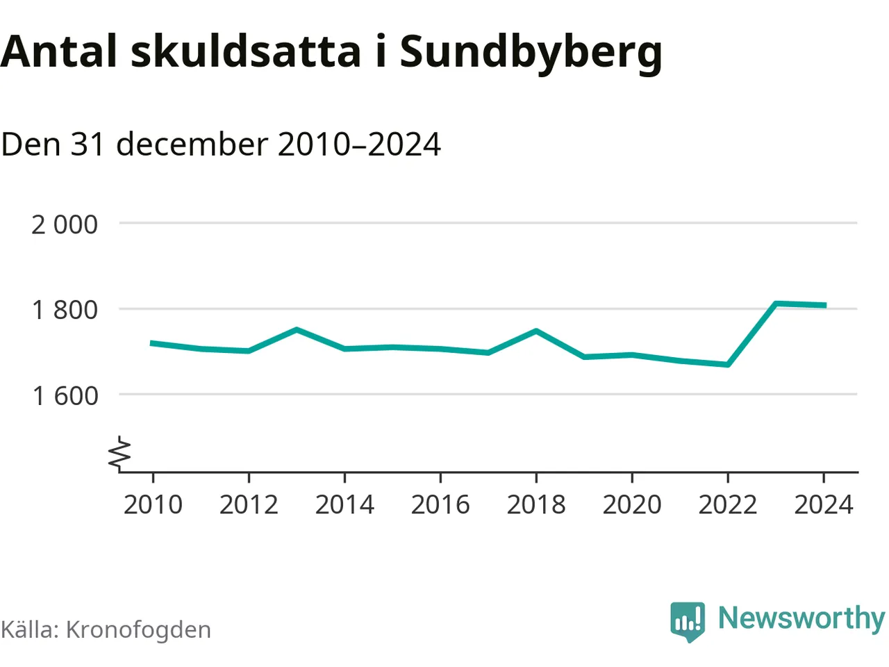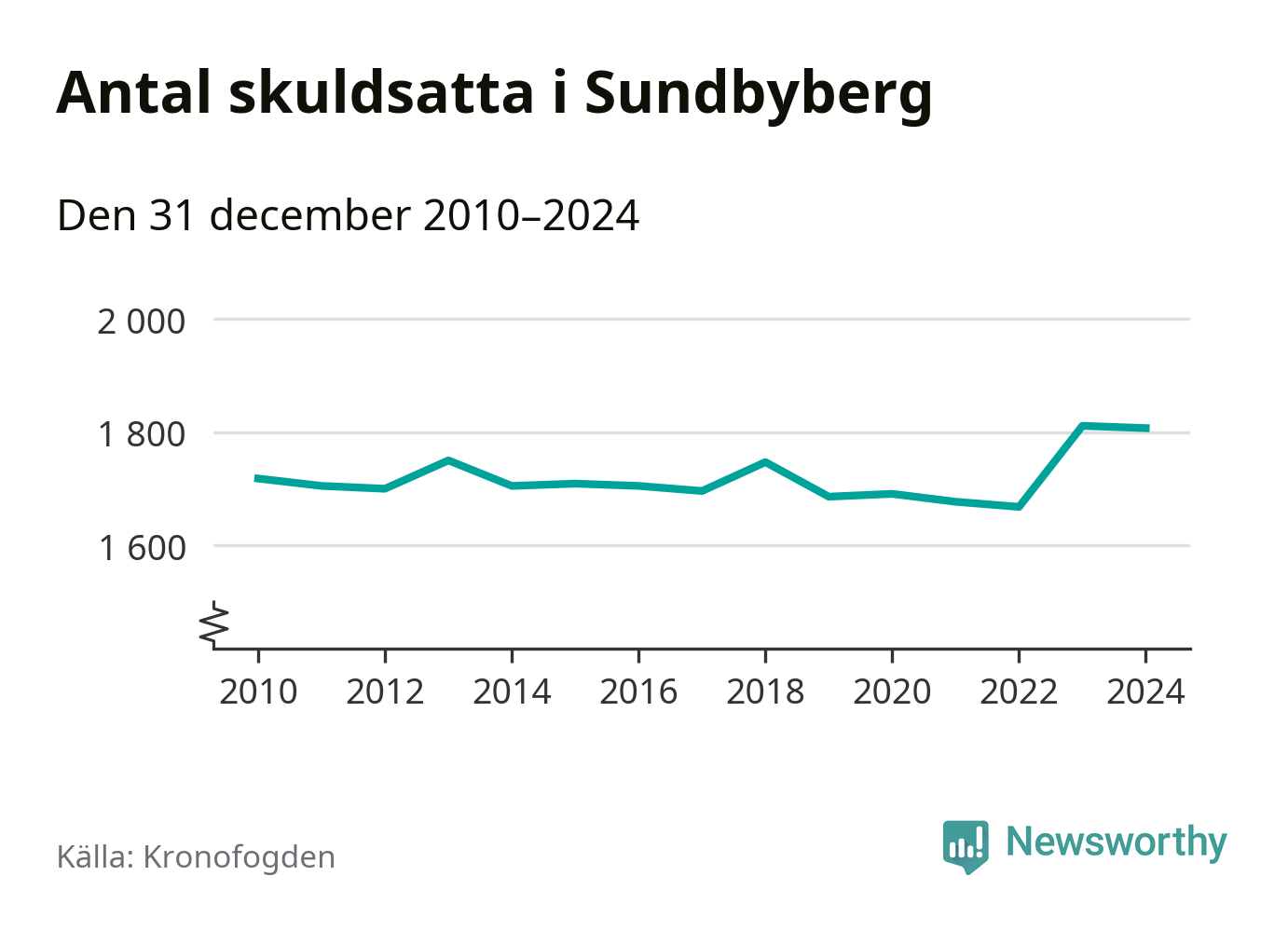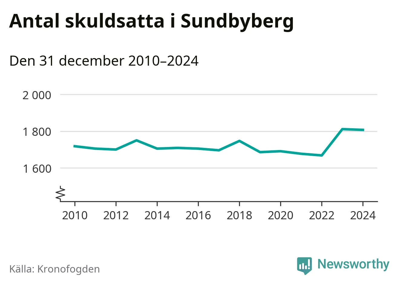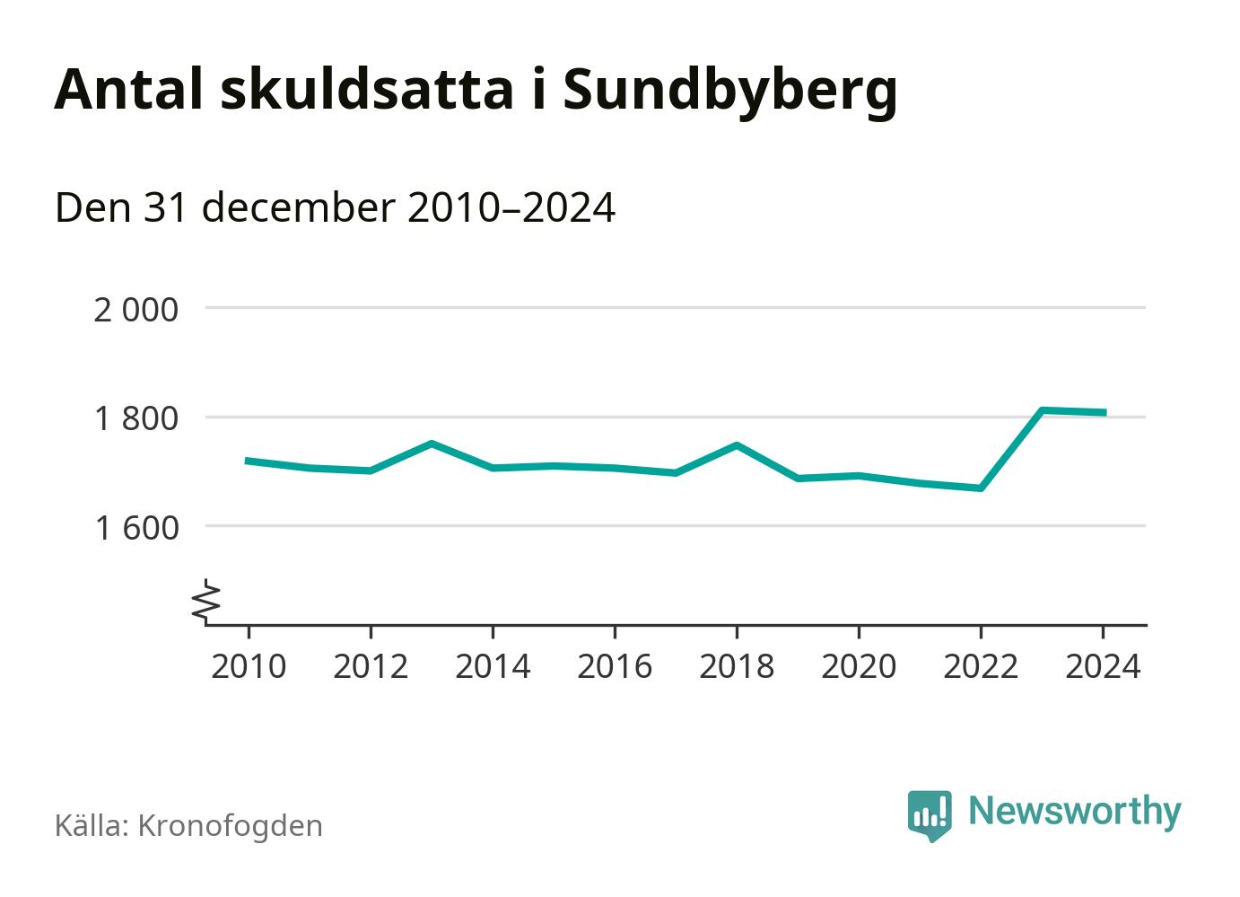 Vid årskiftet var 4 procent av alla Sundbybergsbor över 18 år registrerade hos Kronofogden. Störst andel skuldsatta i länet finns i Sigtuna (6 procent), medan den lägsta andelen finns i Danderyd (1 procent).