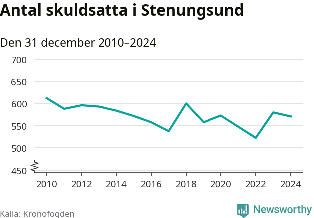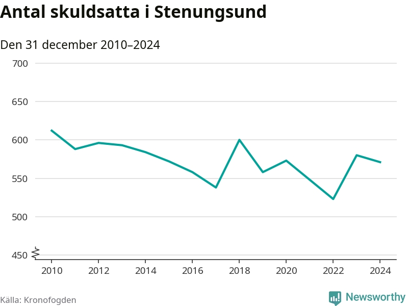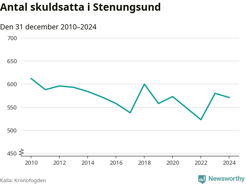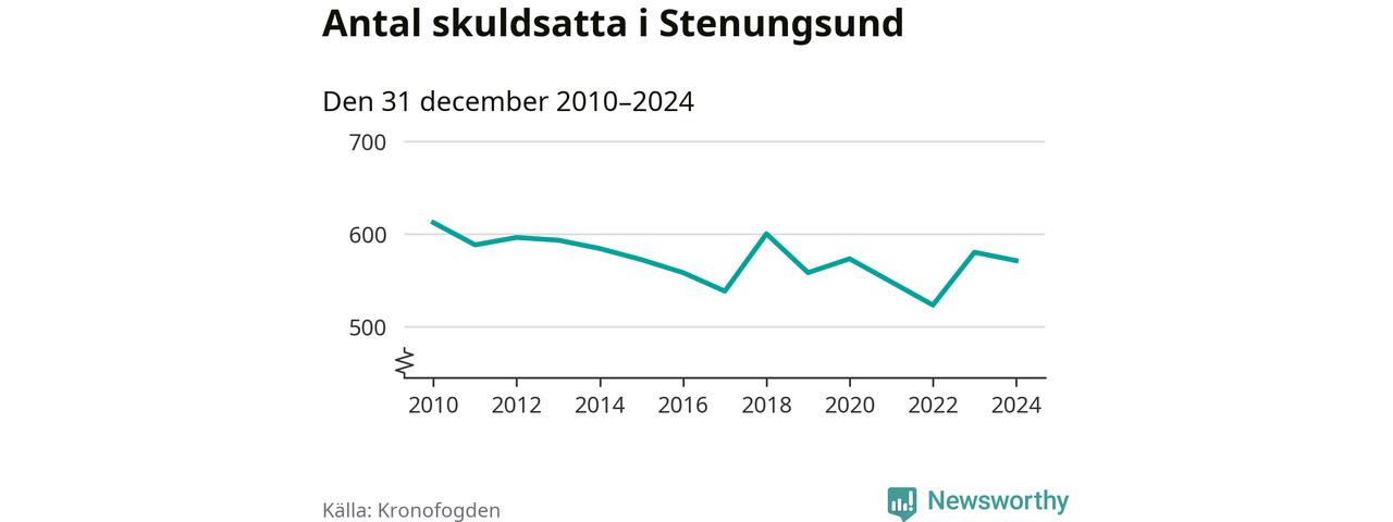 Vid årskiftet var 3 procent av alla Stenungsundsbor över 18 år registrerade hos Kronofogden. Störst andel skuldsatta i länet finns i Färgelanda (7 procent), medan den lägsta andelen finns på Öckerö (2 procent).