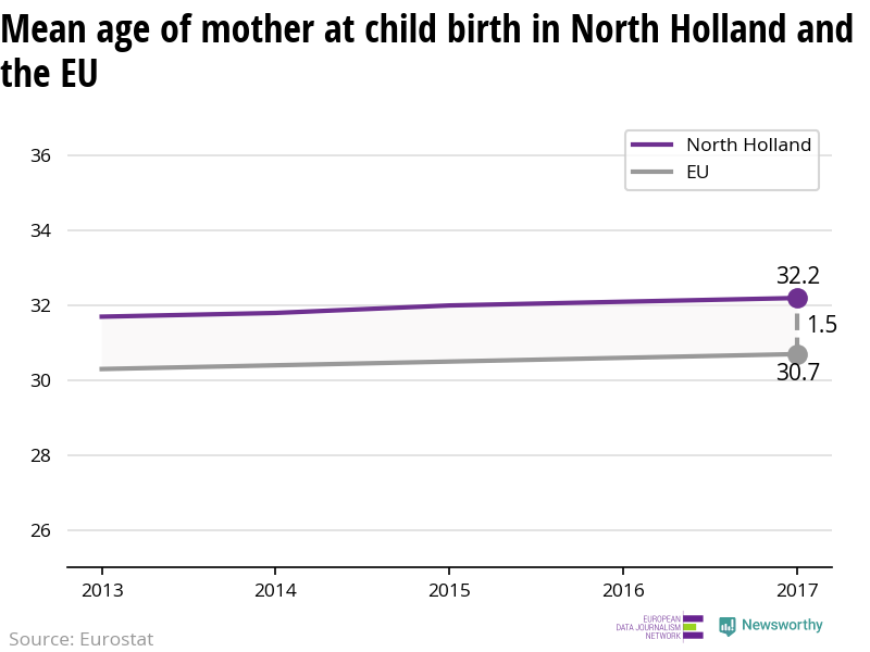 Women in North Holland have children on average when they are 32.2 years old, which is older than most regions in Europe.