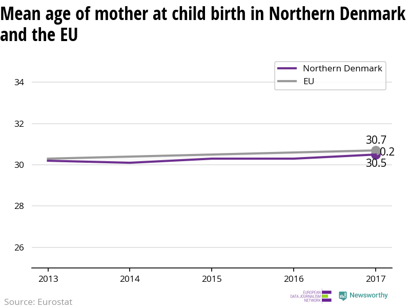 Women in Northern Denmark have children on average when they are 30.5 years old, which is roughly on par with the average across Europe.