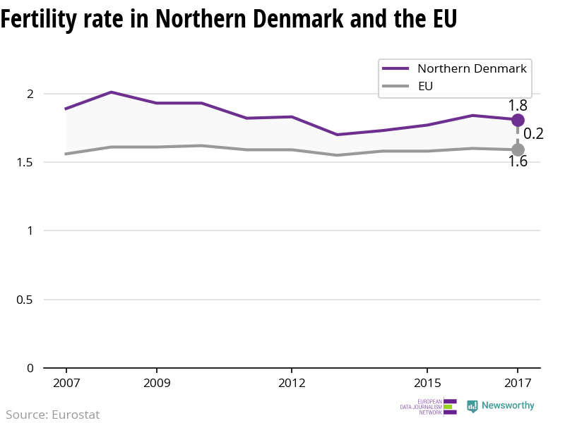 Northern Denmark has a relatively high fertility rate compared with the rest of Europe, as each woman gives birth to on average 1.81 children, based on the latest figures from 2017. However, in the last five years, fertility rates have fallen, from 1.83 children per woman in 2012.