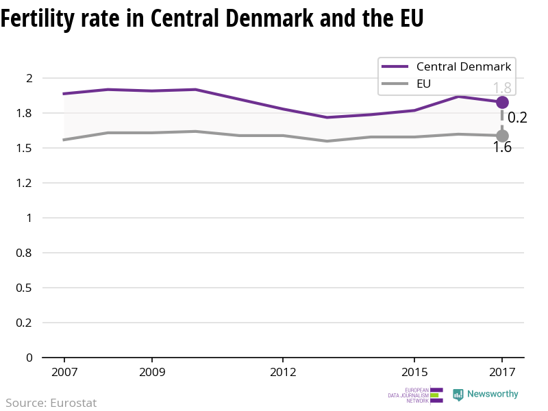 Central Denmark has a relatively high fertility rate compared with the rest of Europe, as each woman gives birth to on average 1.83 children, based on the latest figures from 2017, and in the last five years, fertility rates have risen further, from 1.78 children per woman in 2012.