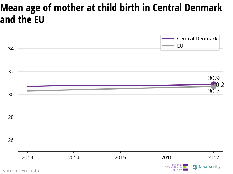 Women in Central Denmark have children on average when they are 30.9 years old, which is older than most regions in Europe.