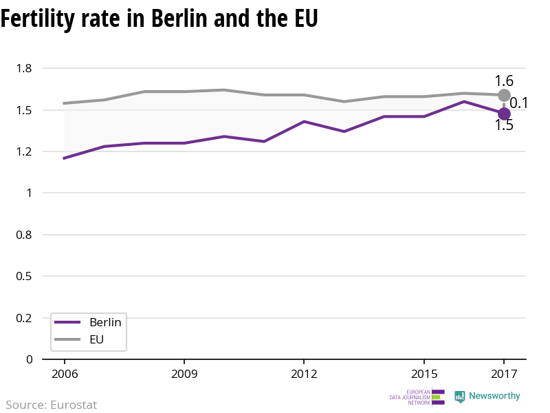 Berlin has the lowest fertility rate in Germany. Each woman gives birth to on average just 1.48 children, based on the latest figures from 2017. However, in the last five years, fertility rates have risen, from 1.43 children per woman in 2012.
