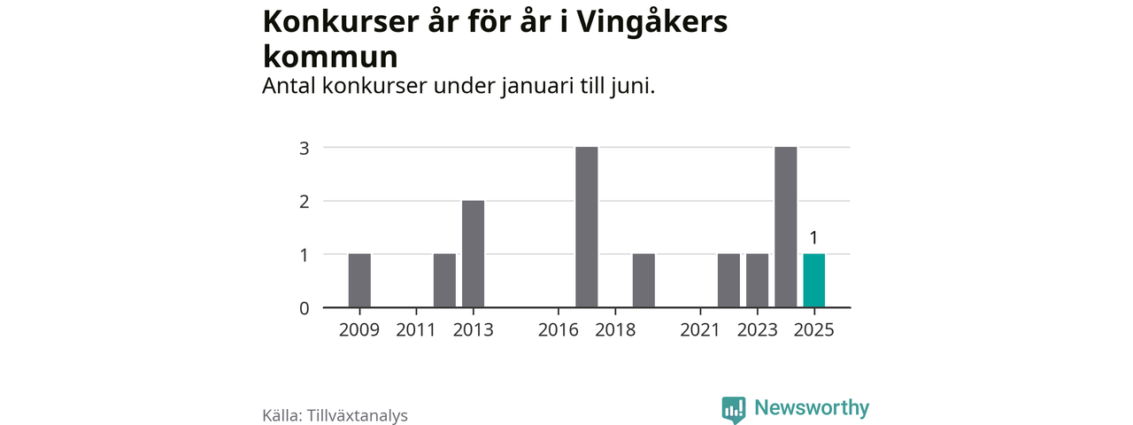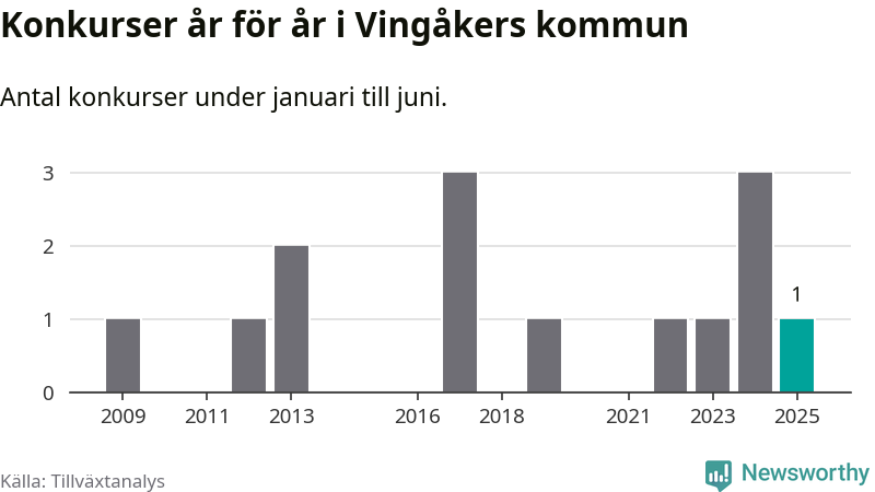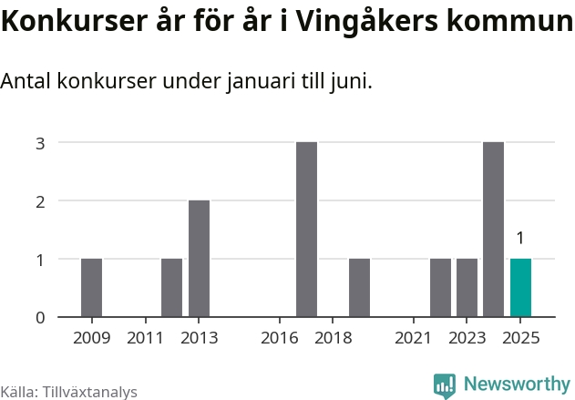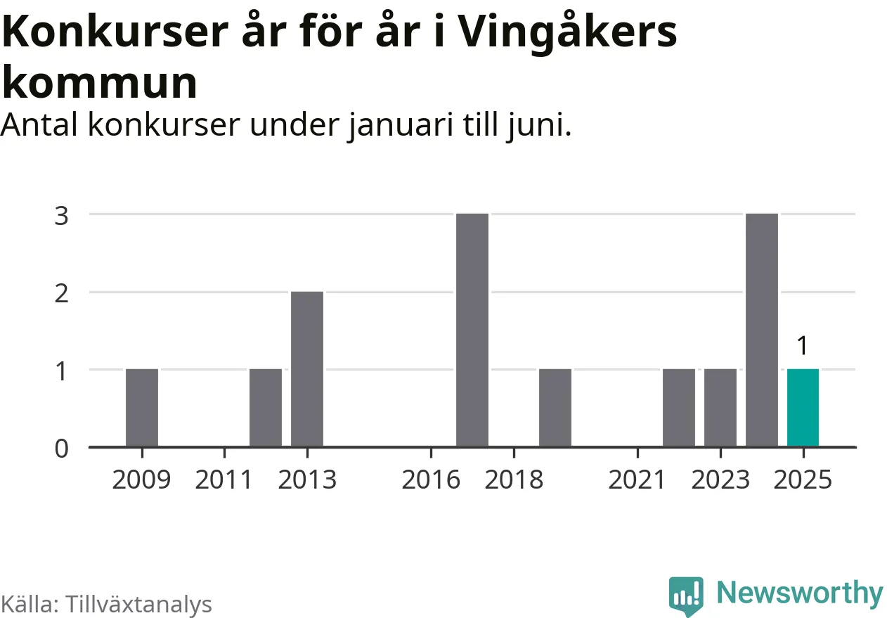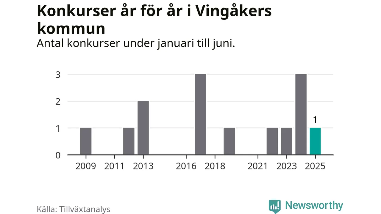 Mellan januari och juni har ett aktiebolag med arbetsställe i Vingåkers kommun gått i konkurs, enligt ny statistik från Tillväxtanalys.
