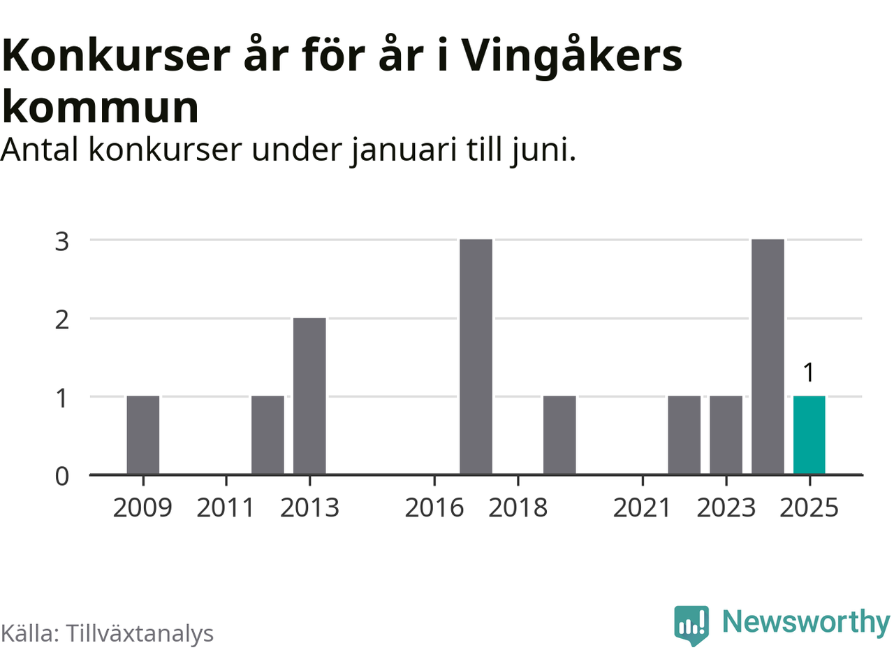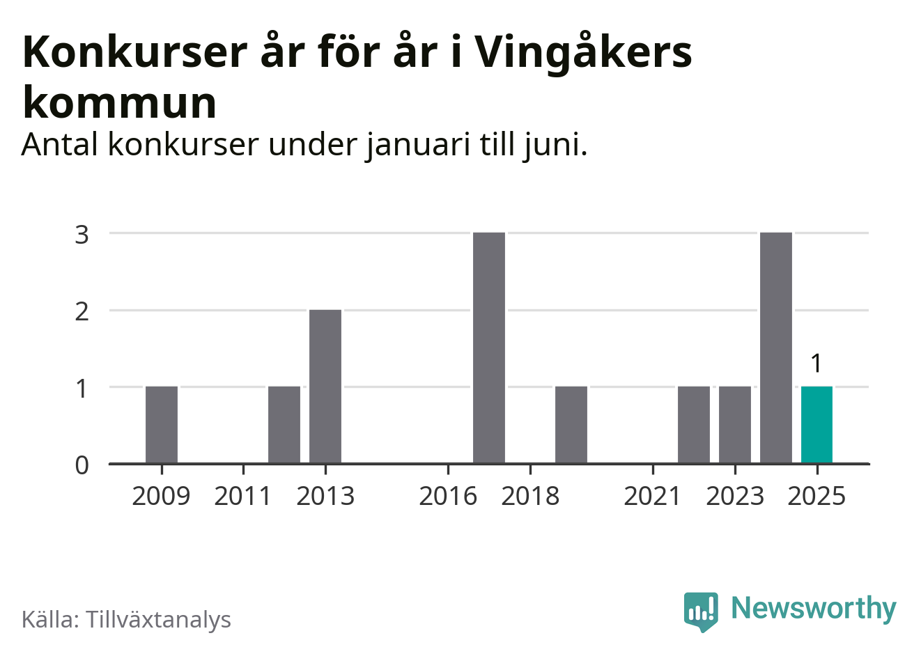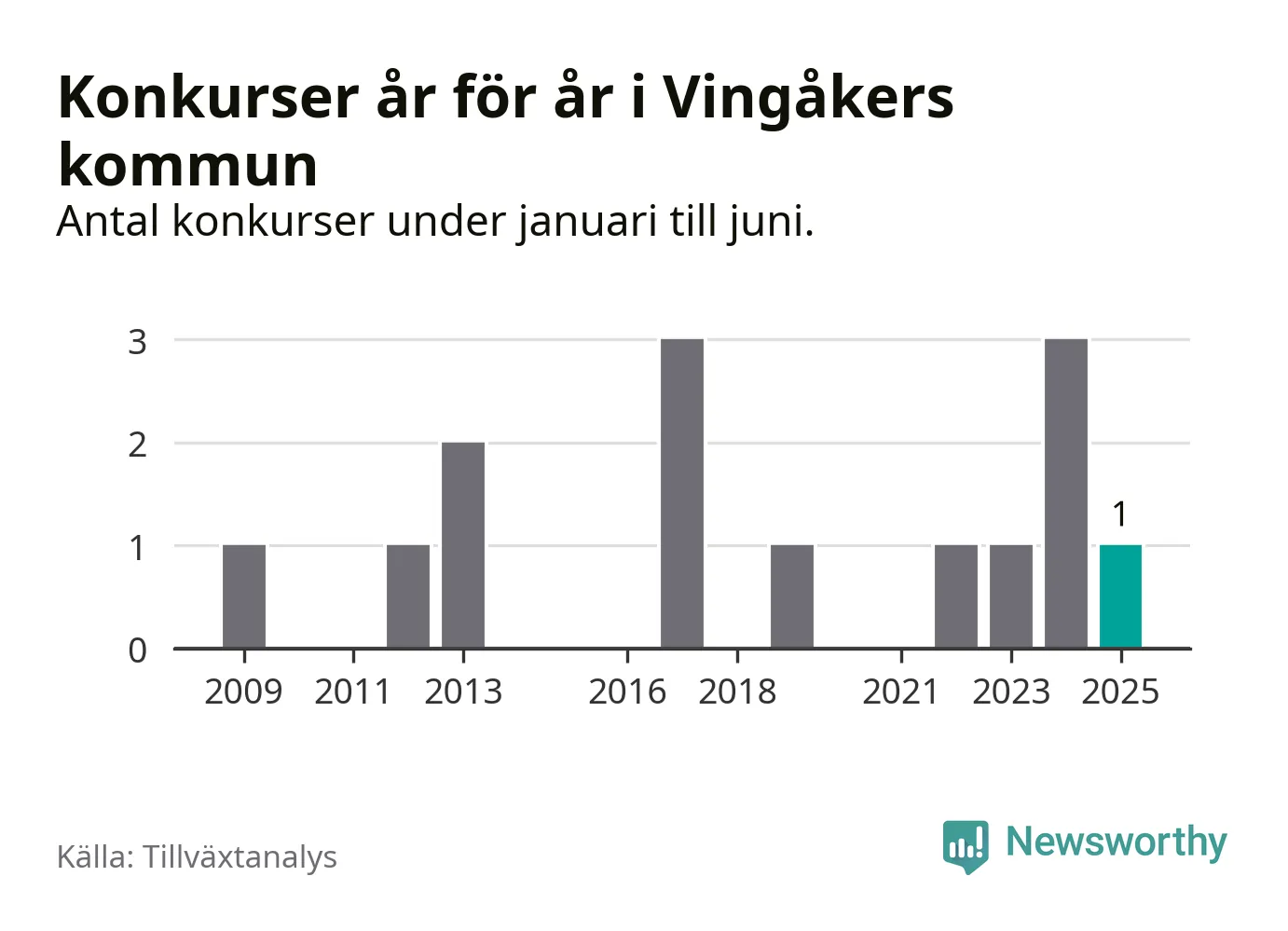 Mellan januari och juni har ett aktiebolag med arbetsställe i Vingåkers kommun gått i konkurs, enligt ny statistik från Tillväxtanalys.