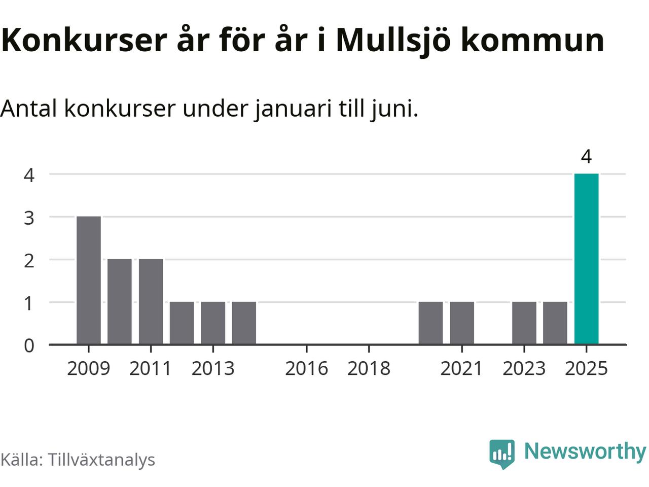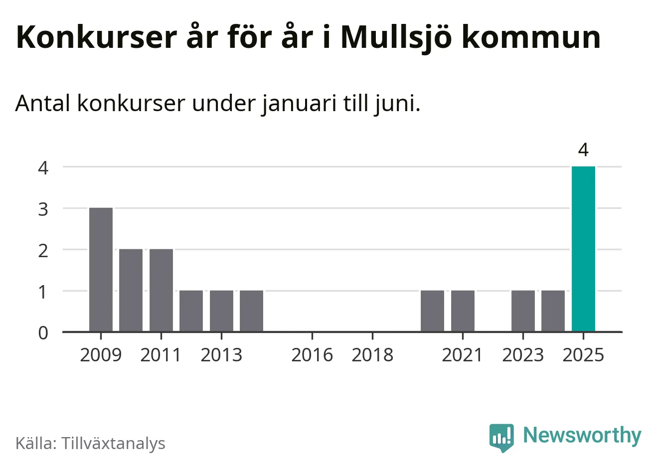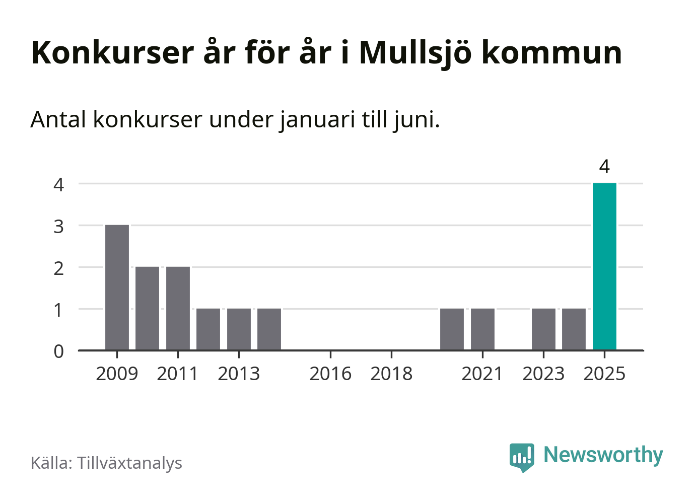 Mellan januari och juni har fyra aktiebolag med arbetsställe i Mullsjö kommun gått i konkurs, enligt ny statistik från Tillväxtanalys.