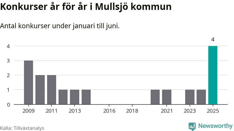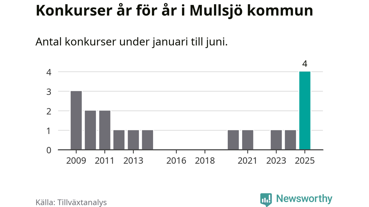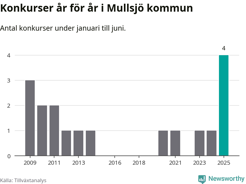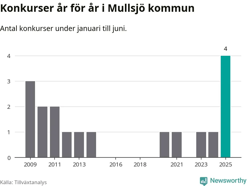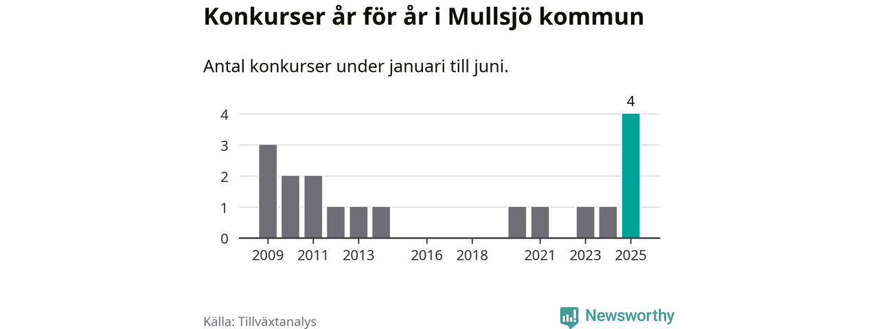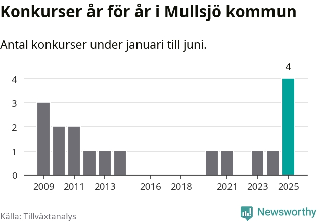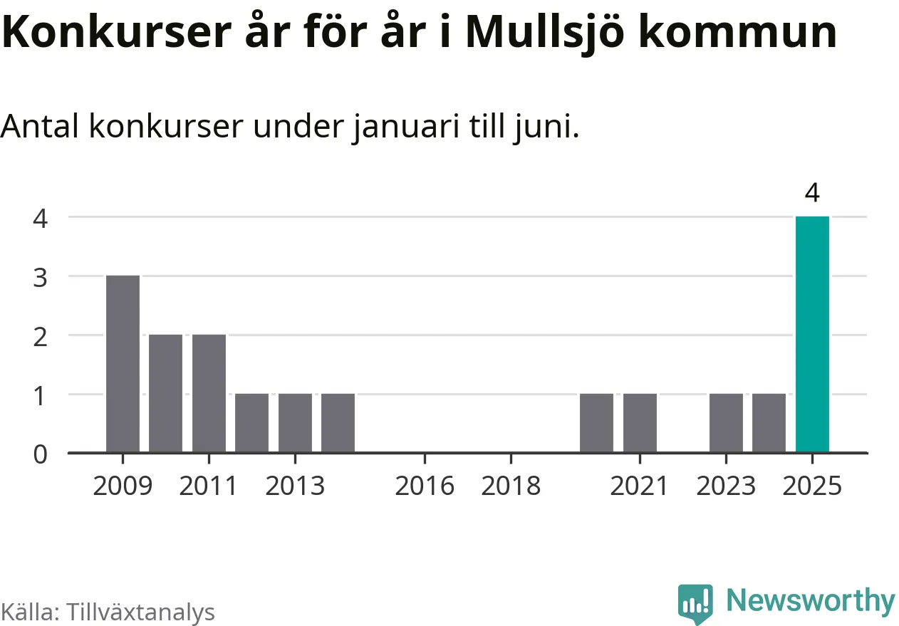 Mellan januari och juni har fyra aktiebolag med arbetsställe i Mullsjö kommun gått i konkurs, enligt ny statistik från Tillväxtanalys.